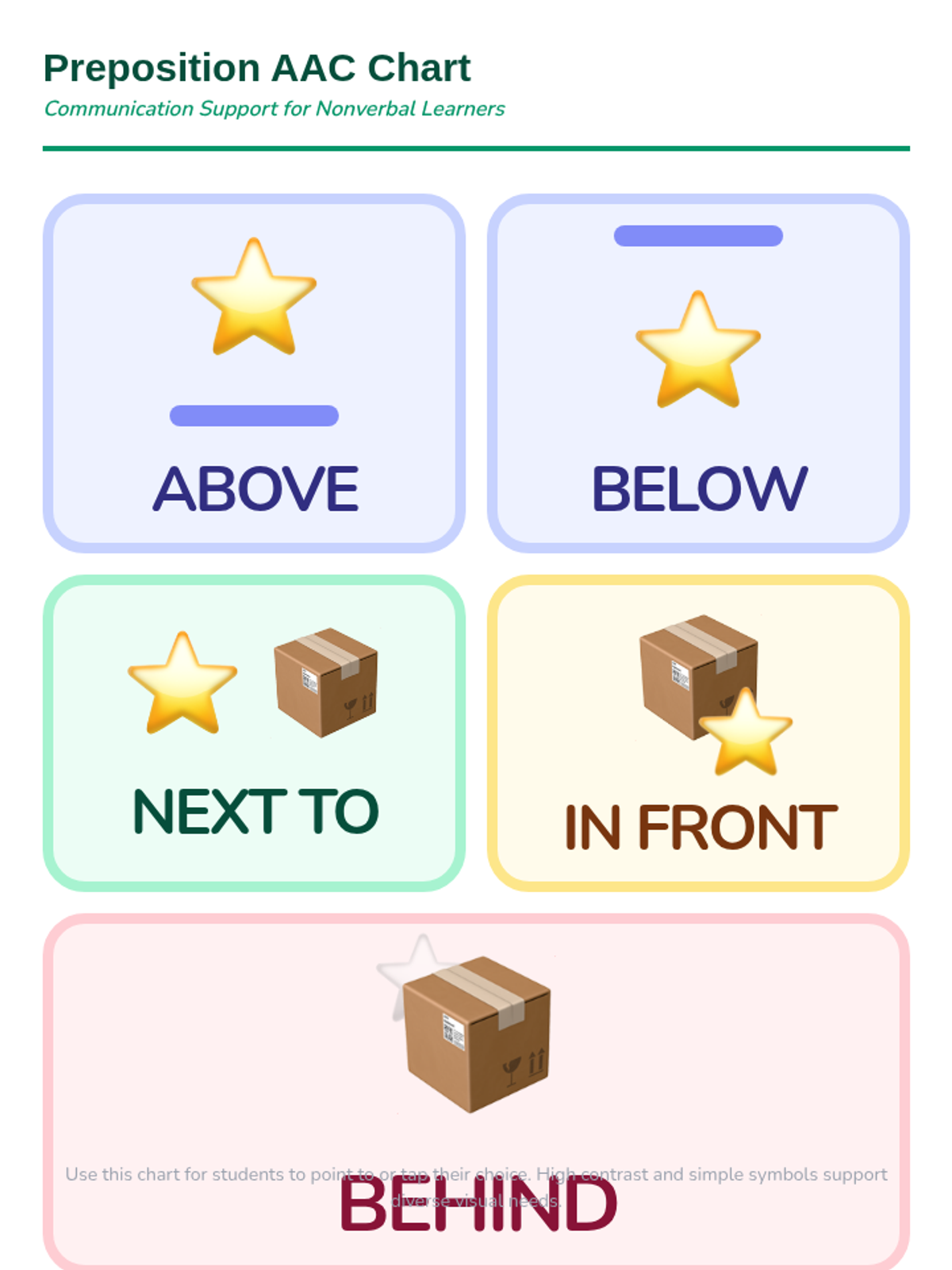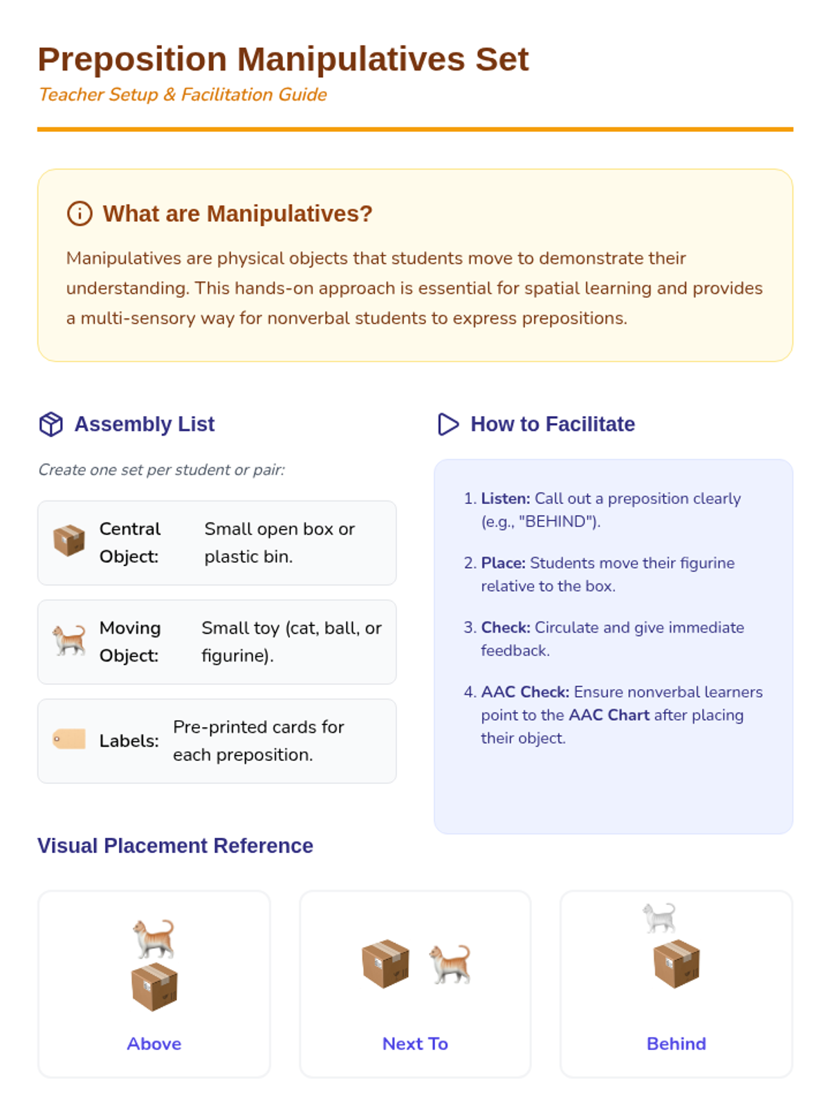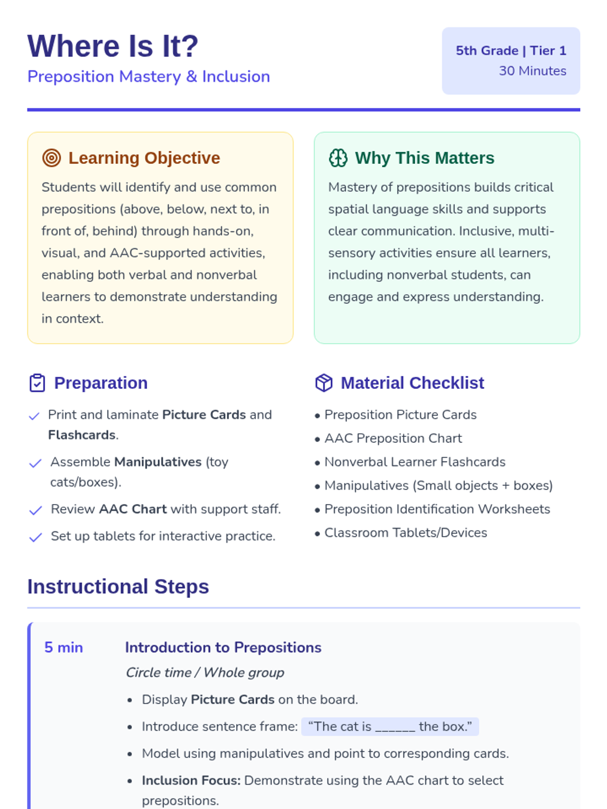 A 30-minute introductory lesson on prepositions designed for a diverse 5th-grade classroom, including multi-sensory activities and AAC supports for nonverbal learners.
