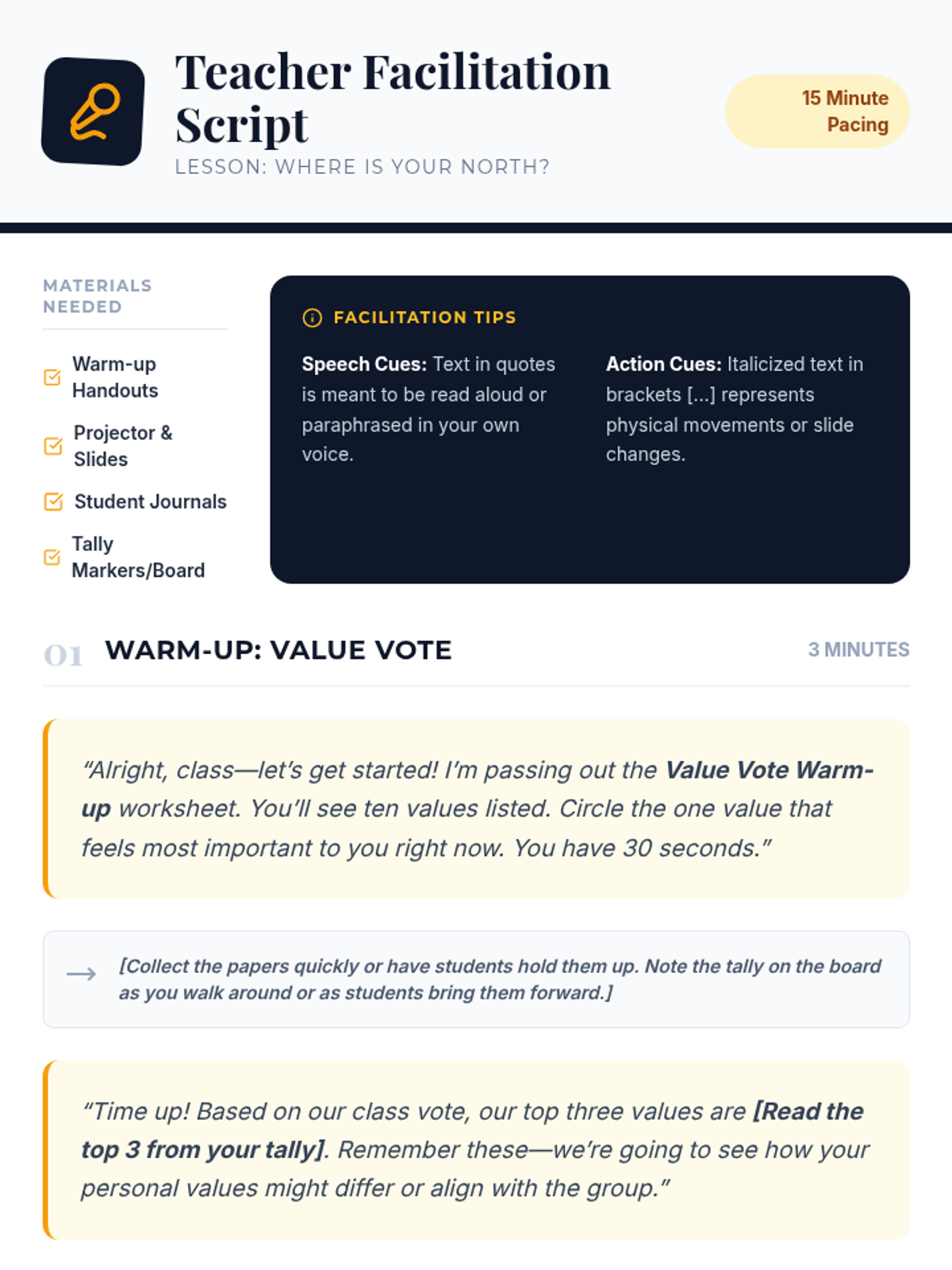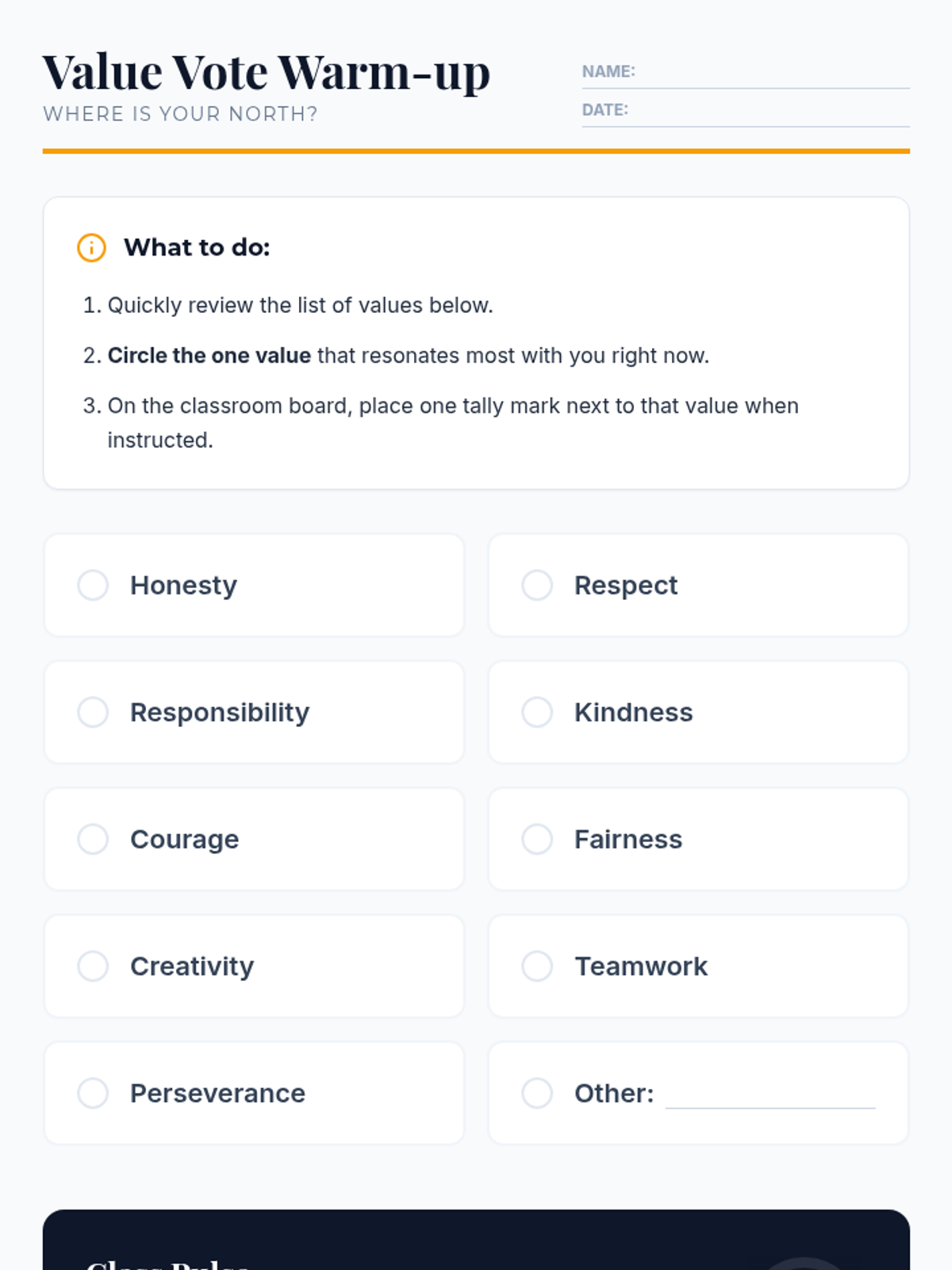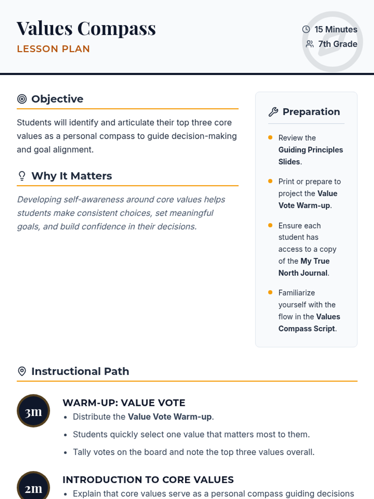 A 15-minute social-emotional learning lesson for 7th graders to identify core values and use them as a personal compass for decision-making.