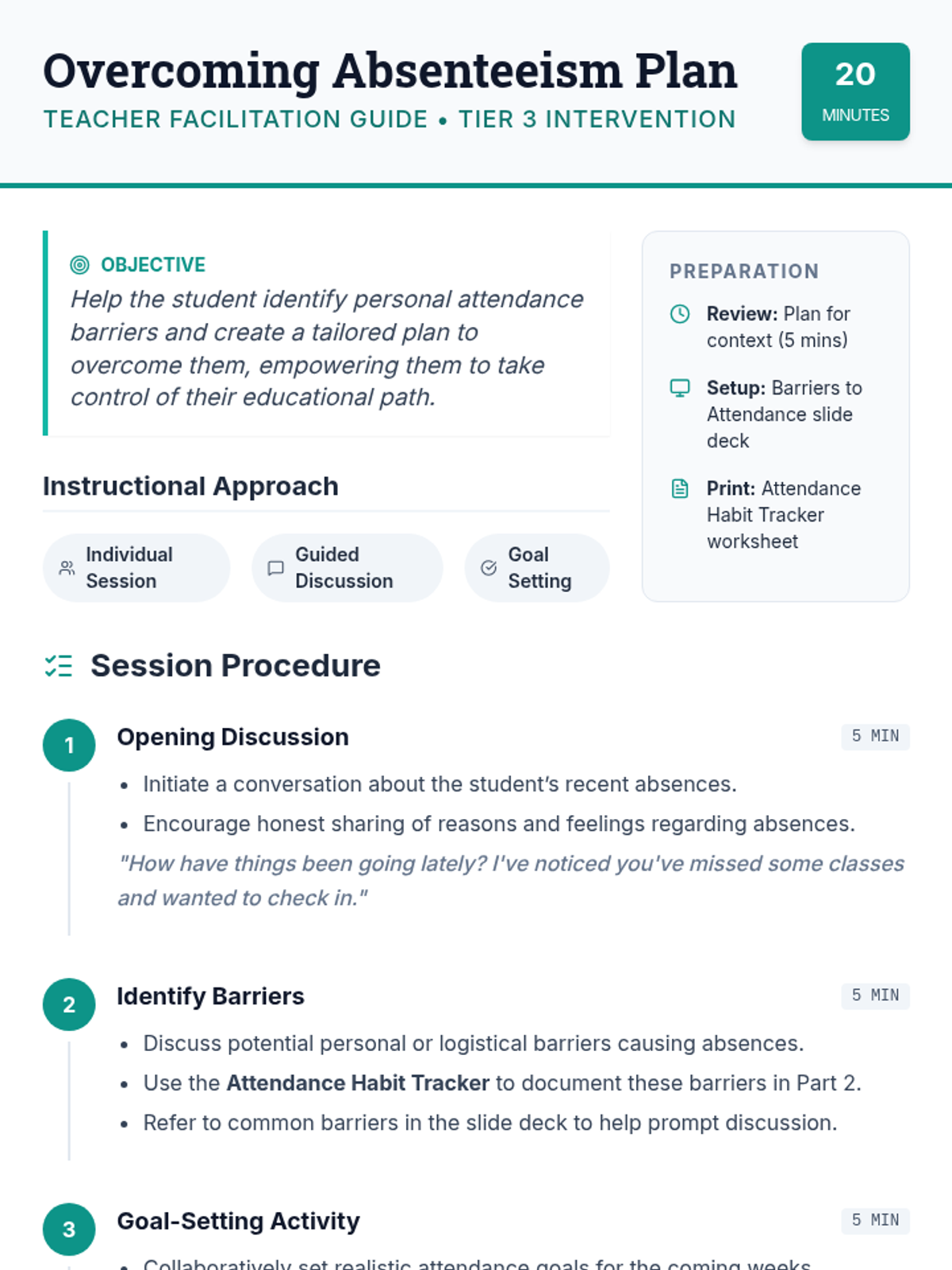 A 20-minute Tier 3 intervention for a 12th-grade student designed to identify personal barriers to attendance and create an actionable plan for improvement.
