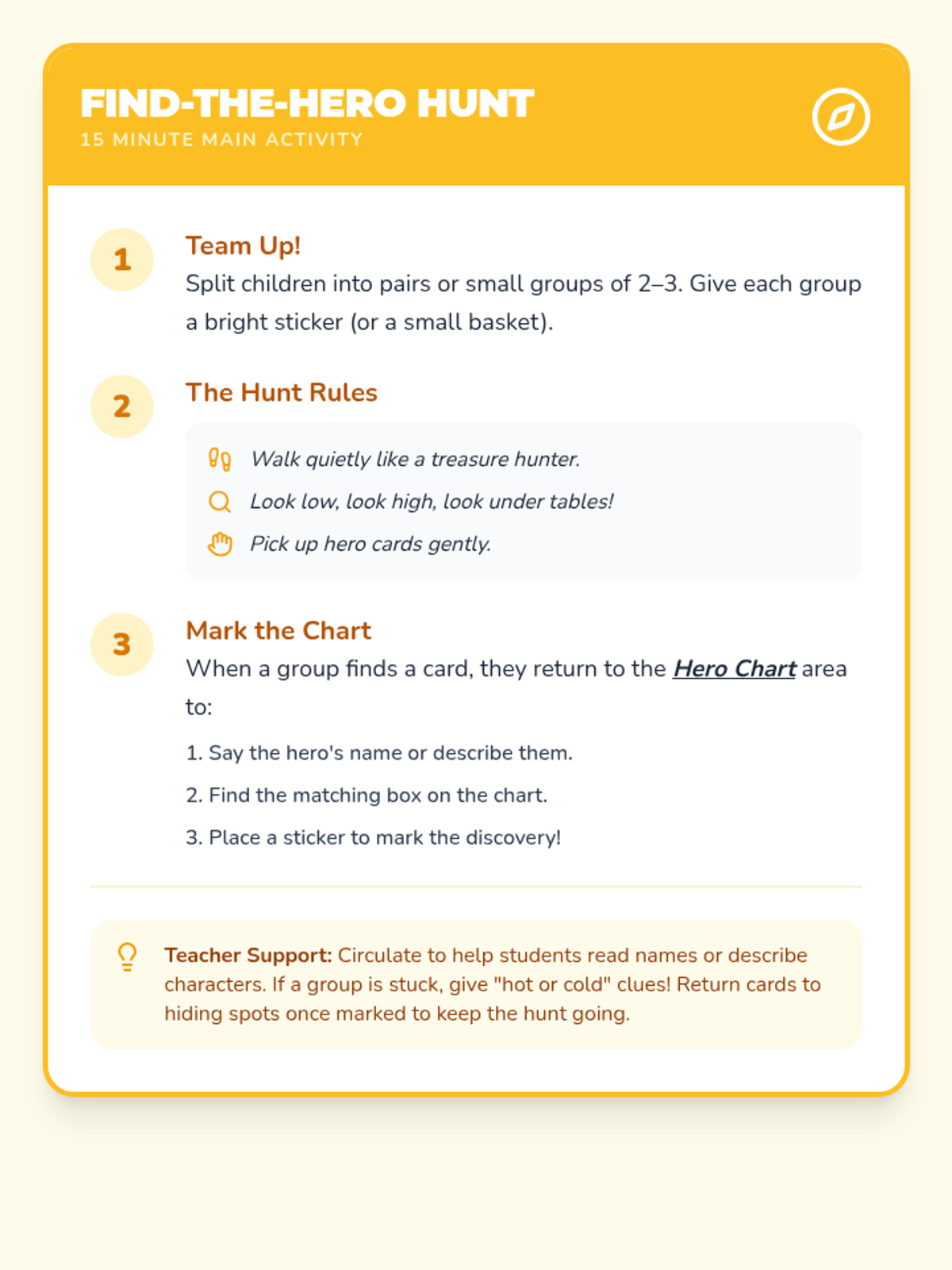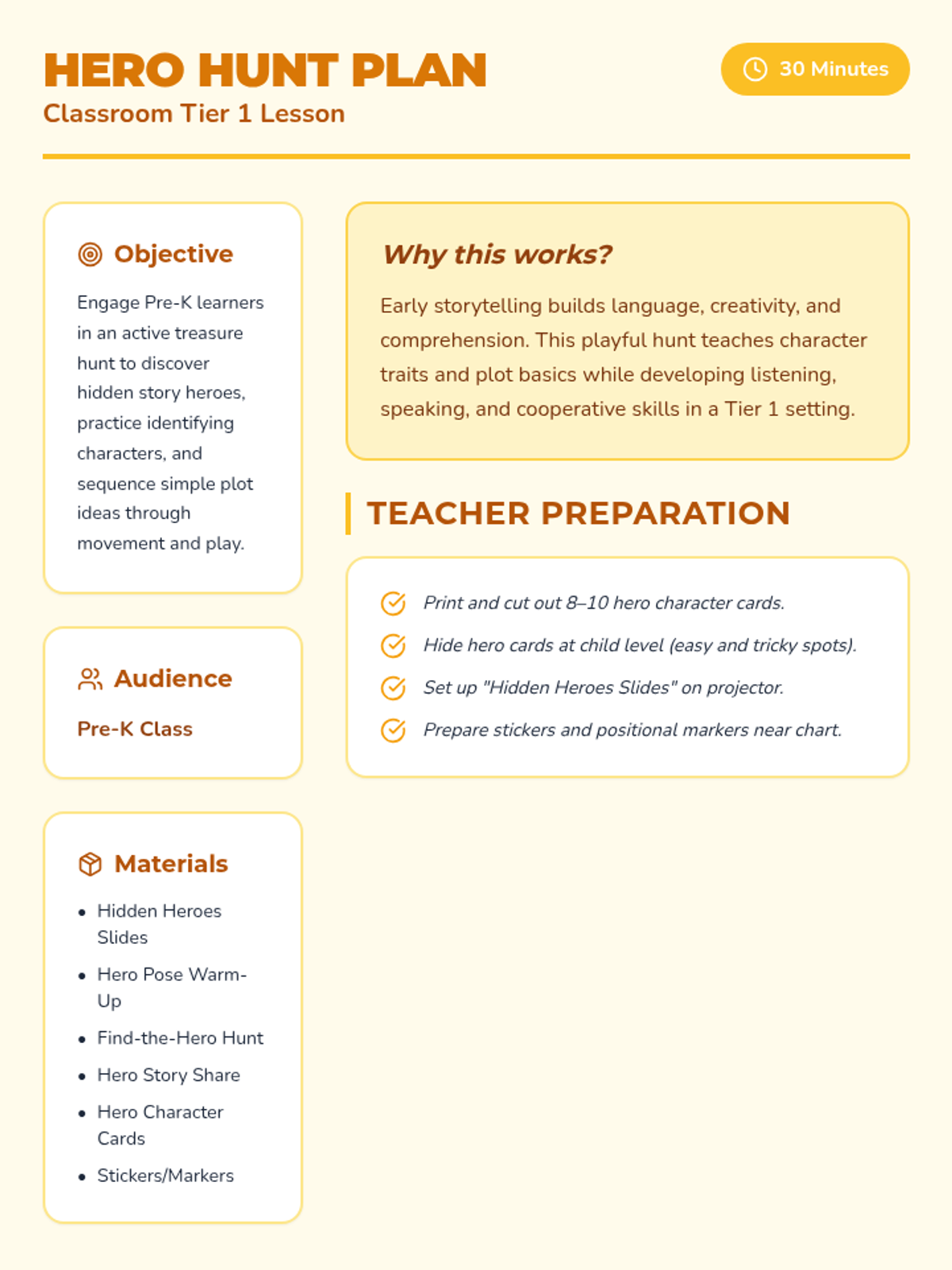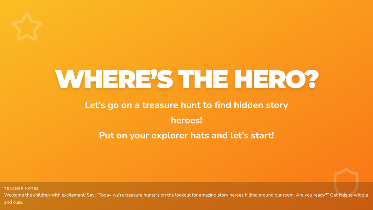 An imaginative class-wide treasure hunt for Pre-K students to discover and identify story heroes hidden around the room, teaching foundational plot and character basics. Students engage through movement, storytelling, and sharing to build creativity and narrative understanding.