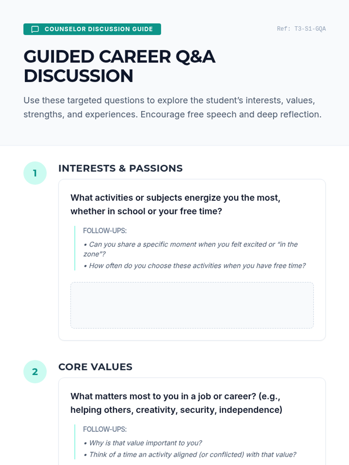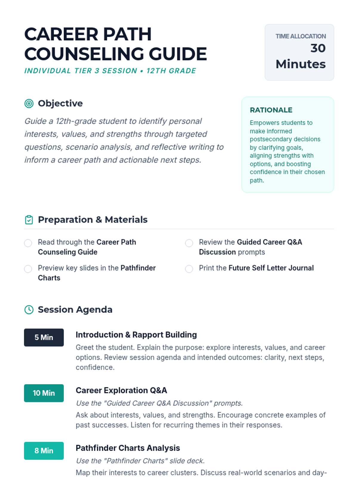 A personalized, one-on-one Tier 3 counseling session designed for 12th-grade students to navigate postsecondary options. This 30-minute guide uses reflective questioning, interest mapping, and future-self visualization to help students identify career clusters and actionable next steps.
