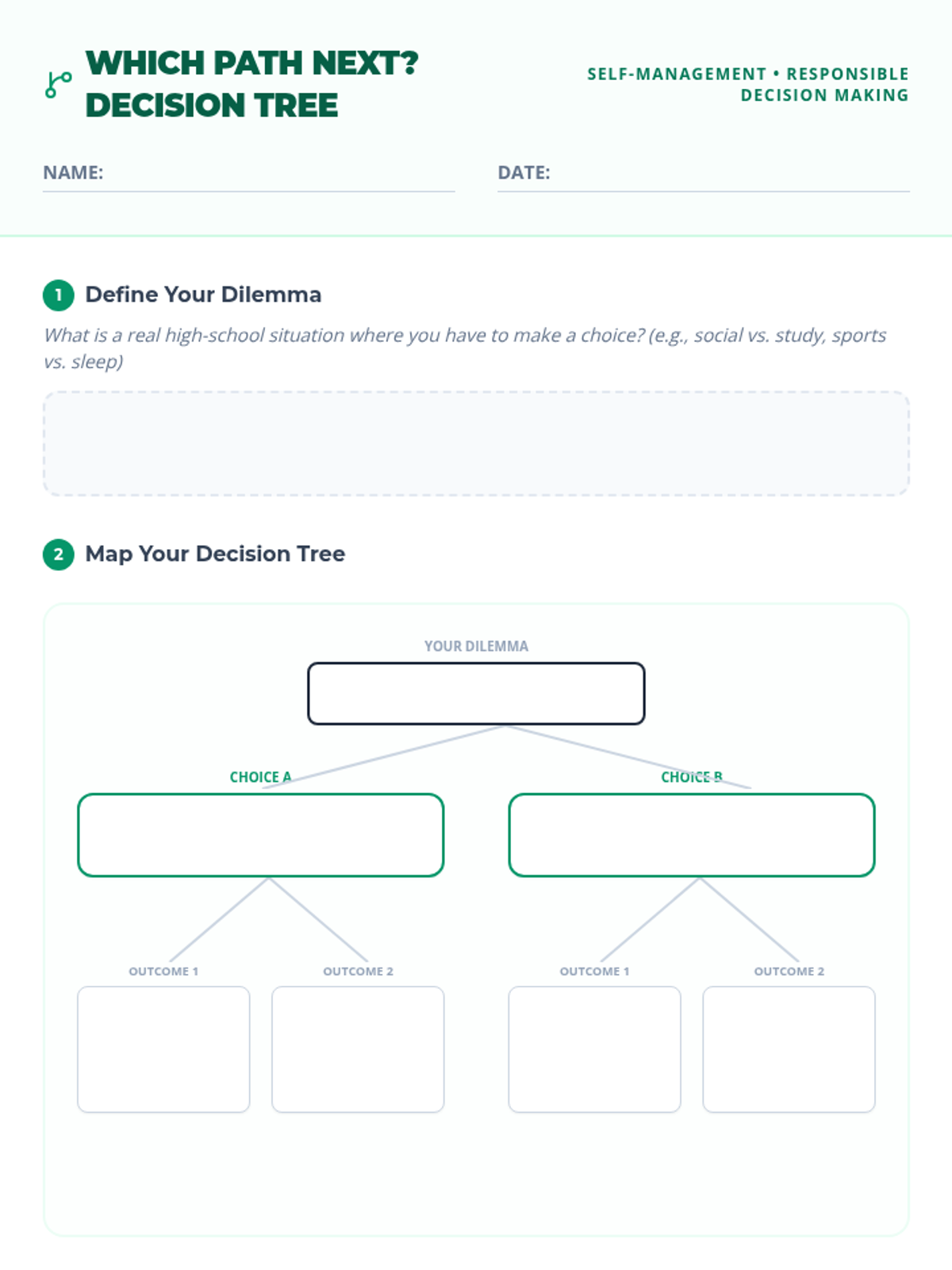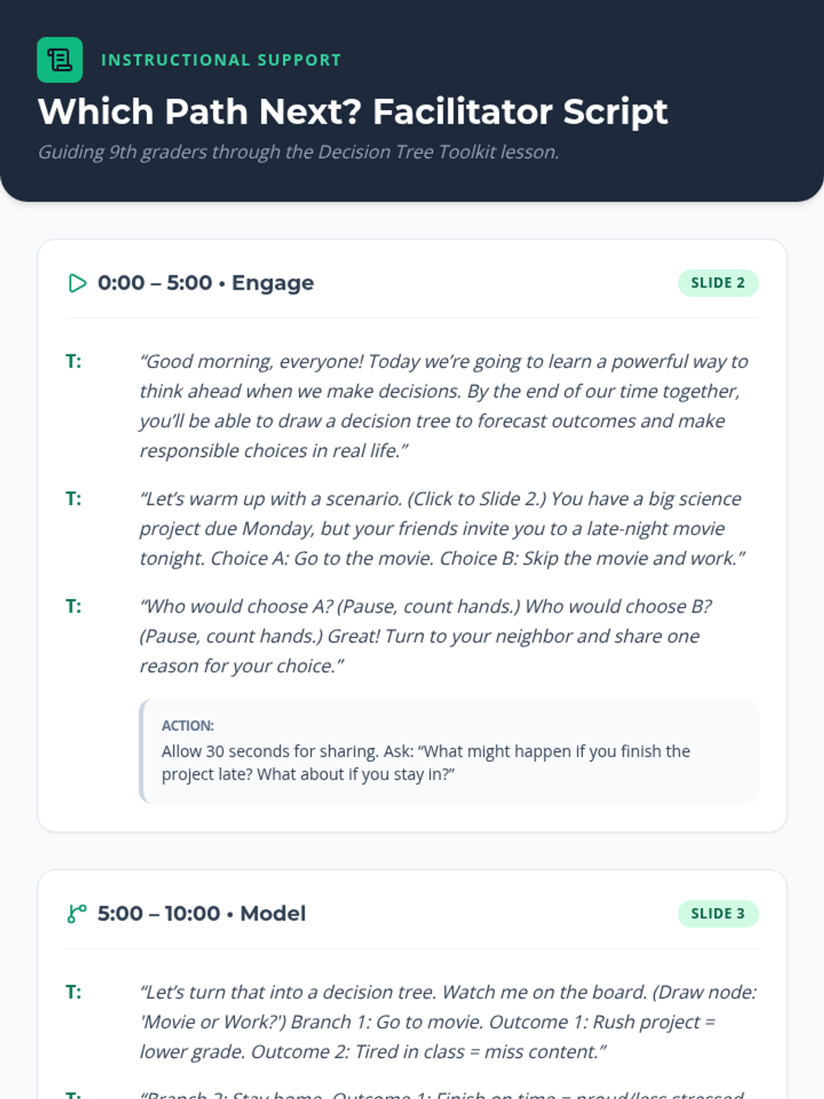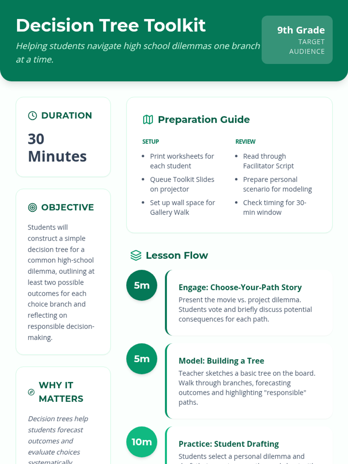 In this 30-minute 9th grade lesson, students learn to construct decision trees to tackle everyday dilemmas, forecasting outcomes and making responsible choices through hands-on drafting and peer feedback.