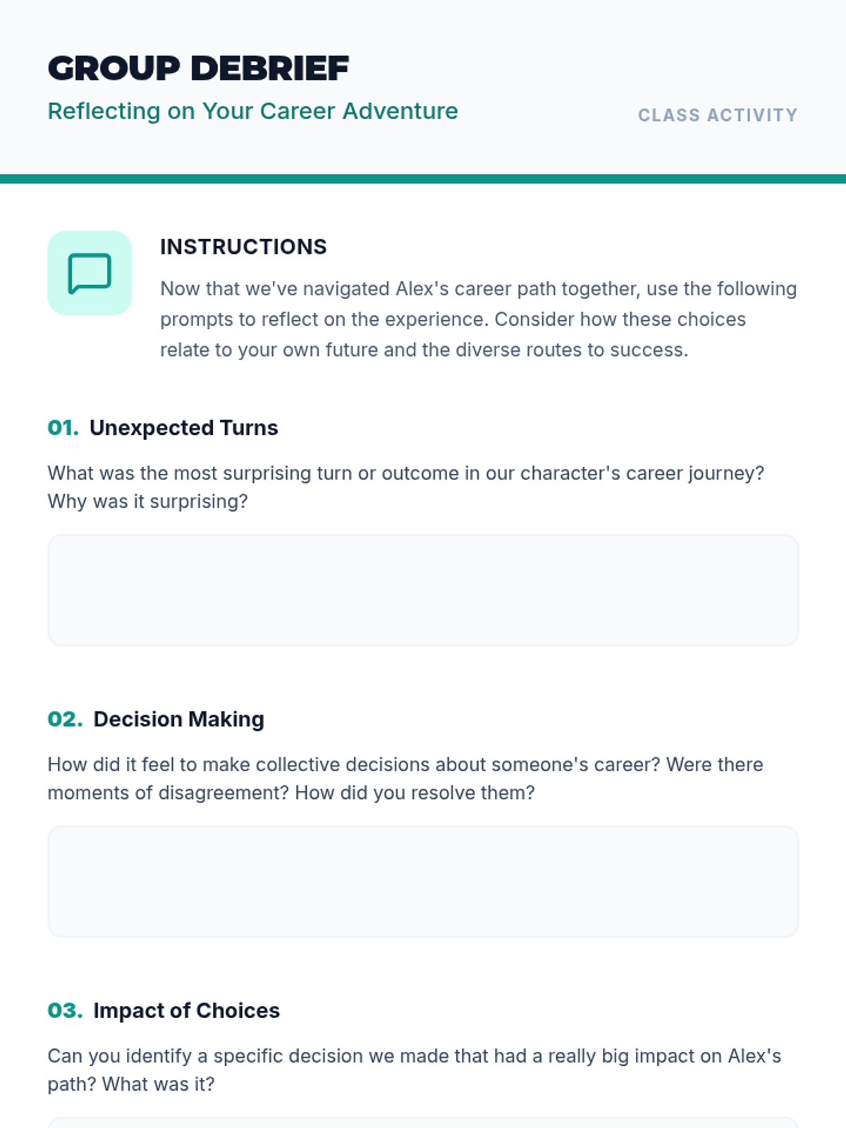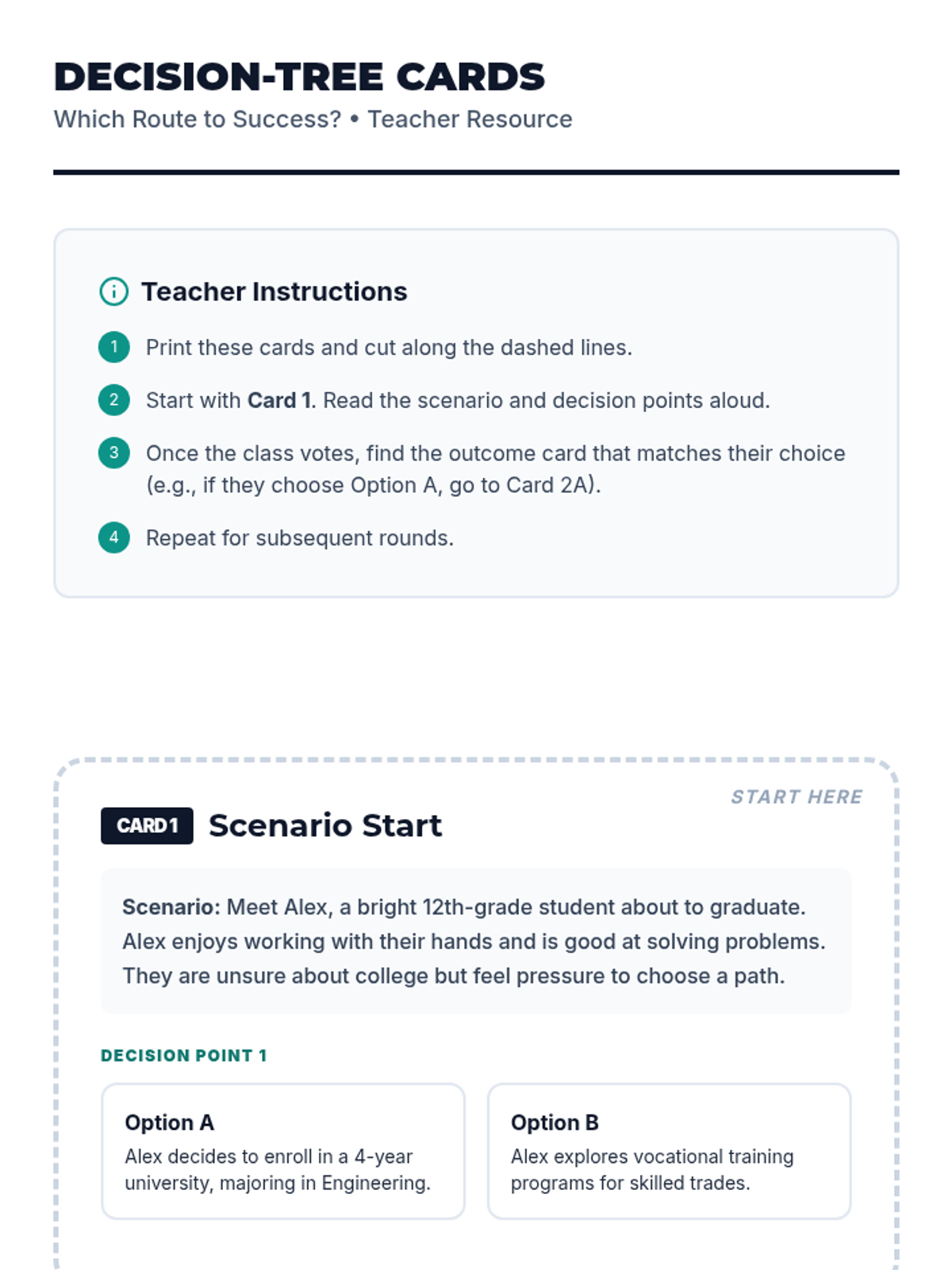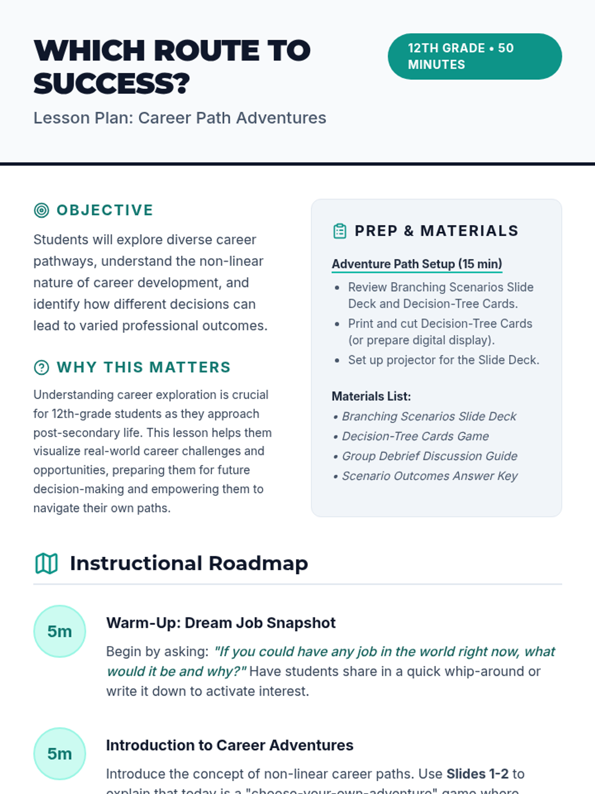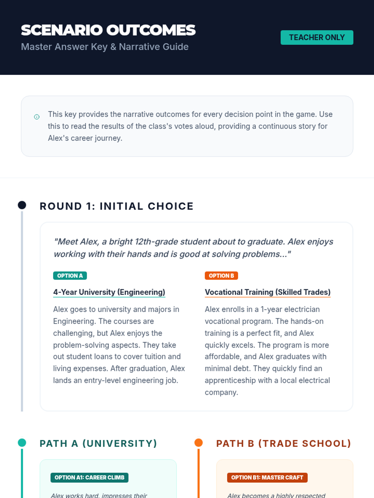 A 50-minute whole-class decision-path game where 12th-grade students navigate branching career scenarios to understand the non-linear nature of professional development and the impact of their choices.