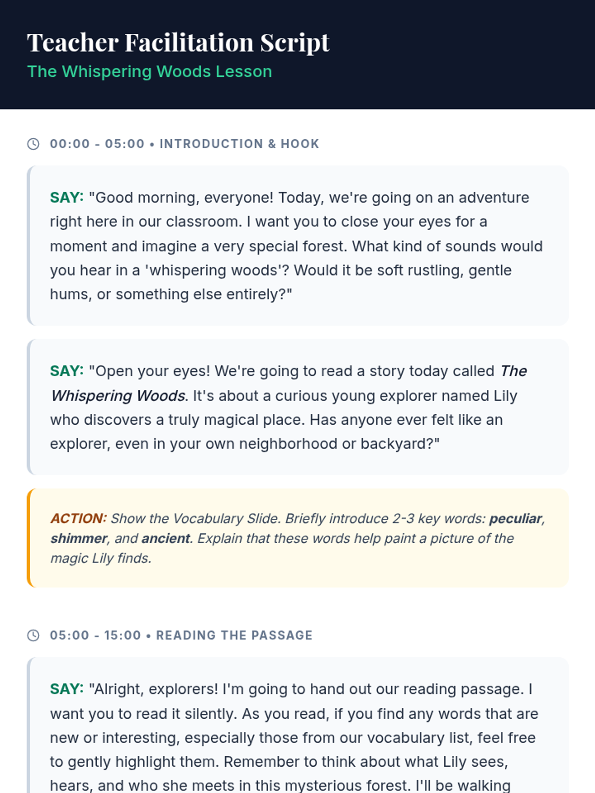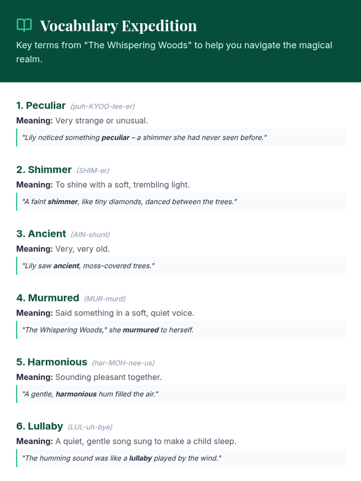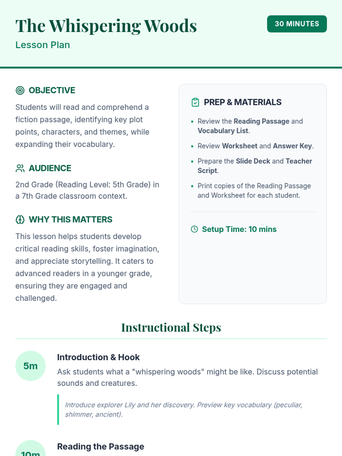 A 30-minute immersive literacy lesson for advanced 2nd-grade readers (5th-grade level) that explores a magical forest through reading, vocabulary building, and creative comprehension.