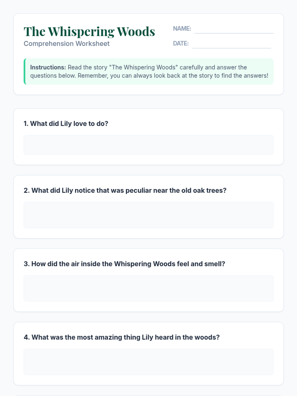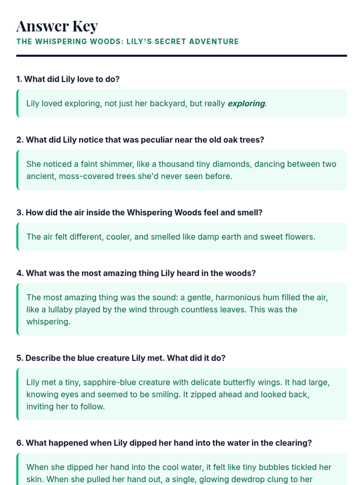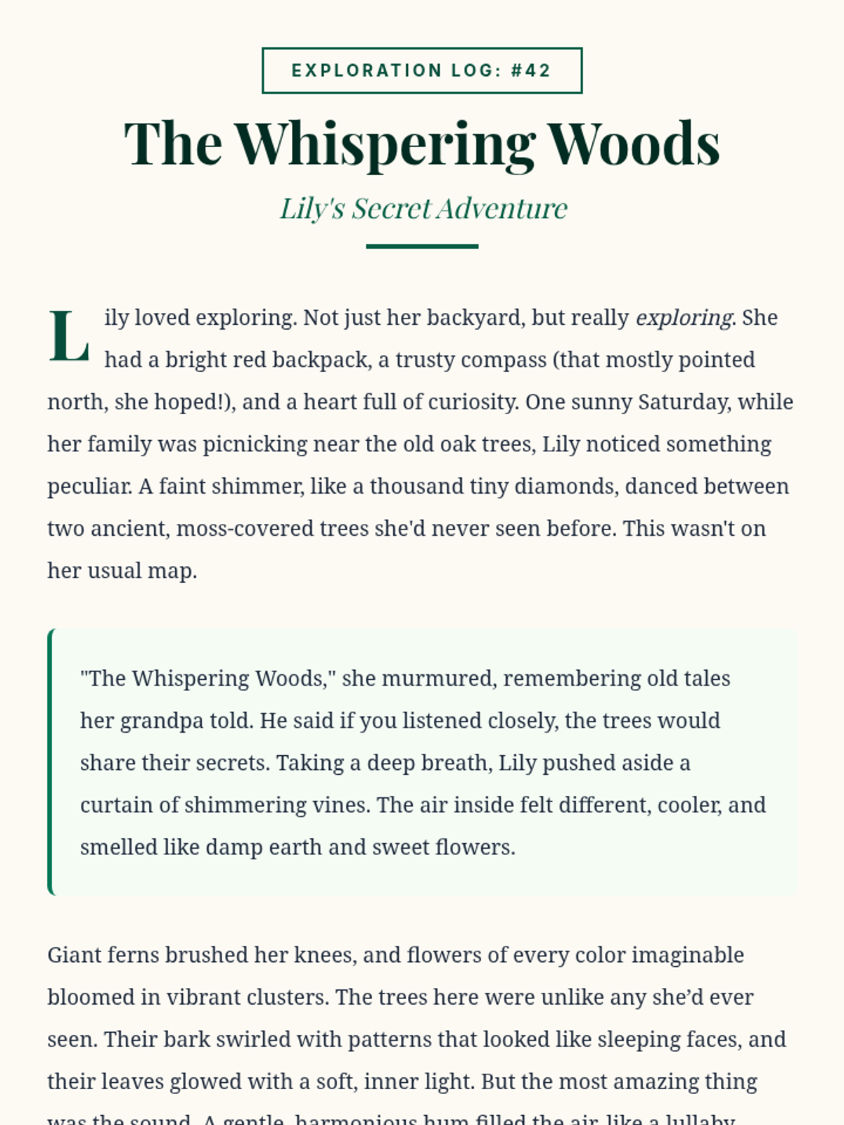 A 30-minute immersive literacy lesson for advanced 2nd-grade readers (5th-grade level) that explores a magical forest through reading, vocabulary building, and creative comprehension.