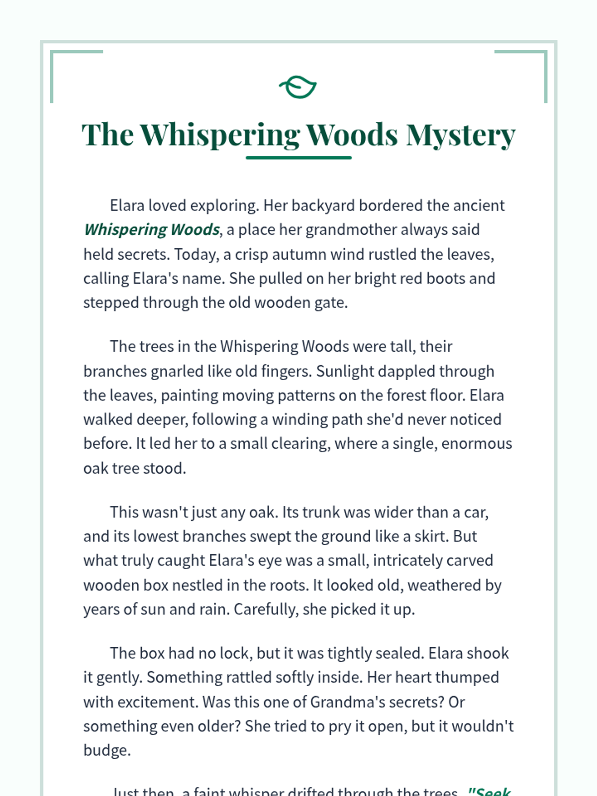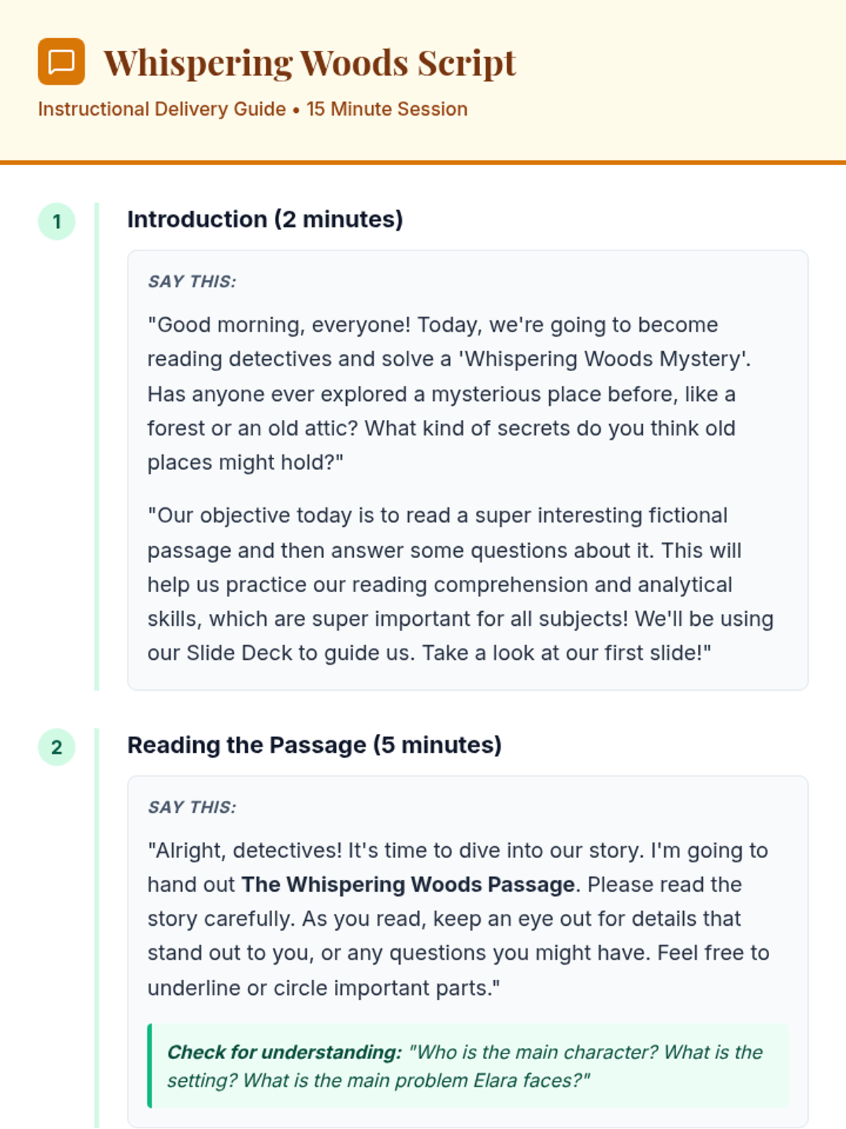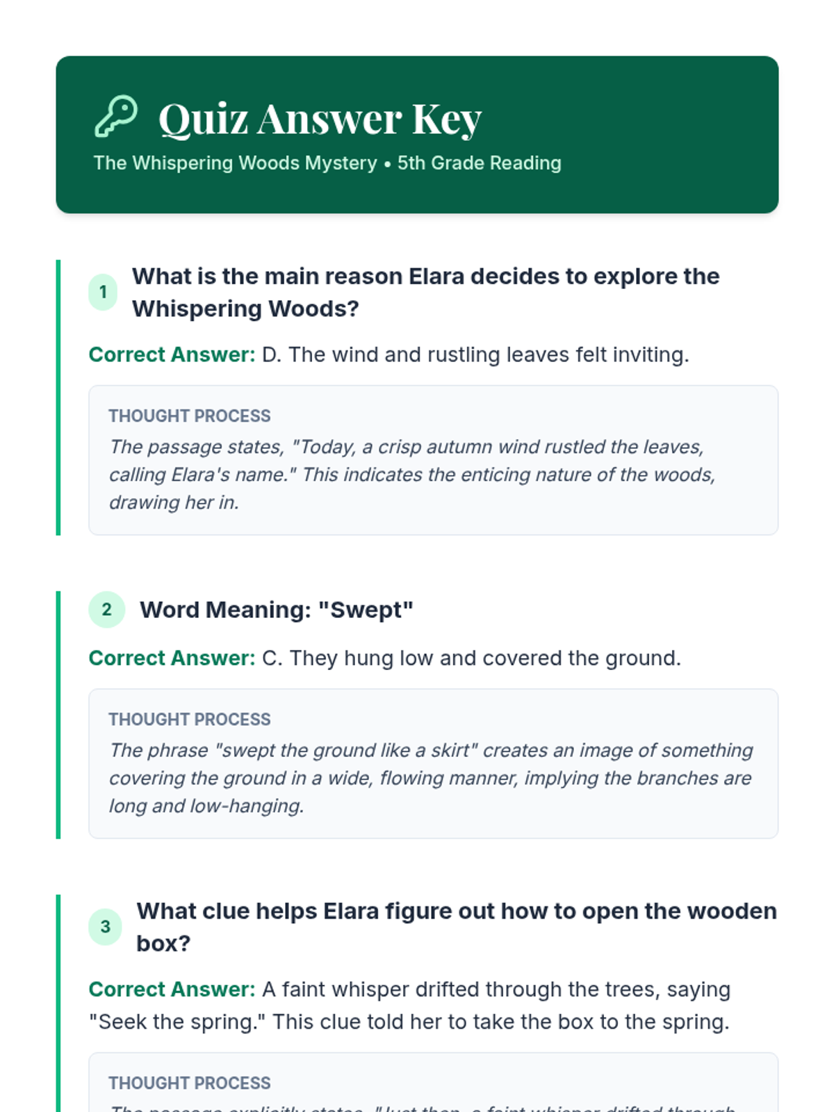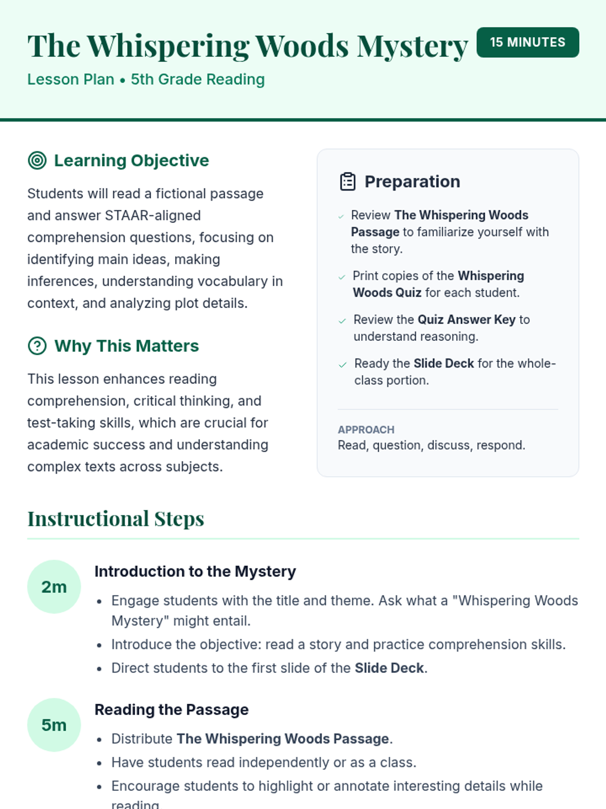 A 5th-grade reading comprehension lesson focused on a fictional mystery in an ancient forest, featuring a STAAR-aligned quiz to practice analytical skills.