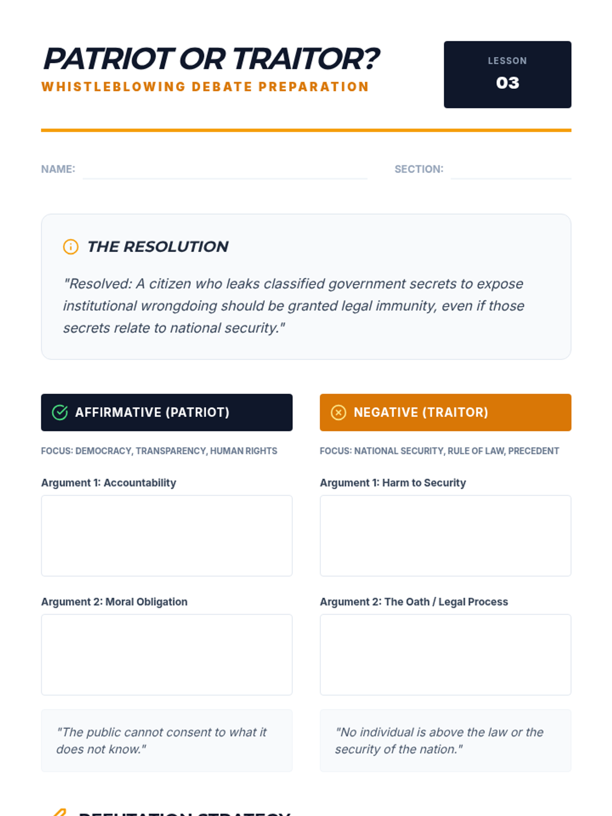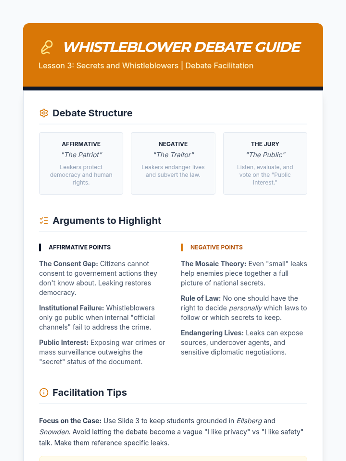A debate-focused lesson on the conflict between national security and the public's right to know, featuring cases like the Pentagon Papers and Edward Snowden.