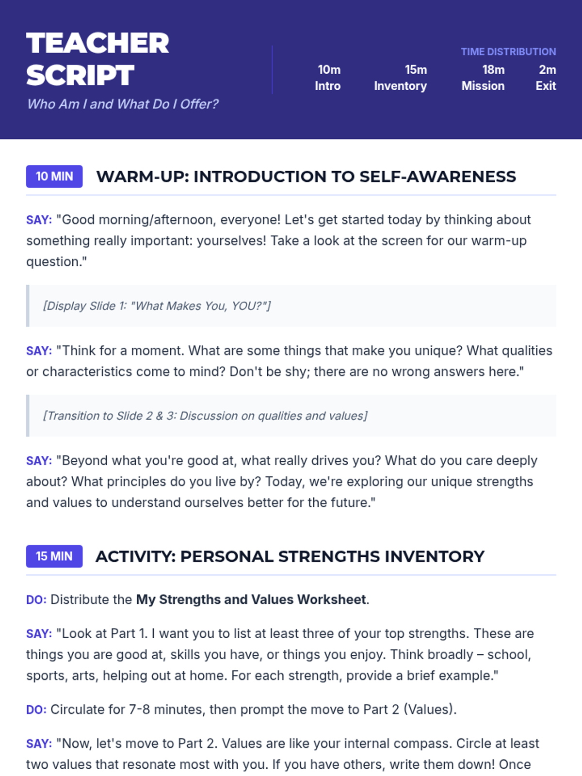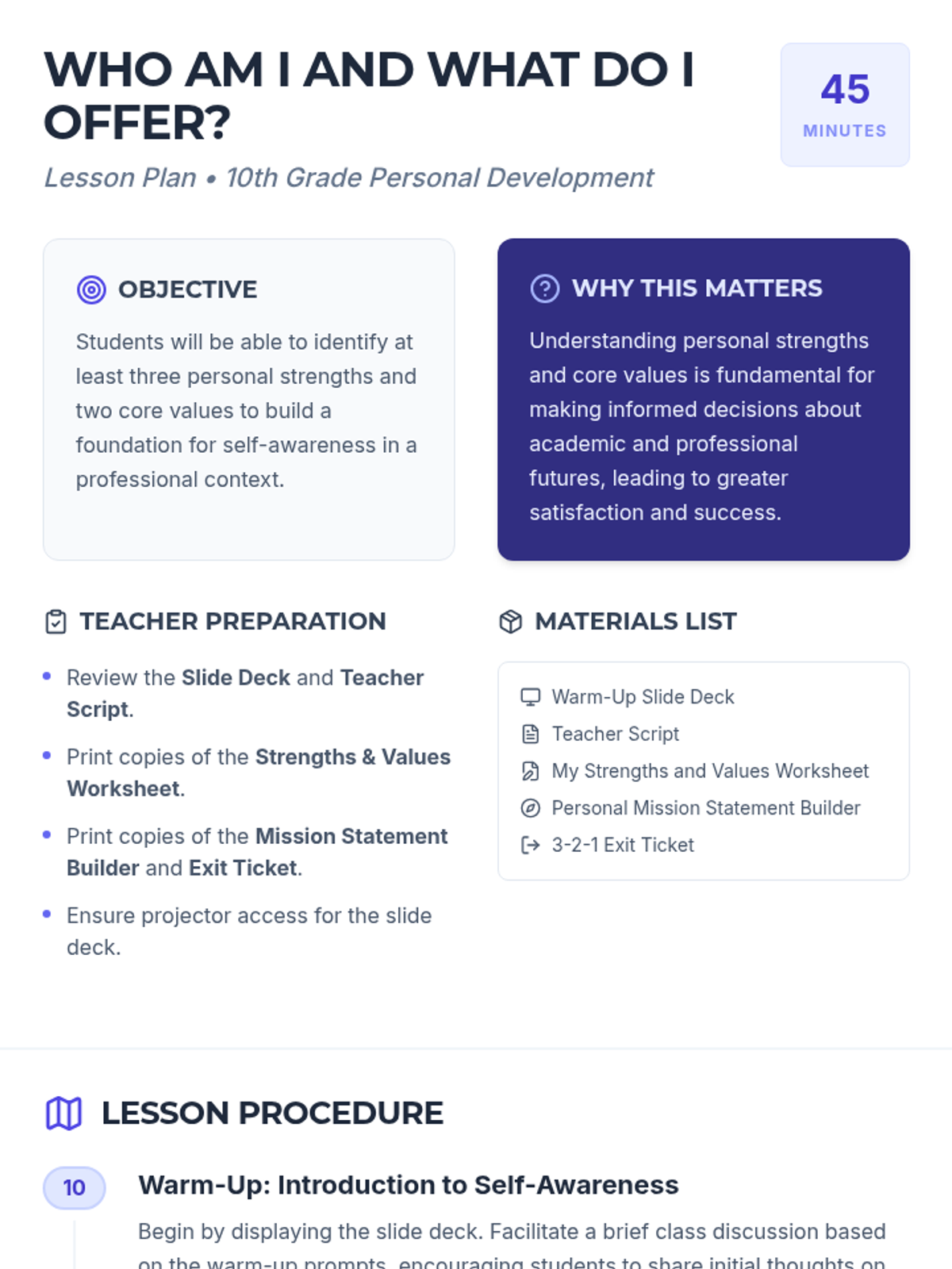 This 45-minute lesson for 10th-grade students facilitates self-discovery by helping them identify their unique strengths and core values. Students will use these insights to draft a personal mission statement, building a foundation for self-awareness in both personal and professional contexts.
