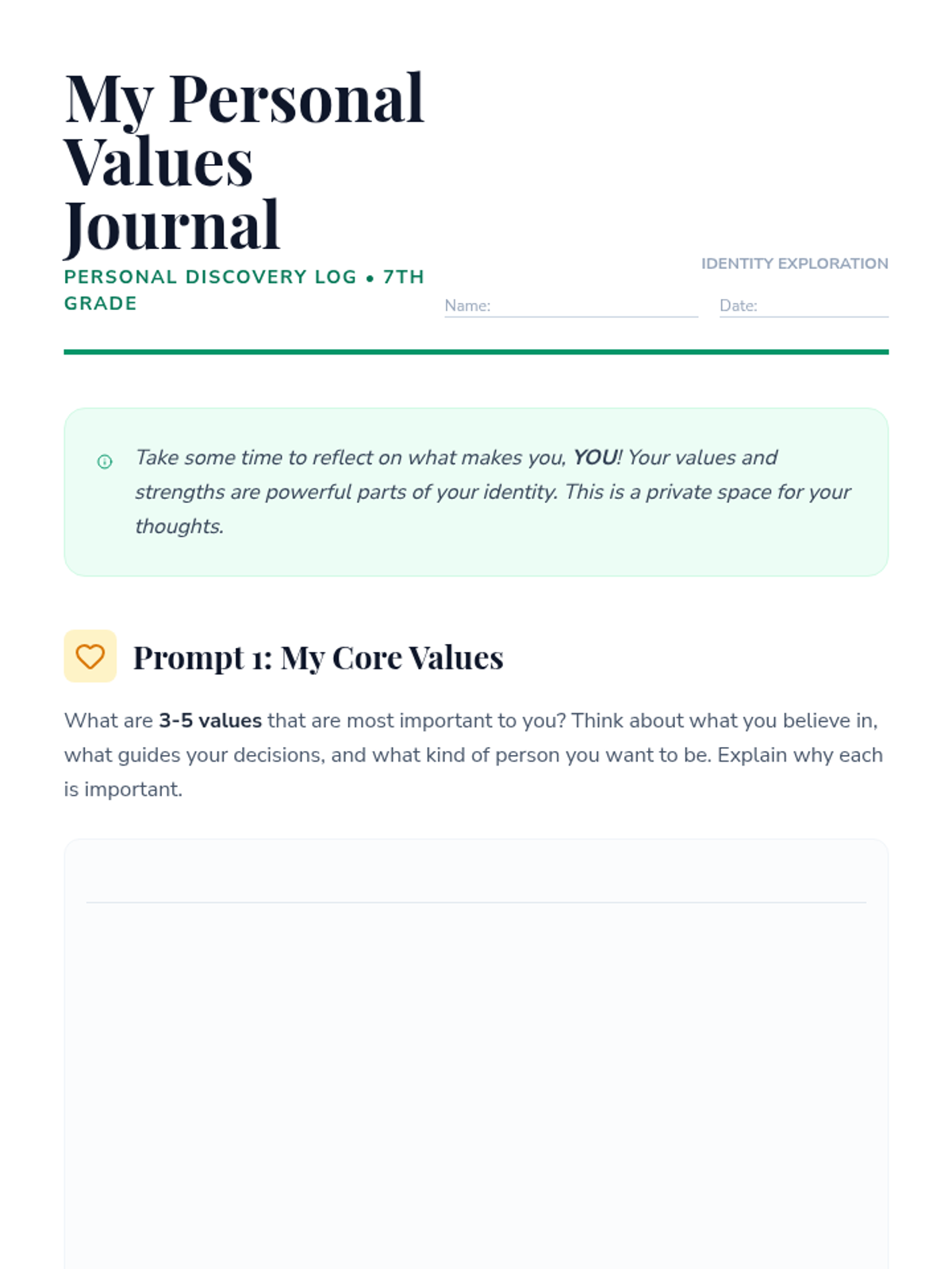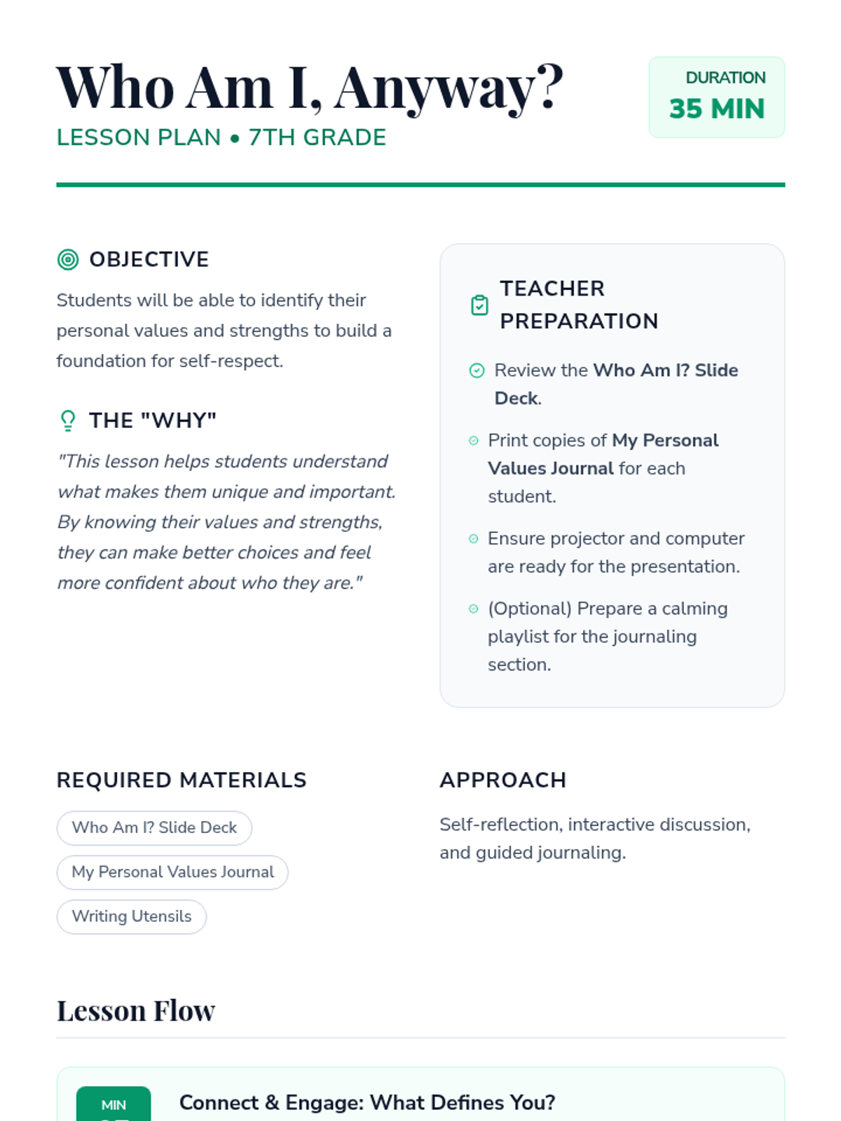 A 35-minute self-discovery lesson for 7th-grade students to explore personal values and strengths, building a foundation for self-respect and confident decision-making.
