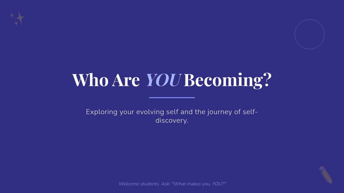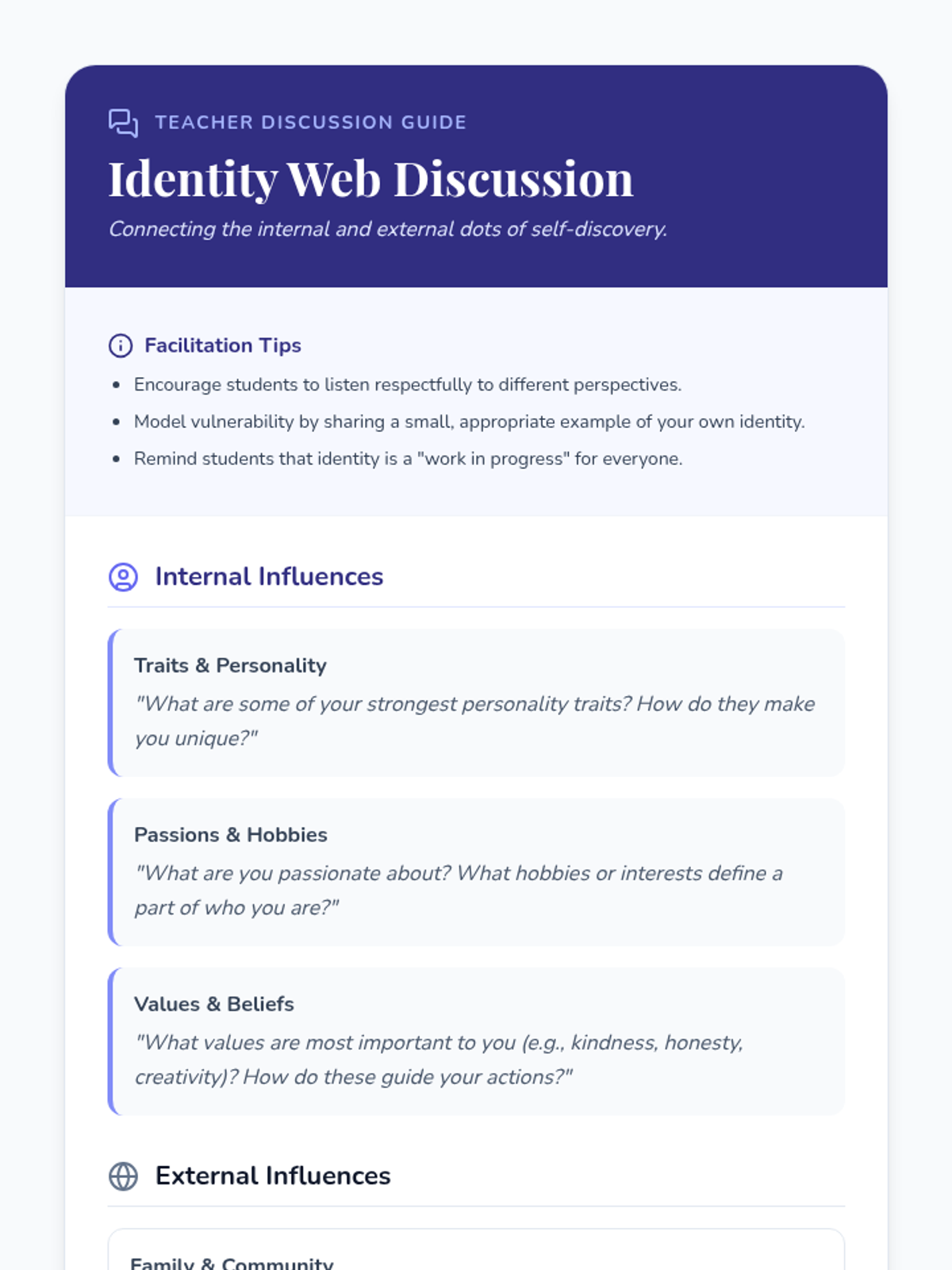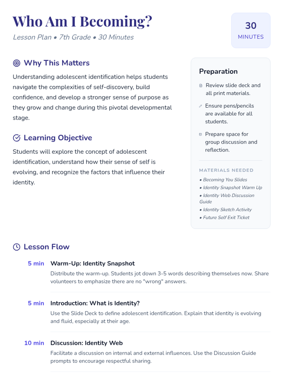 A 30-minute session for 7th graders to explore adolescent identity formation, internal and external influences, and their evolving sense of self.