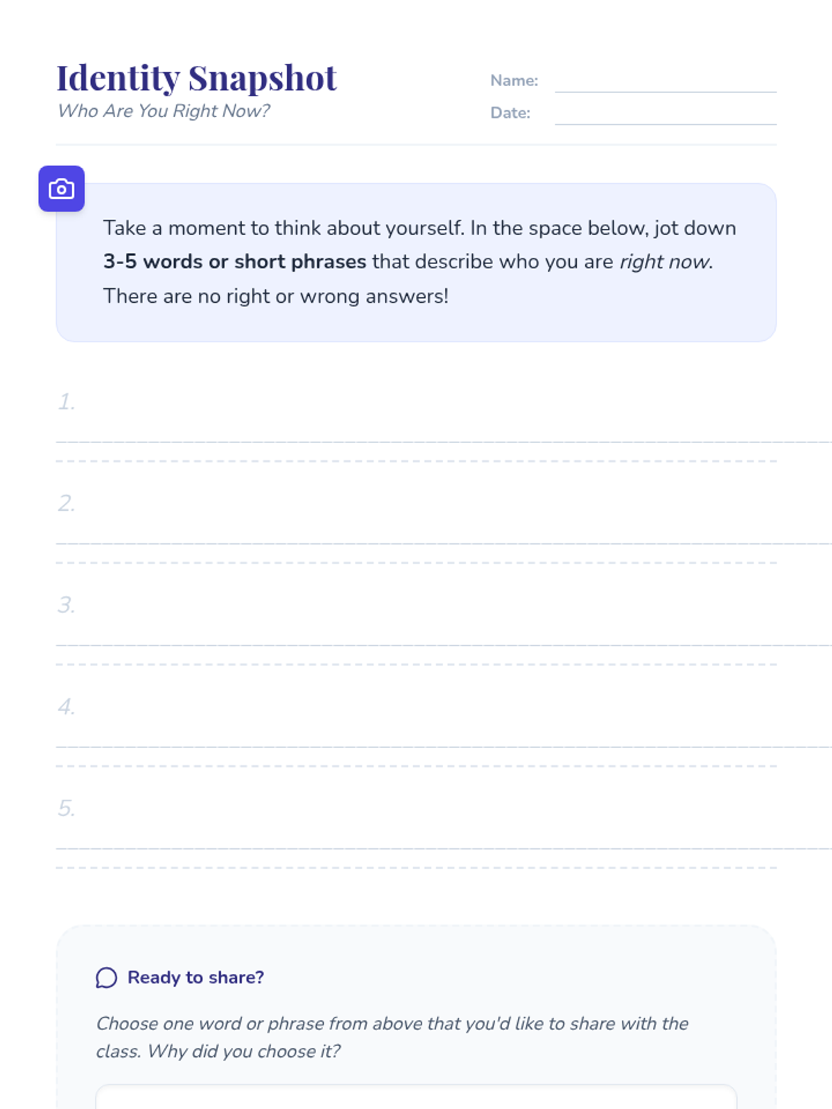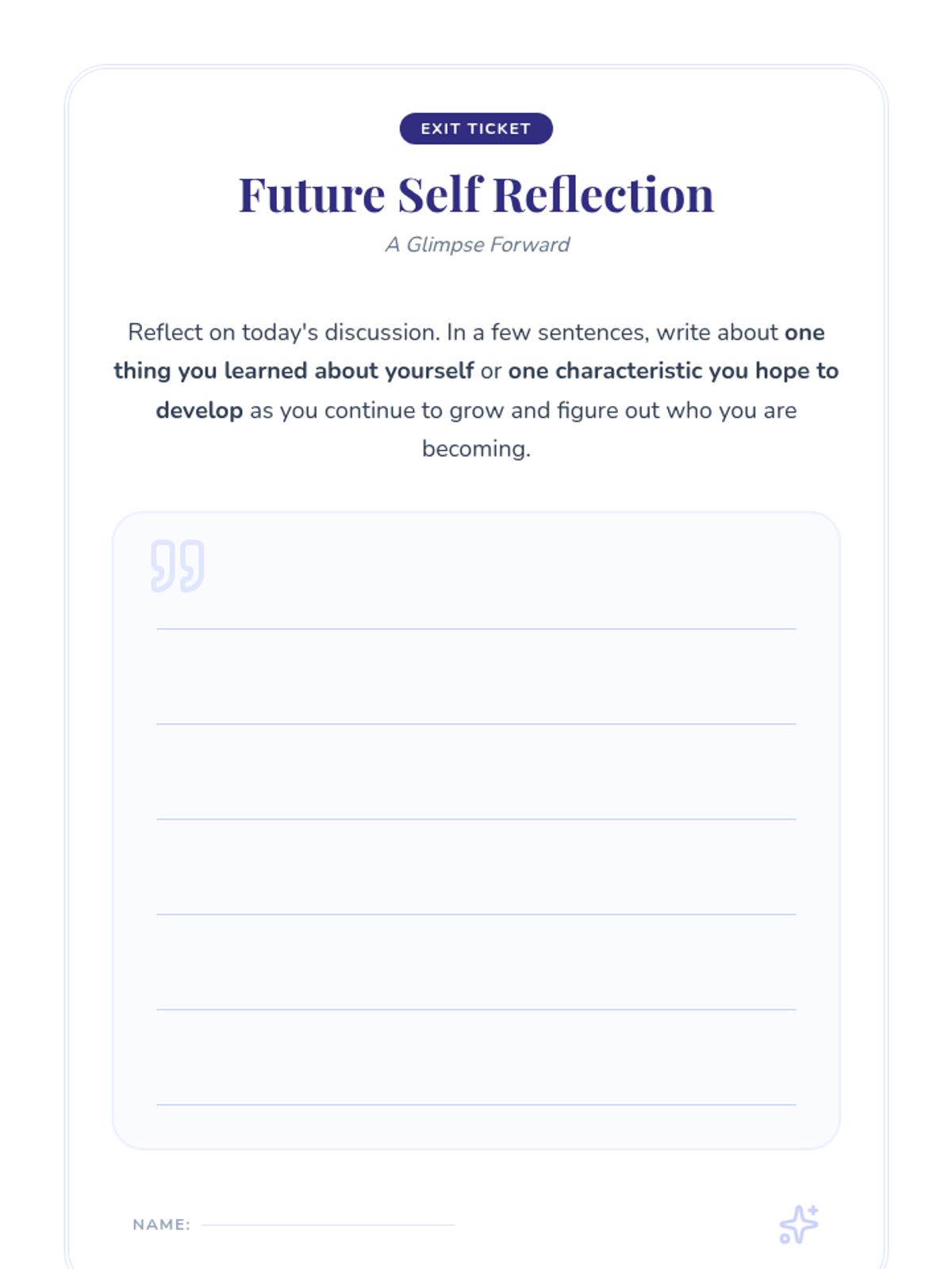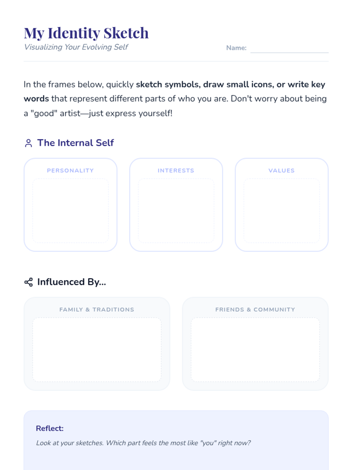 A 30-minute session for 7th graders to explore adolescent identity formation, internal and external influences, and their evolving sense of self.