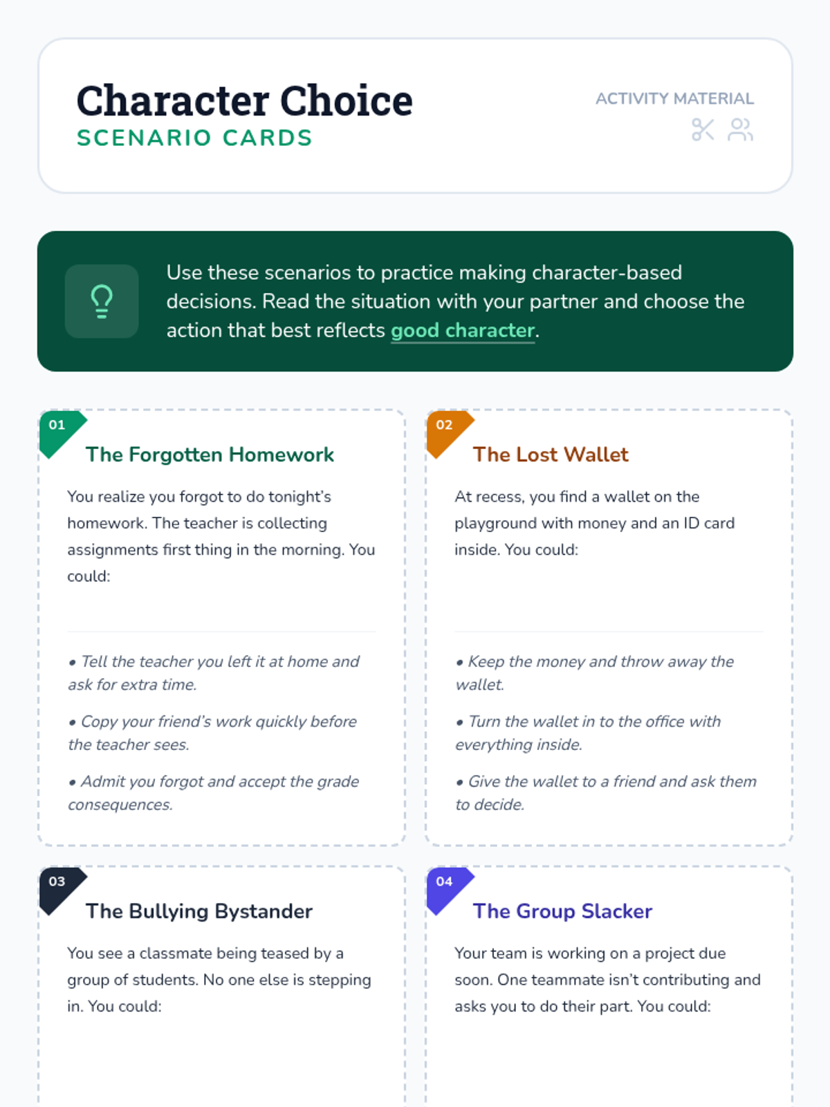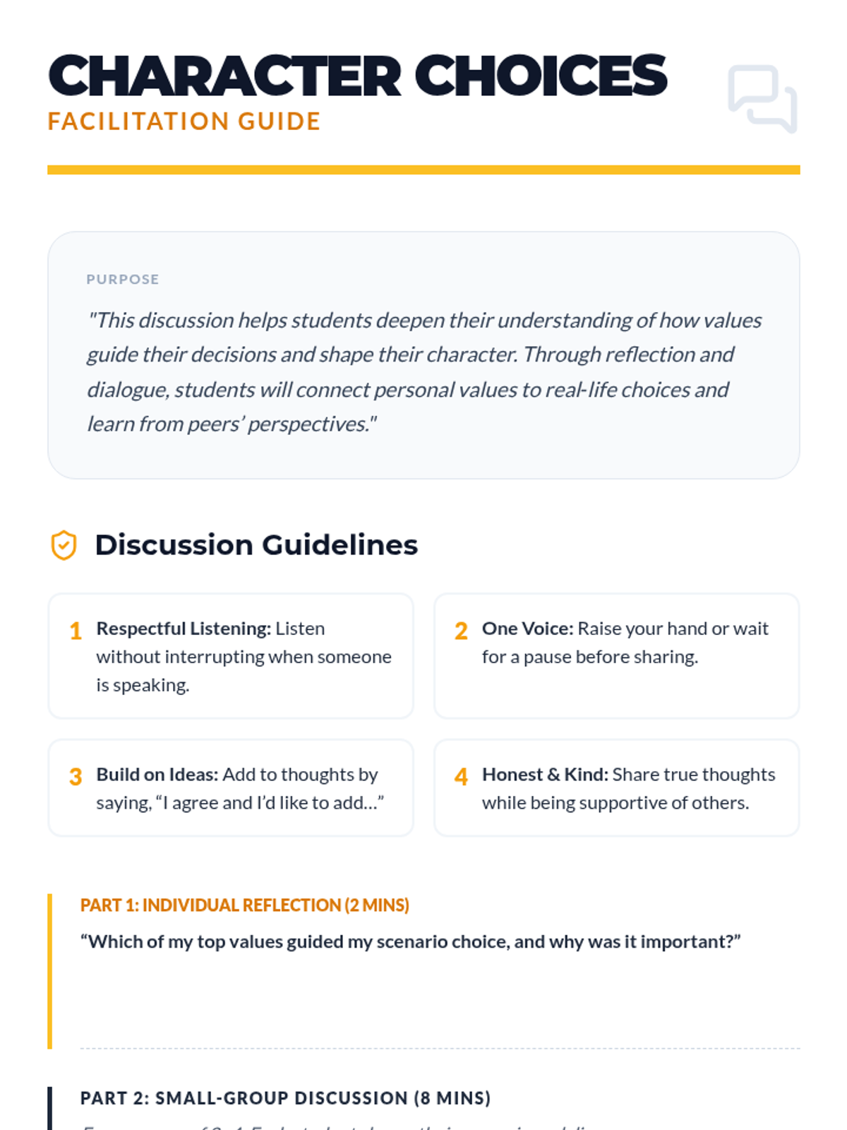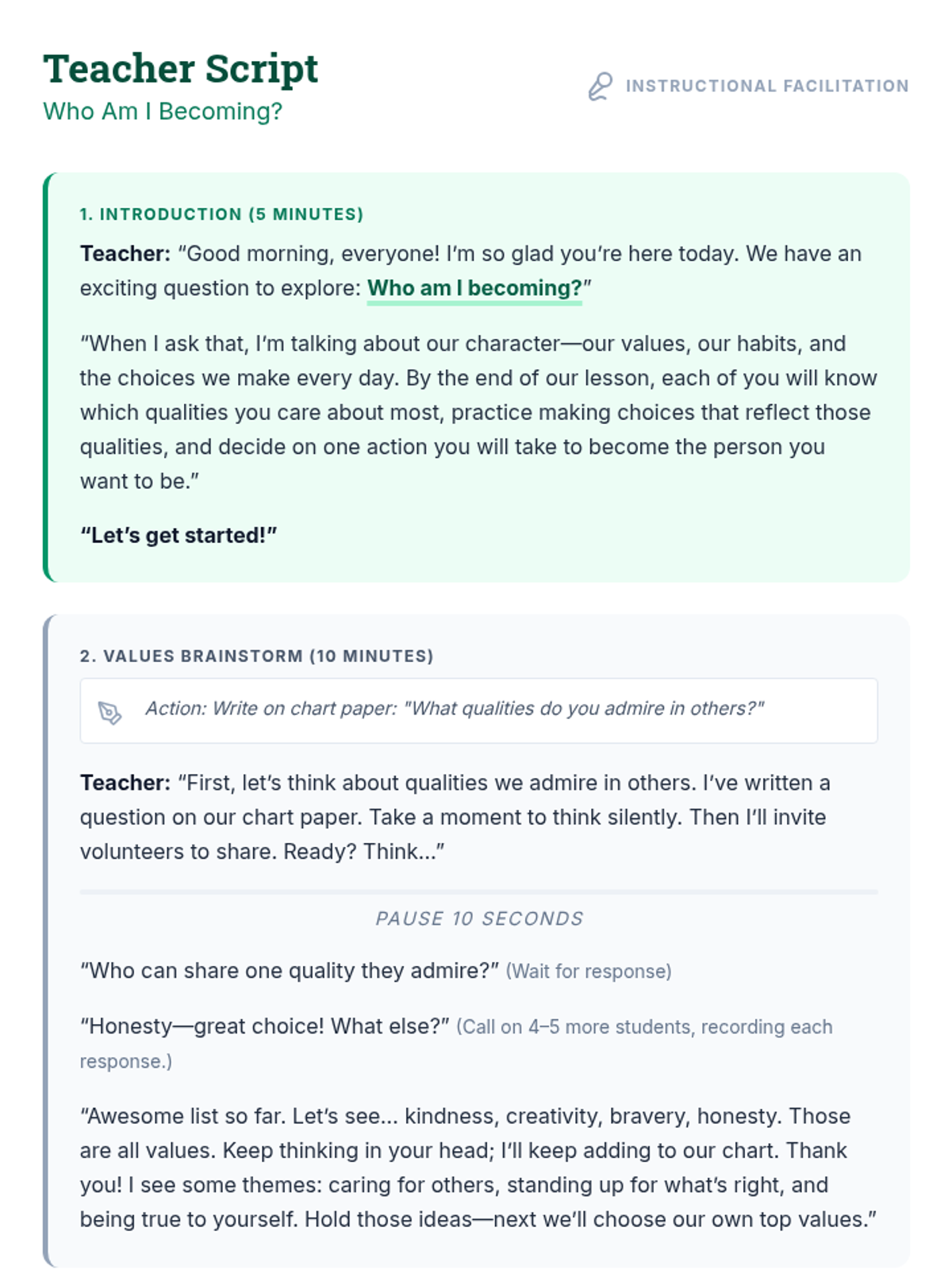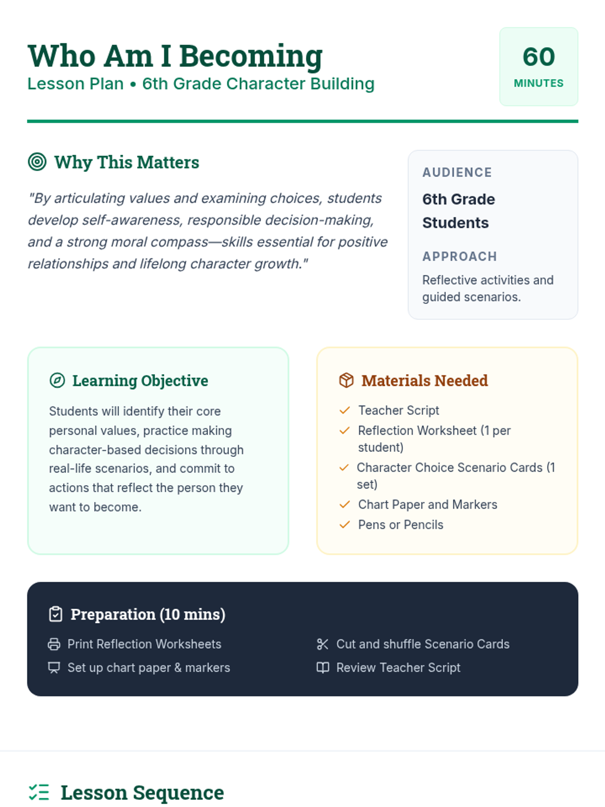 A 60-minute character-building lesson where 6th graders identify personal values, navigate real-life dilemmas, and commit to personal growth. Students develop self-awareness and decision-making skills through reflective activities and group scenarios.