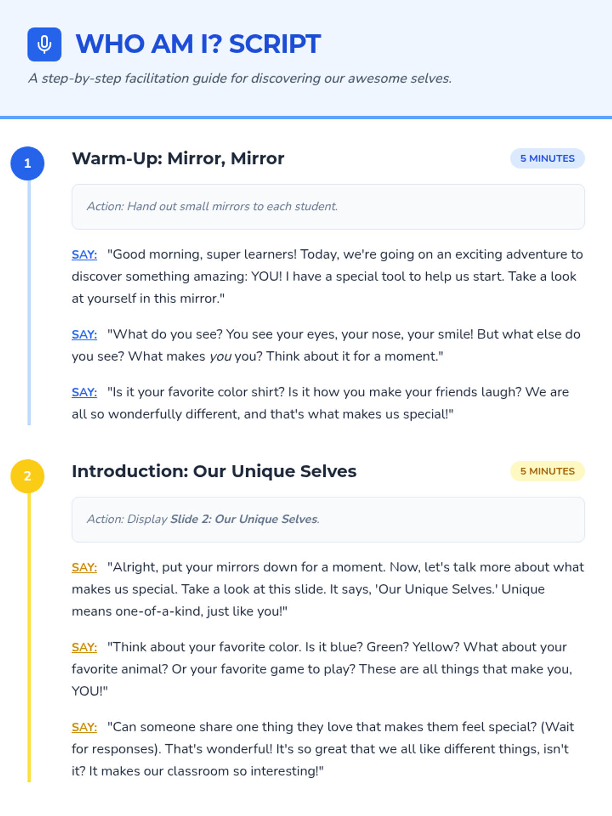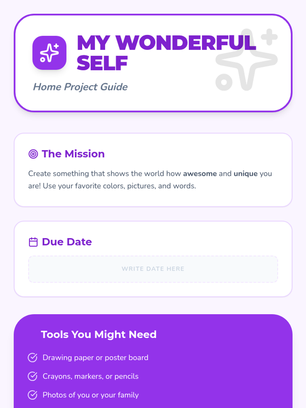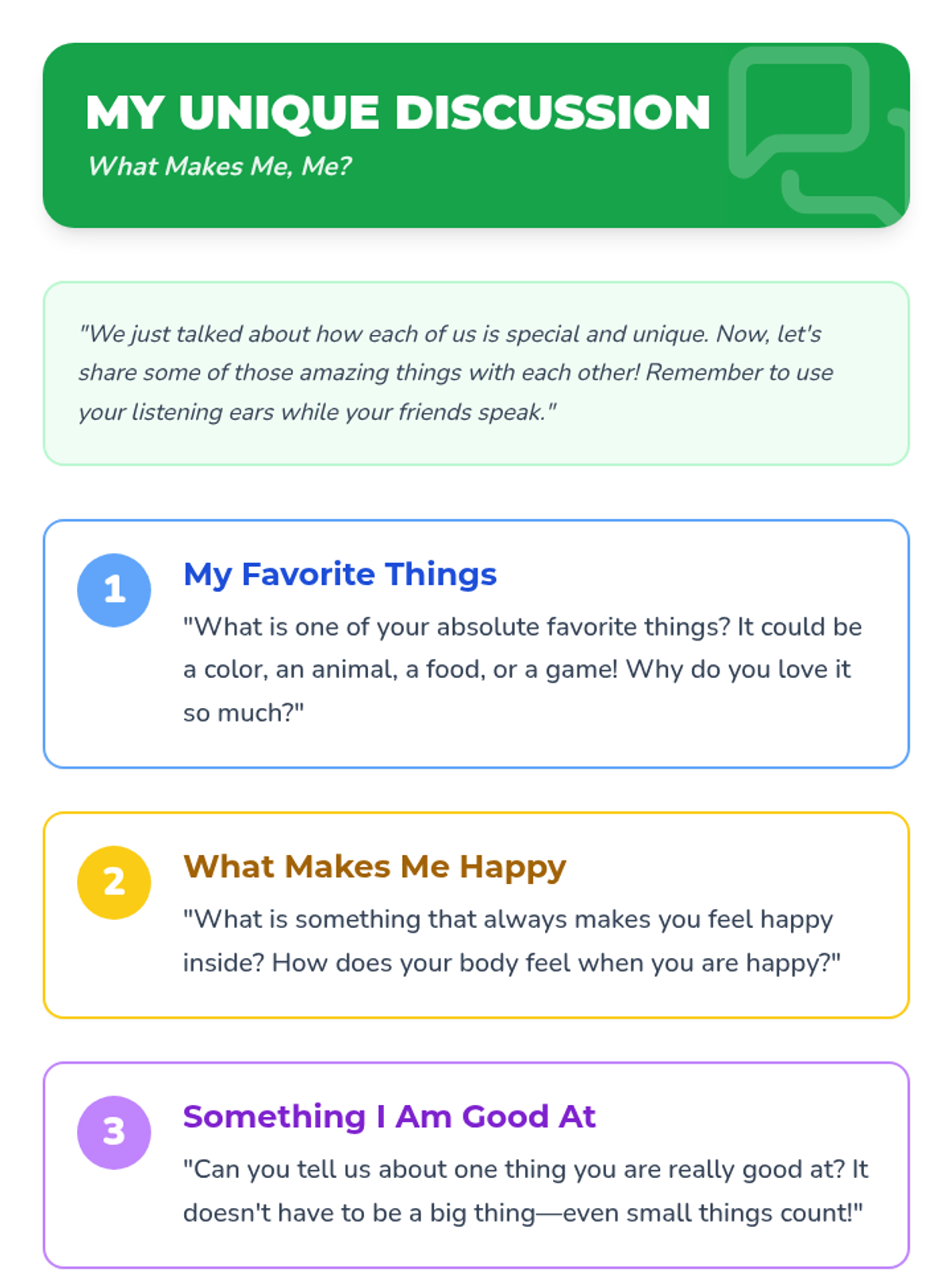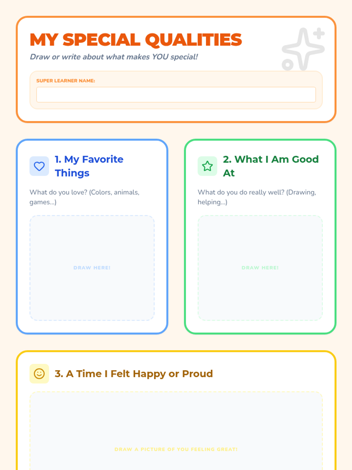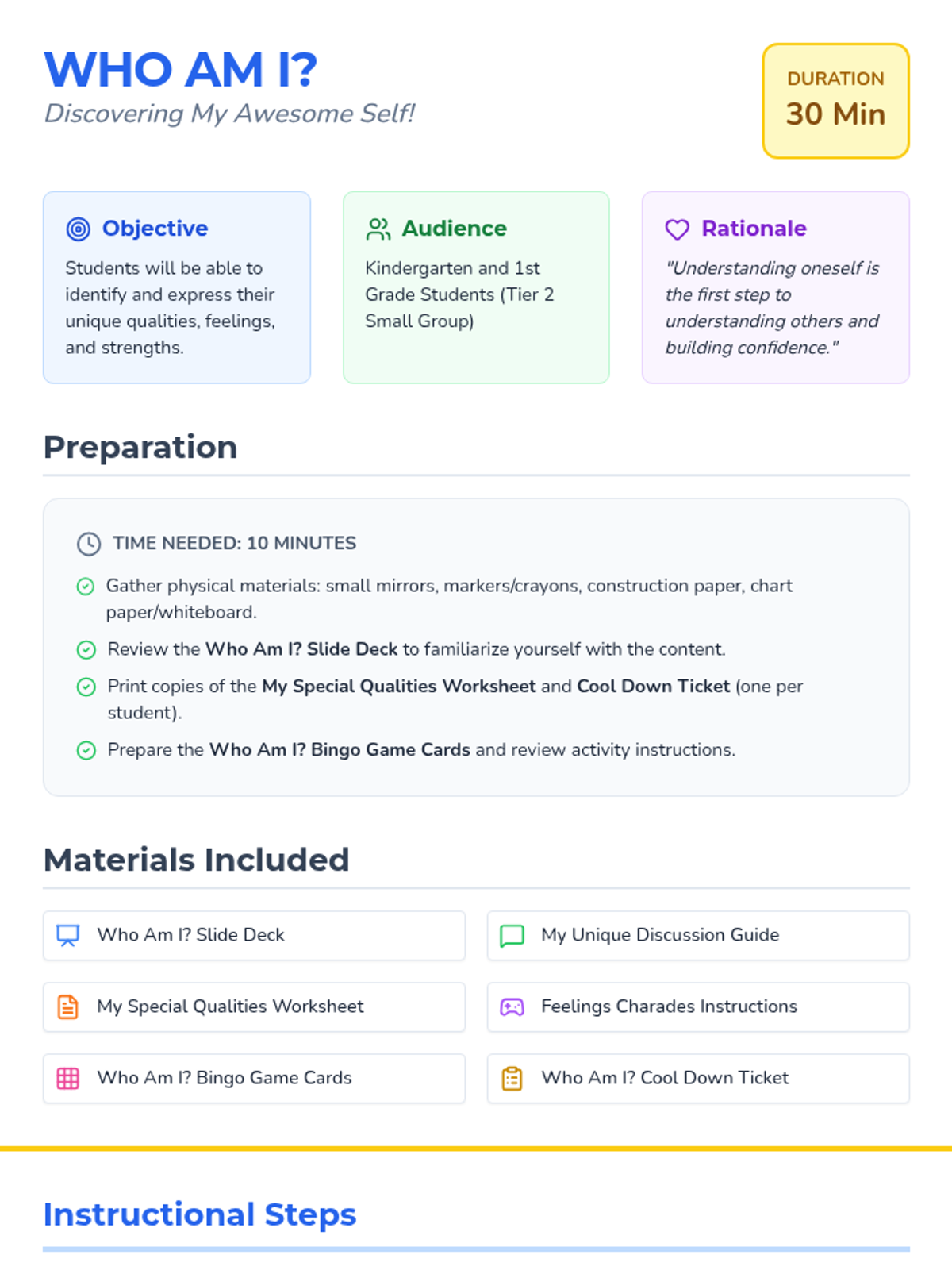 This lesson helps Kindergarten and 1st-grade students explore and understand their unique qualities, feelings, and strengths through interactive activities and creative expression.