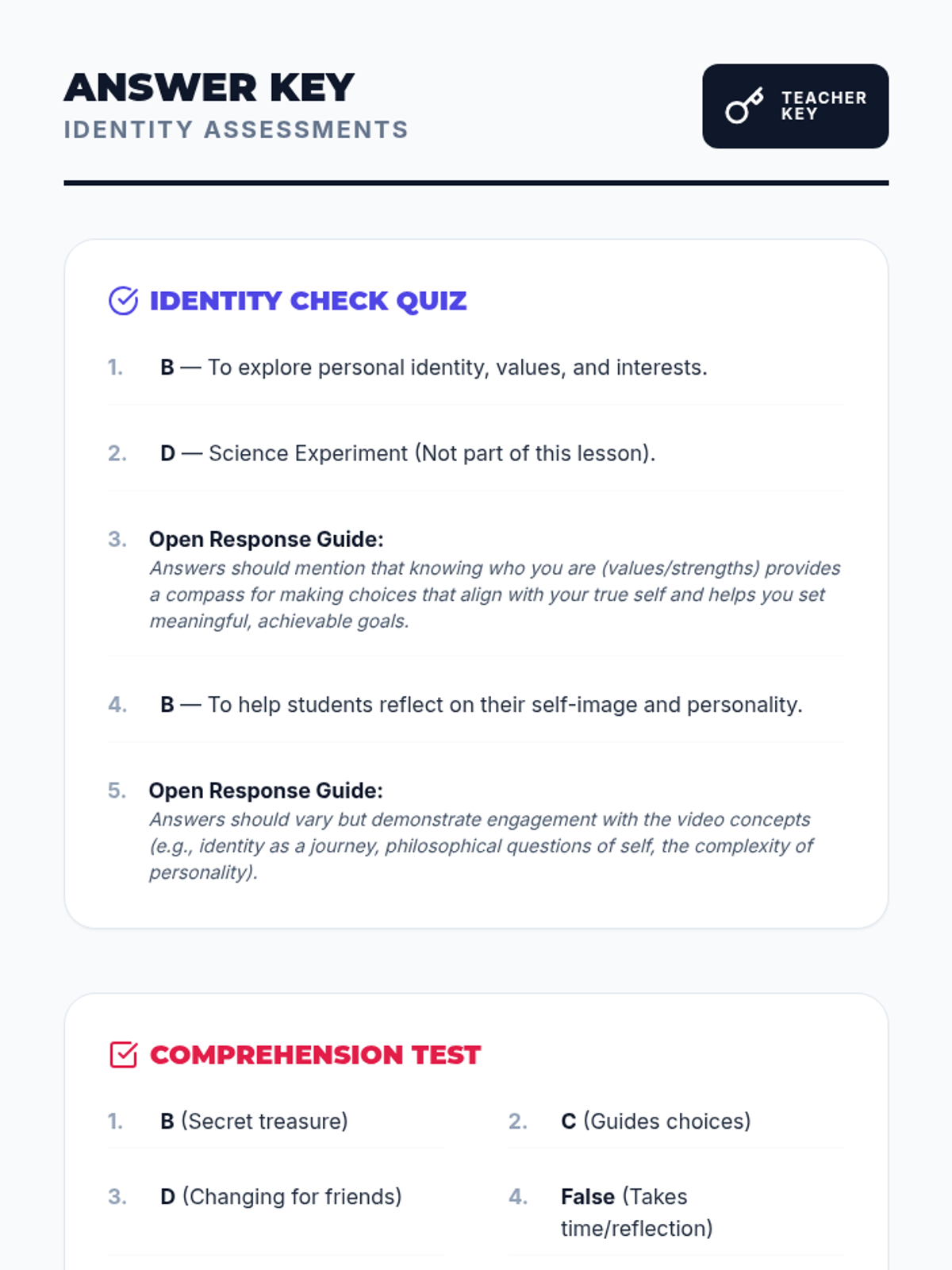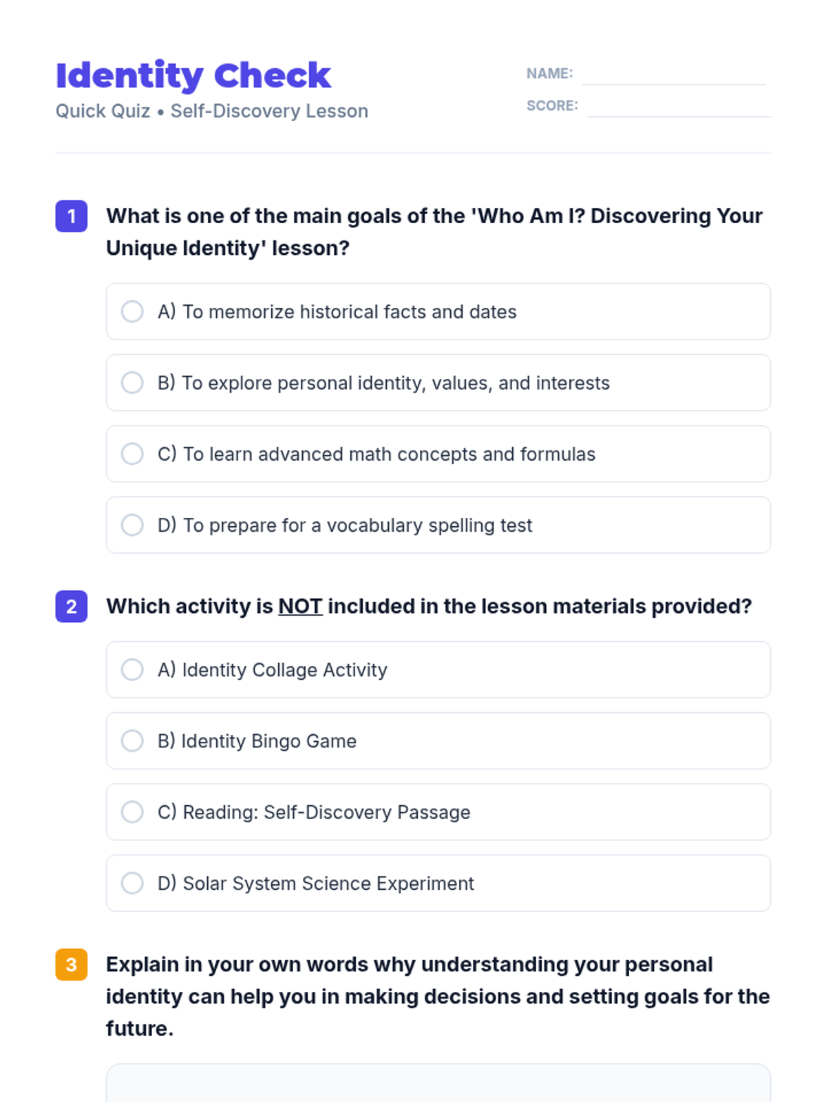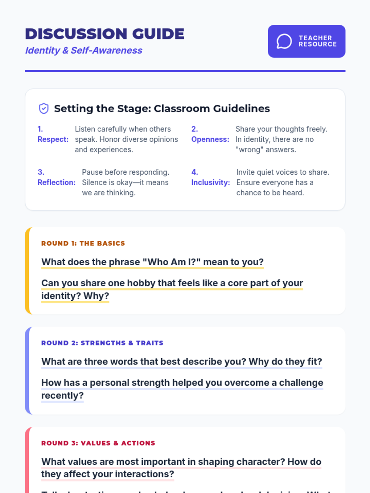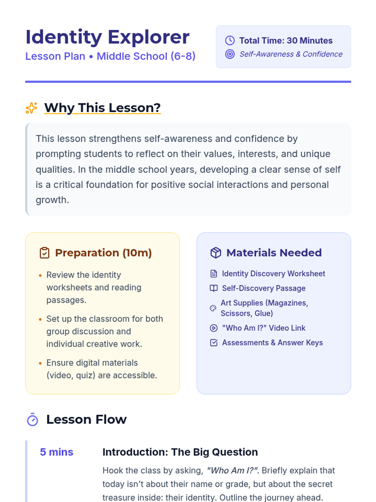 A middle school lesson designed to build self-awareness and confidence by exploring personal identity, values, and strengths through interactive activities and reflection.