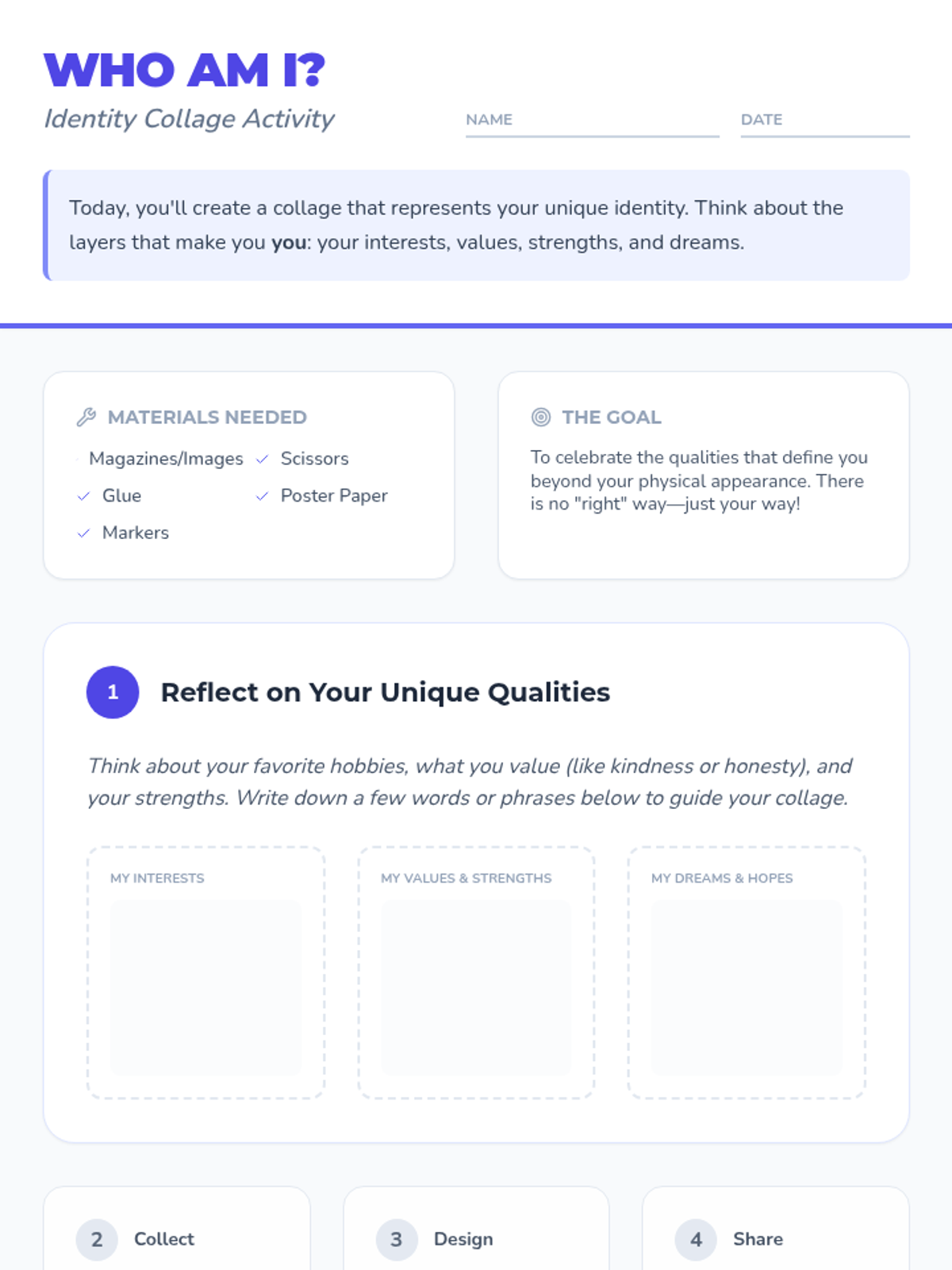 A 45-minute 5th-grade lesson focused on exploring personal identity beyond physical traits through discussion and a creative collage activity.