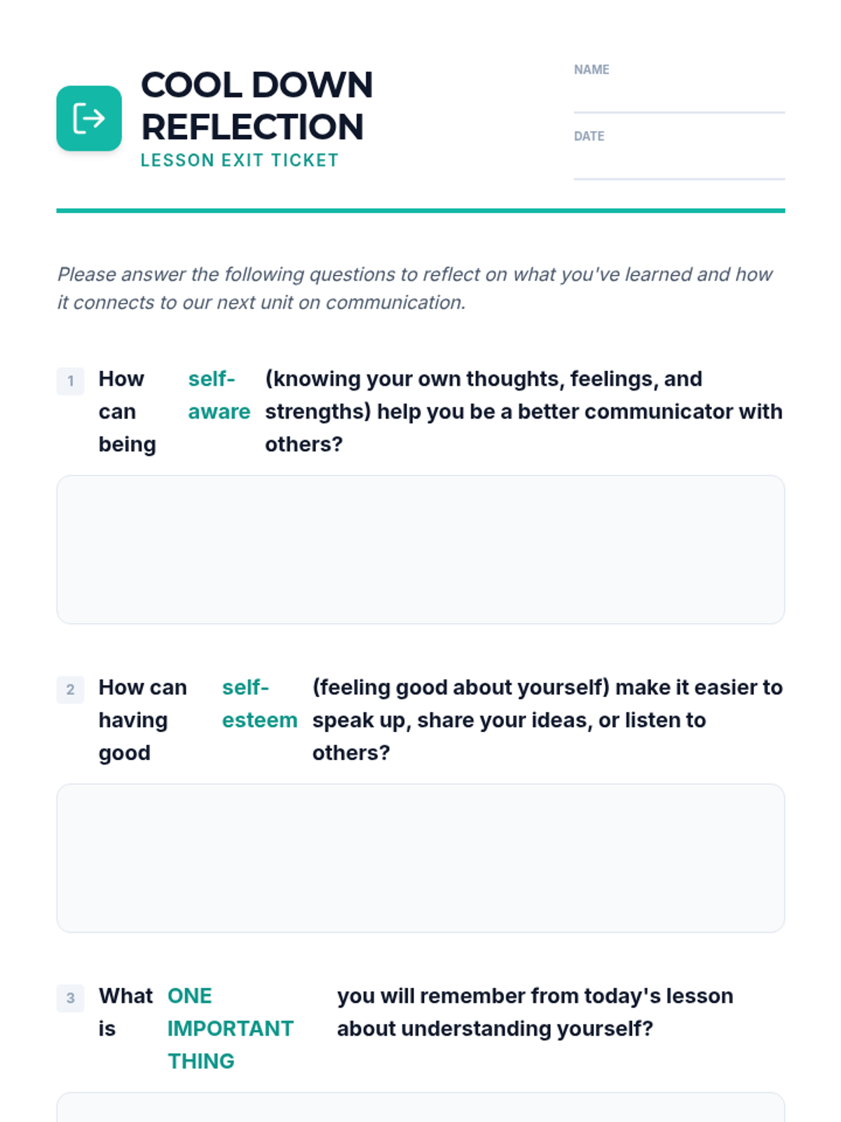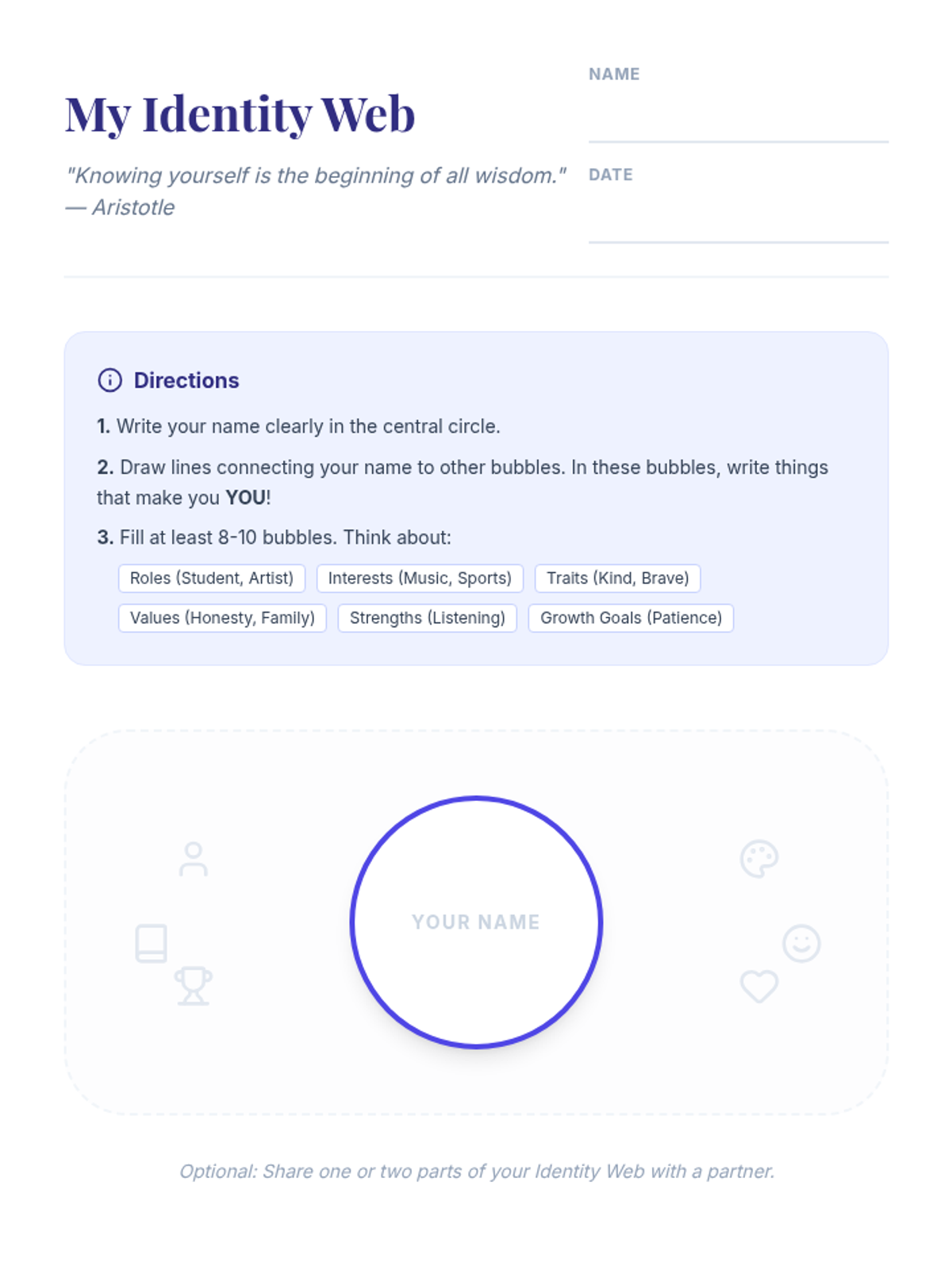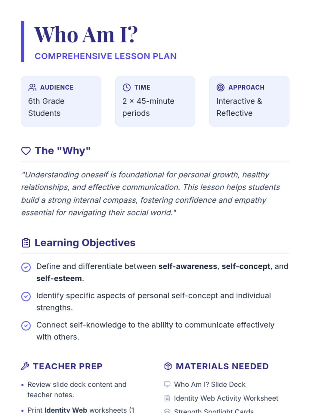 A two-period lesson for 6th-grade students focused on self-awareness, self-concept, and self-esteem as a foundation for effective communication. Students create identity webs, reflect on their strengths, and connect self-knowledge to interpersonal skills.