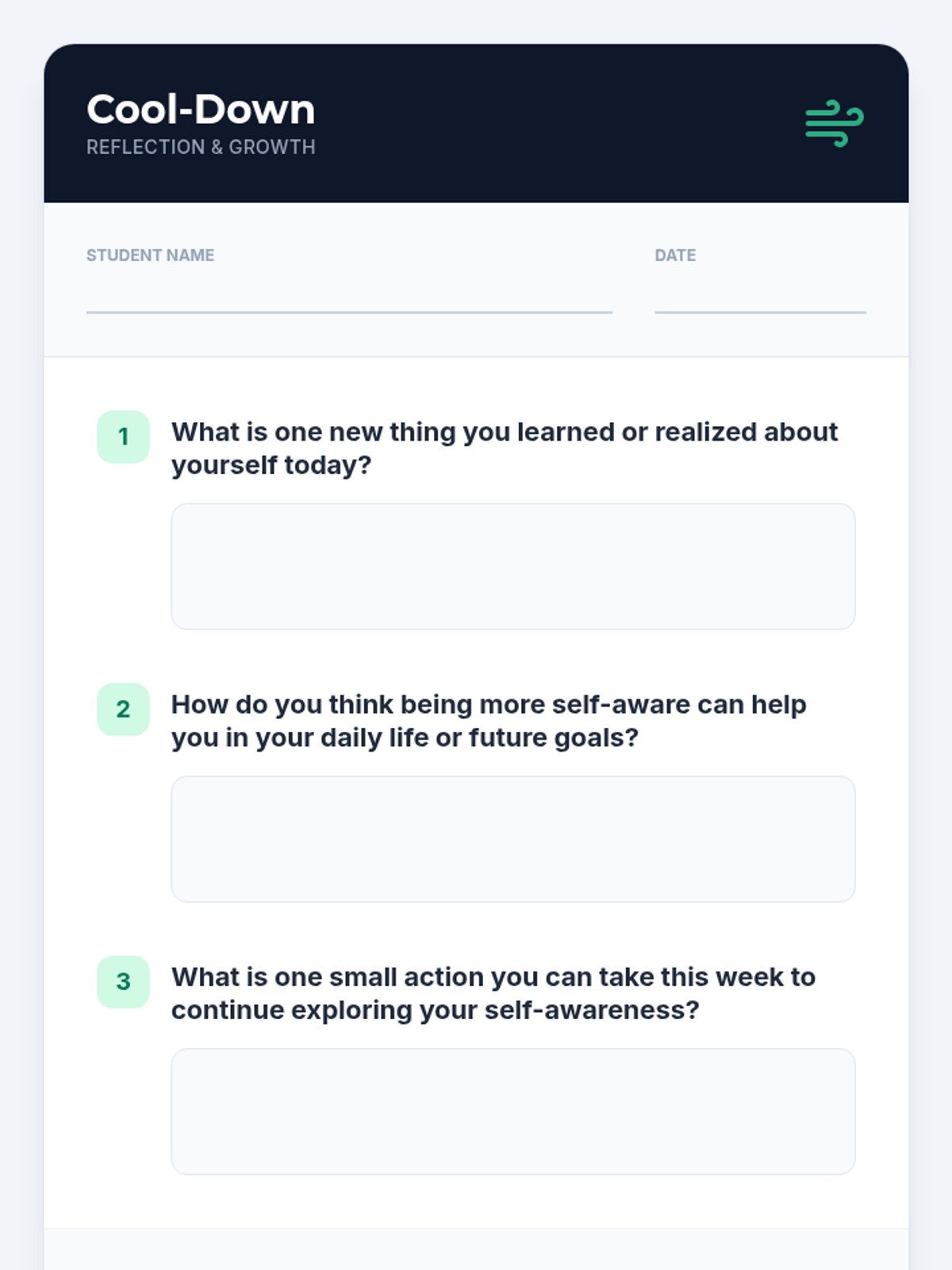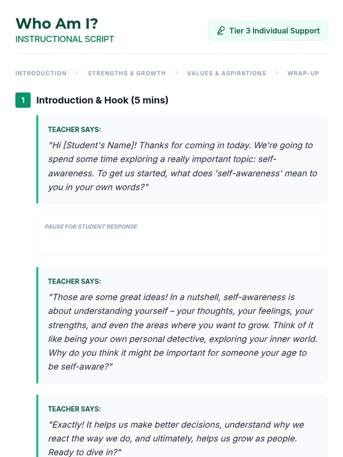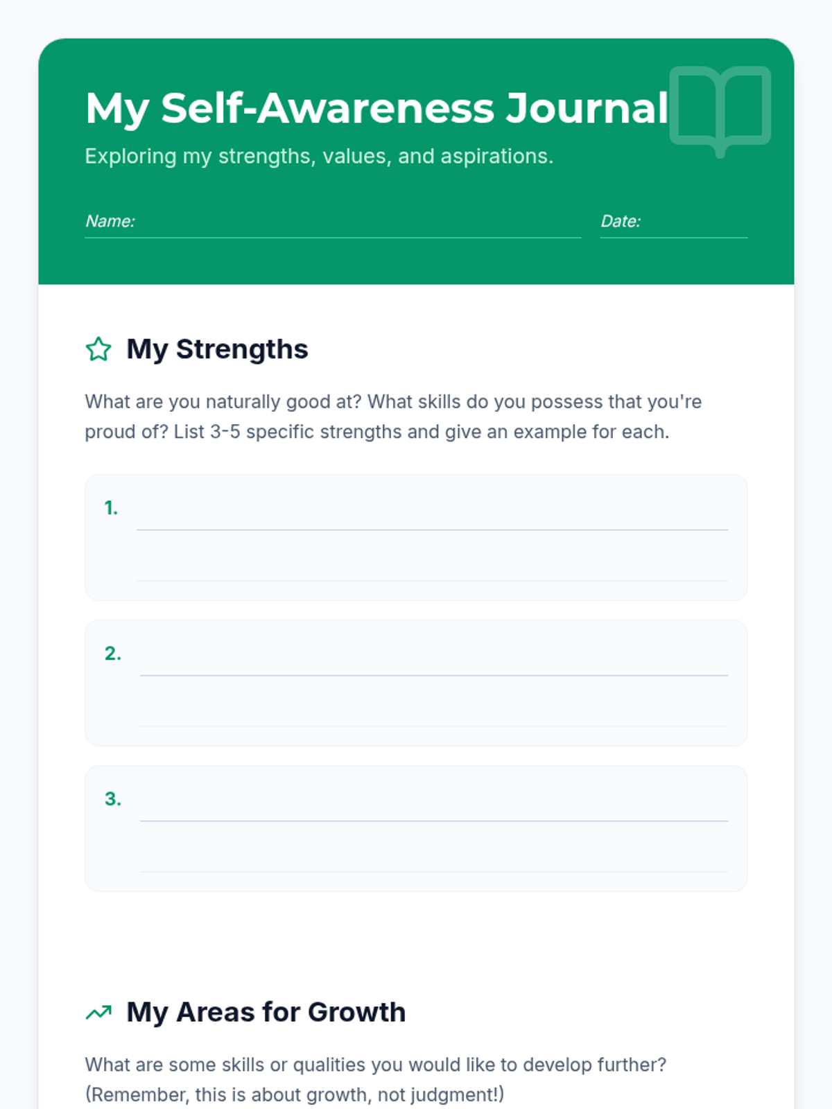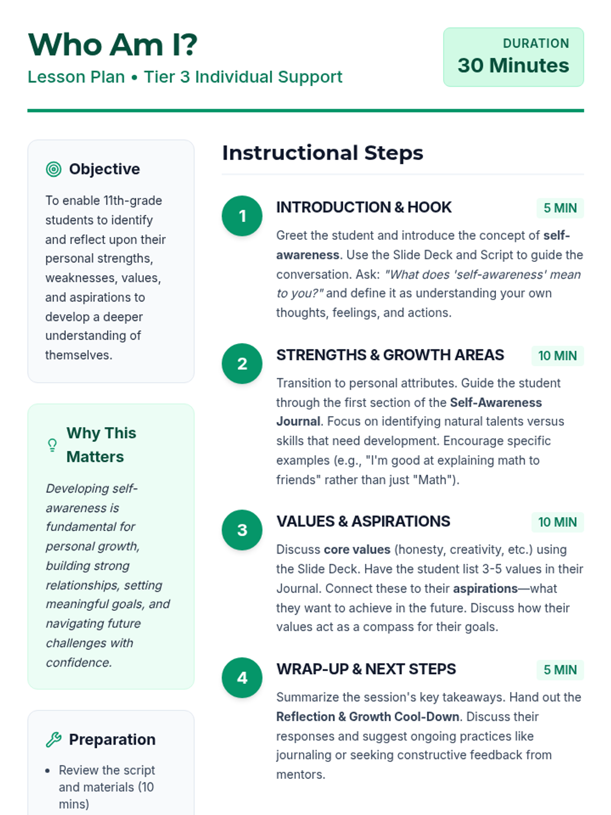 A 30-minute individual Tier 3 lesson for 11th-grade students to explore self-awareness, identifying their strengths, growth areas, values, and aspirations.