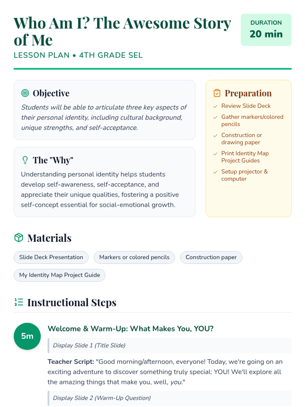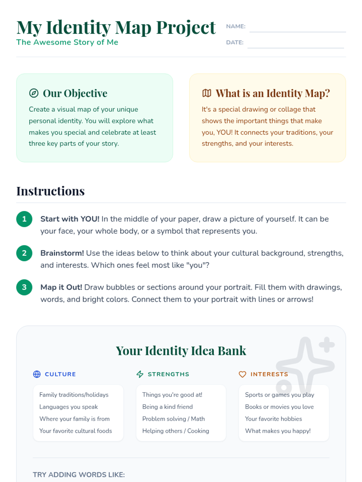 A 20-minute SEL lesson for 4th graders to explore their personal identity through the metaphor of an 'Identity Map.' Students will identify cultural backgrounds, unique strengths, and practice self-acceptance.