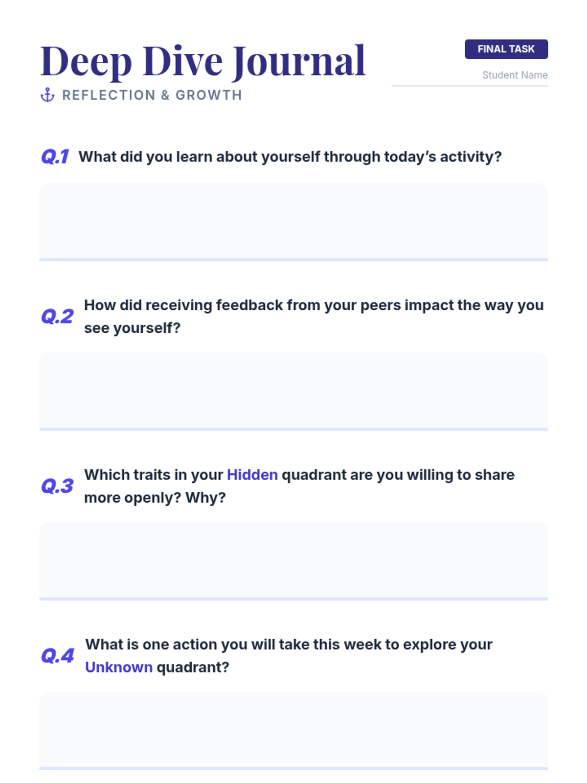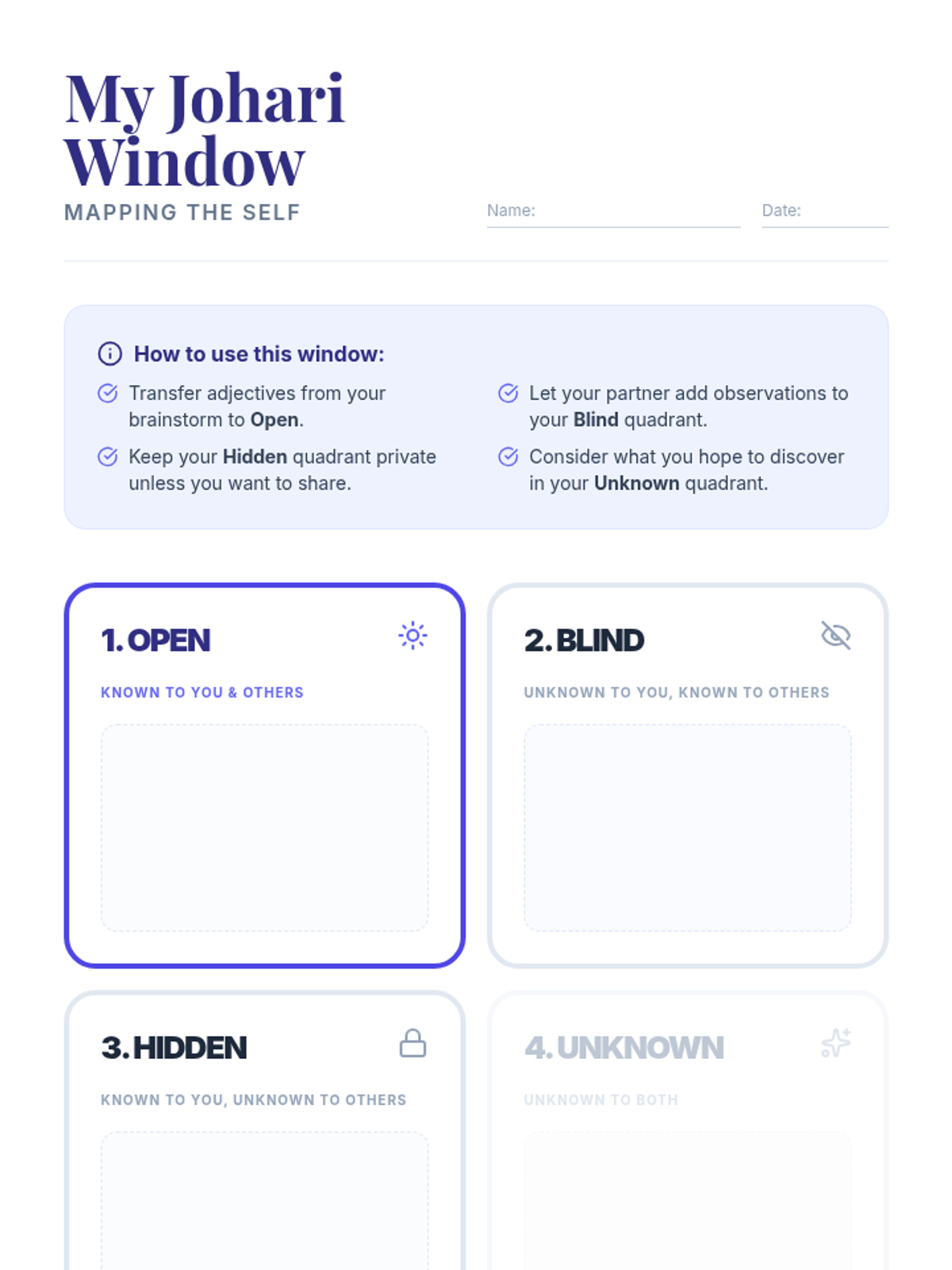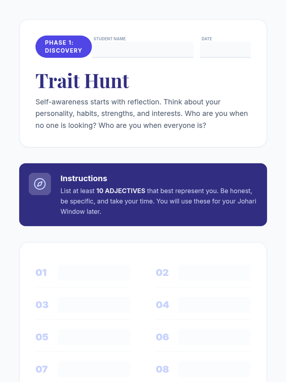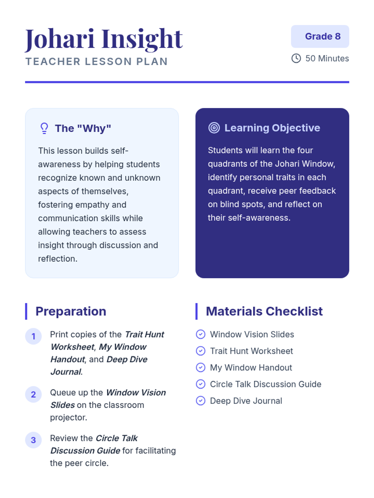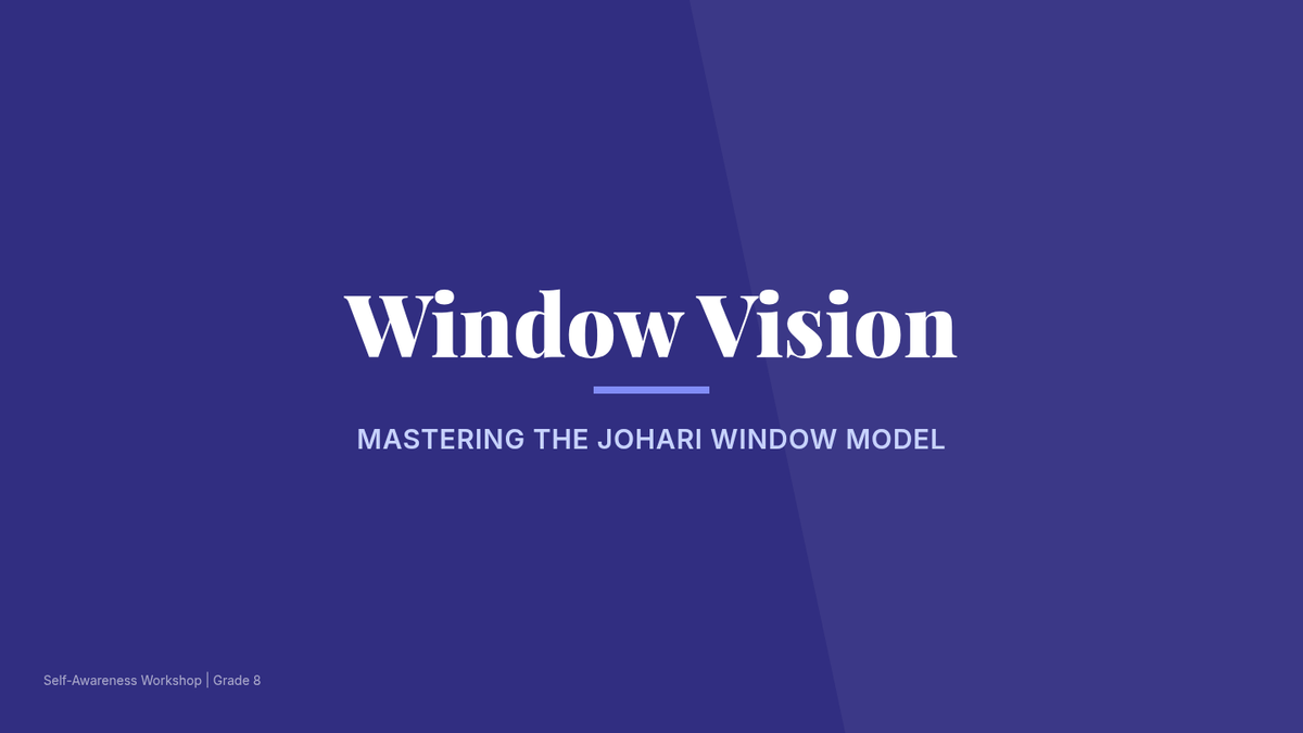 In this 50-minute lesson, 8th grade students will explore the Johari Window model to build self-awareness by identifying known and unknown aspects of themselves. Through a mix of brainstorming, collaborative activities, and reflection, students will gain insight into how they view themselves and how others perceive them.