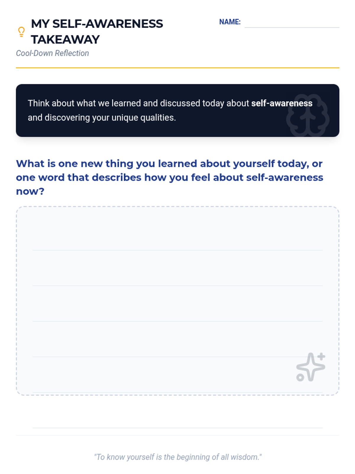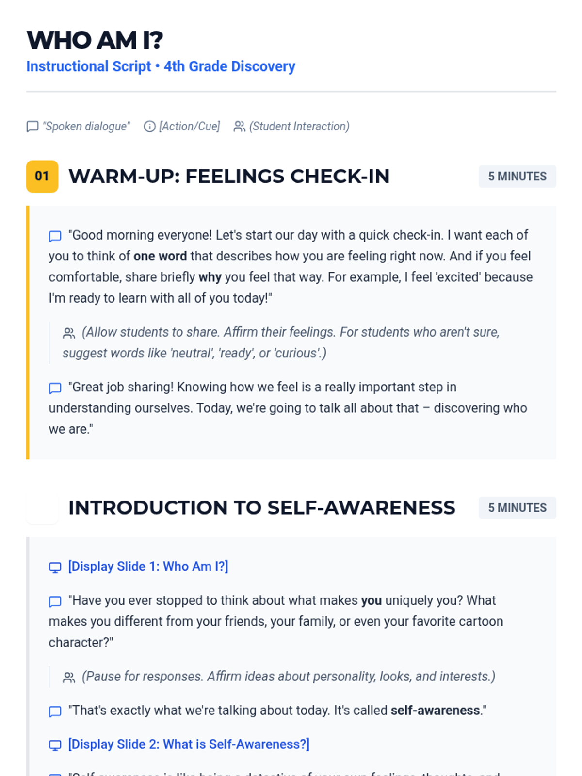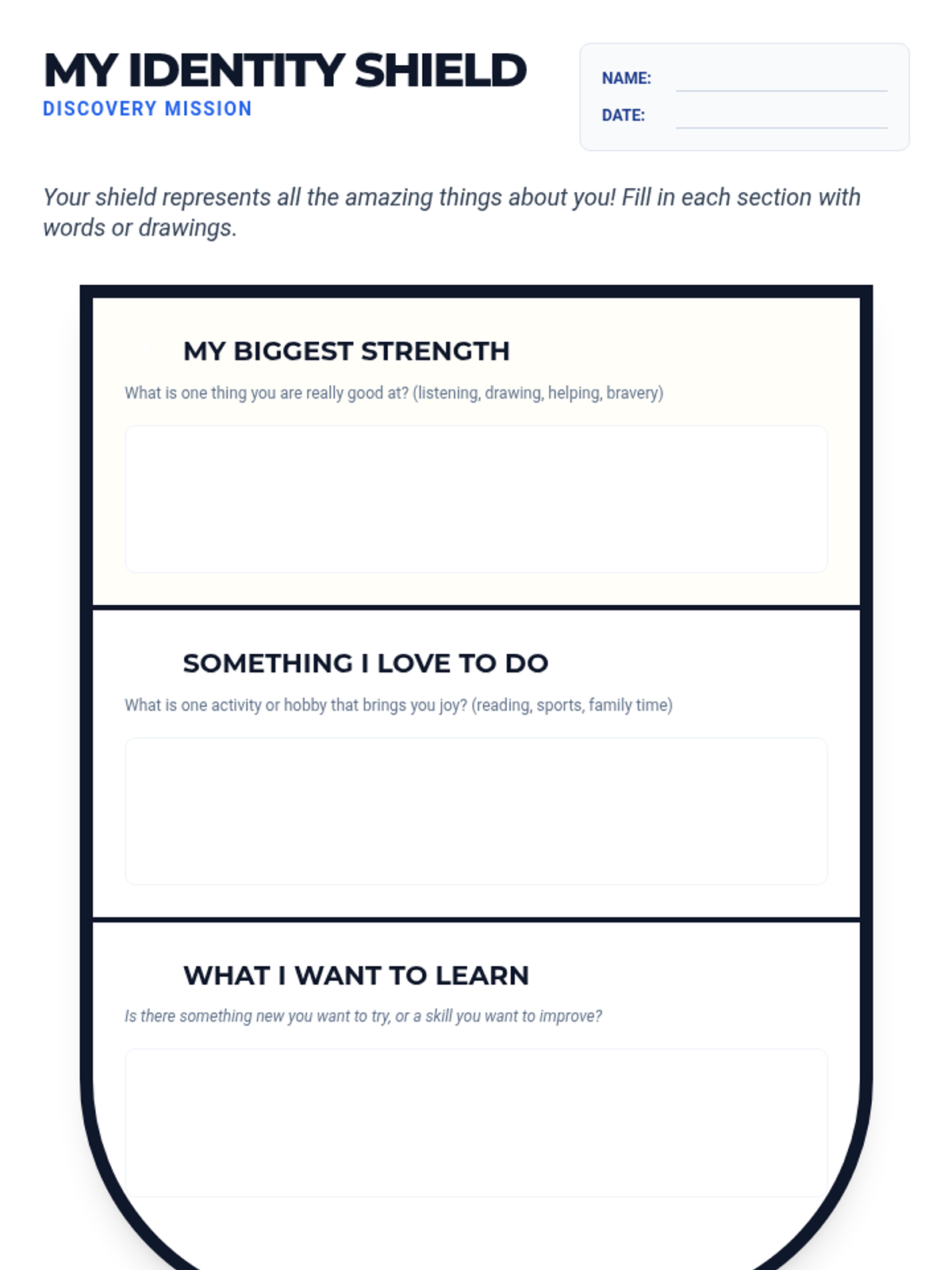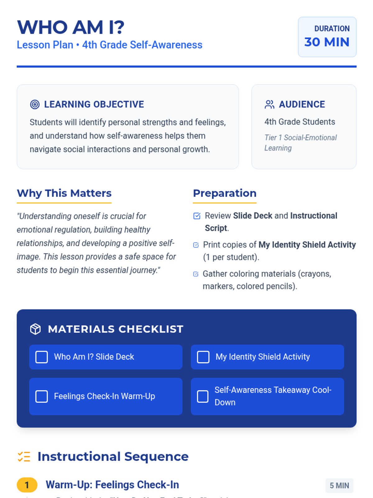 A 30-minute lesson for 4th graders to explore self-awareness, personal strengths, and emotional check-ins through a creative identity shield activity.