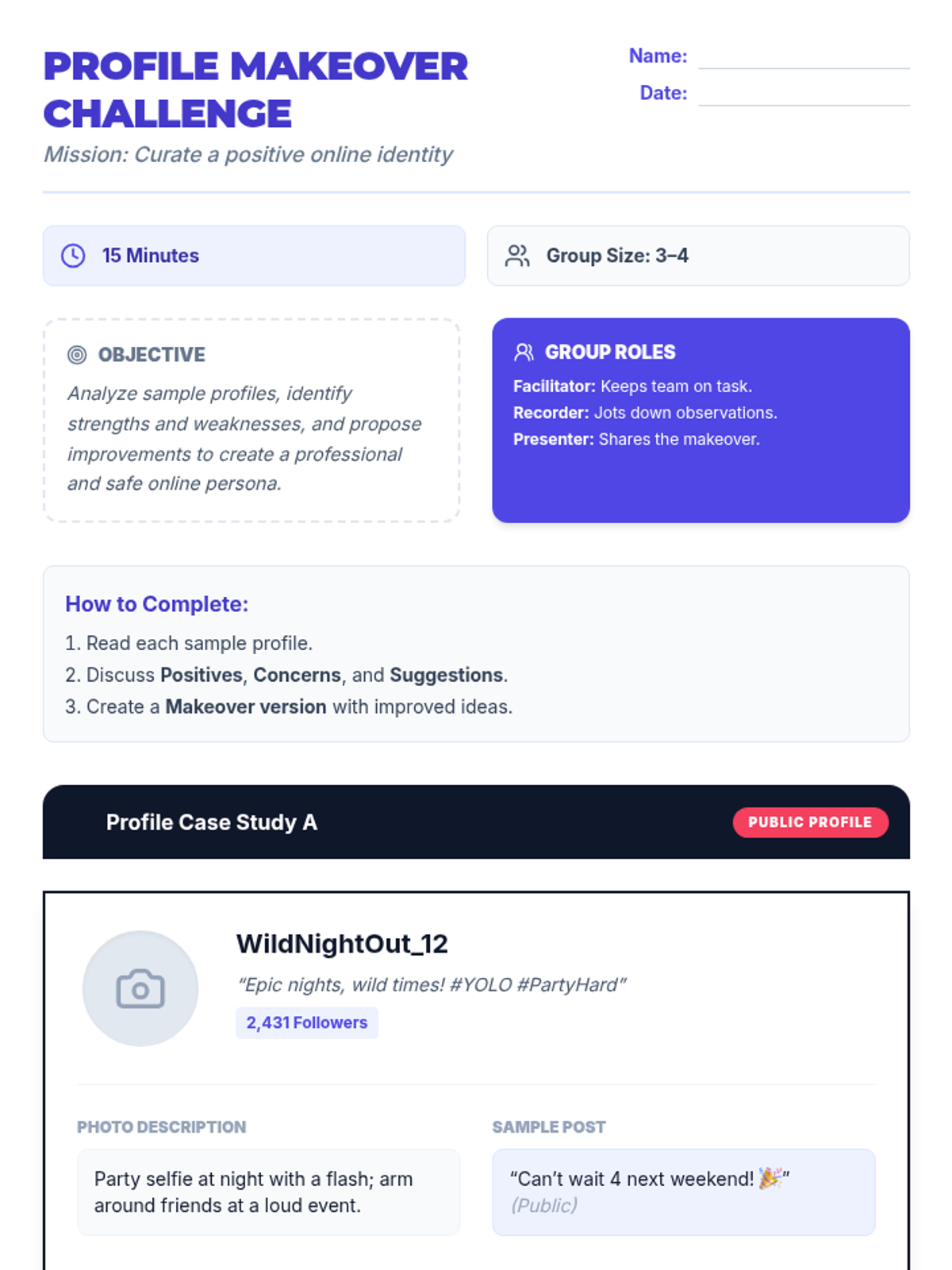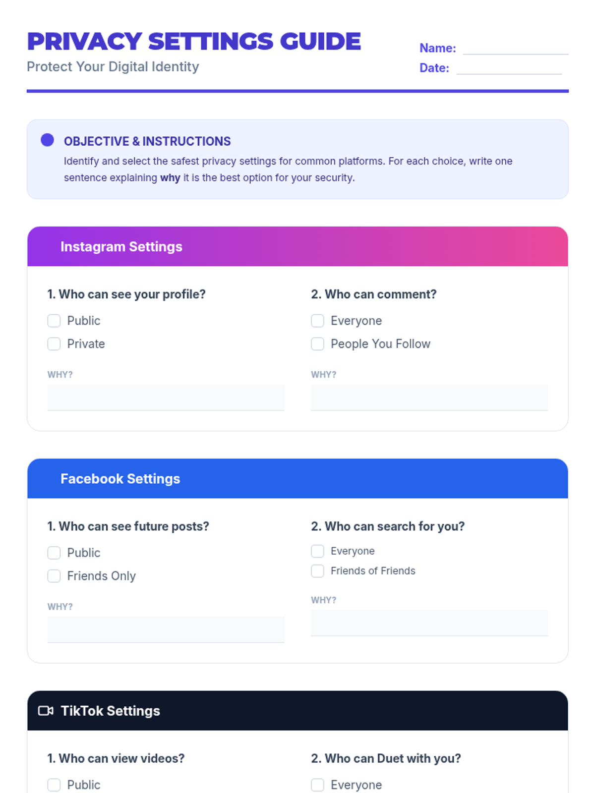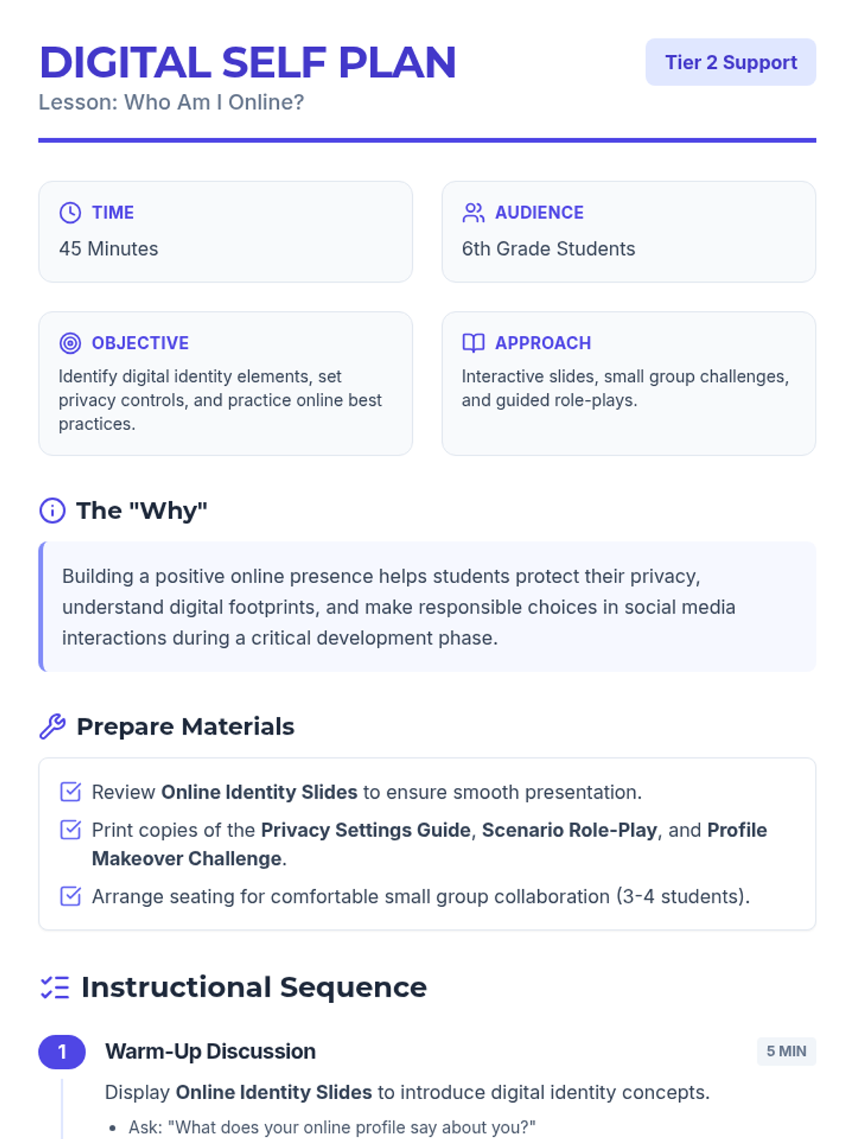 An interactive Tier 2 lesson for 6th graders focusing on digital identity, privacy settings, and responsible social media use to curate a positive online presence.
