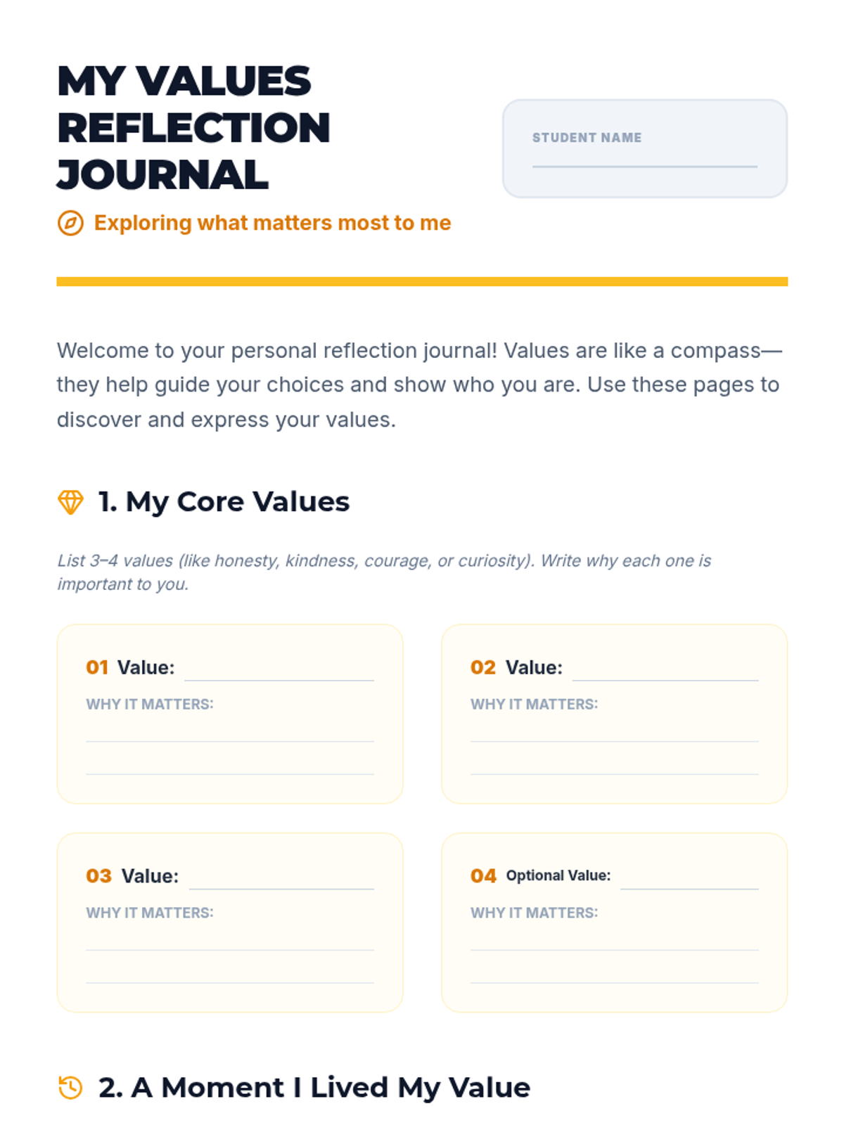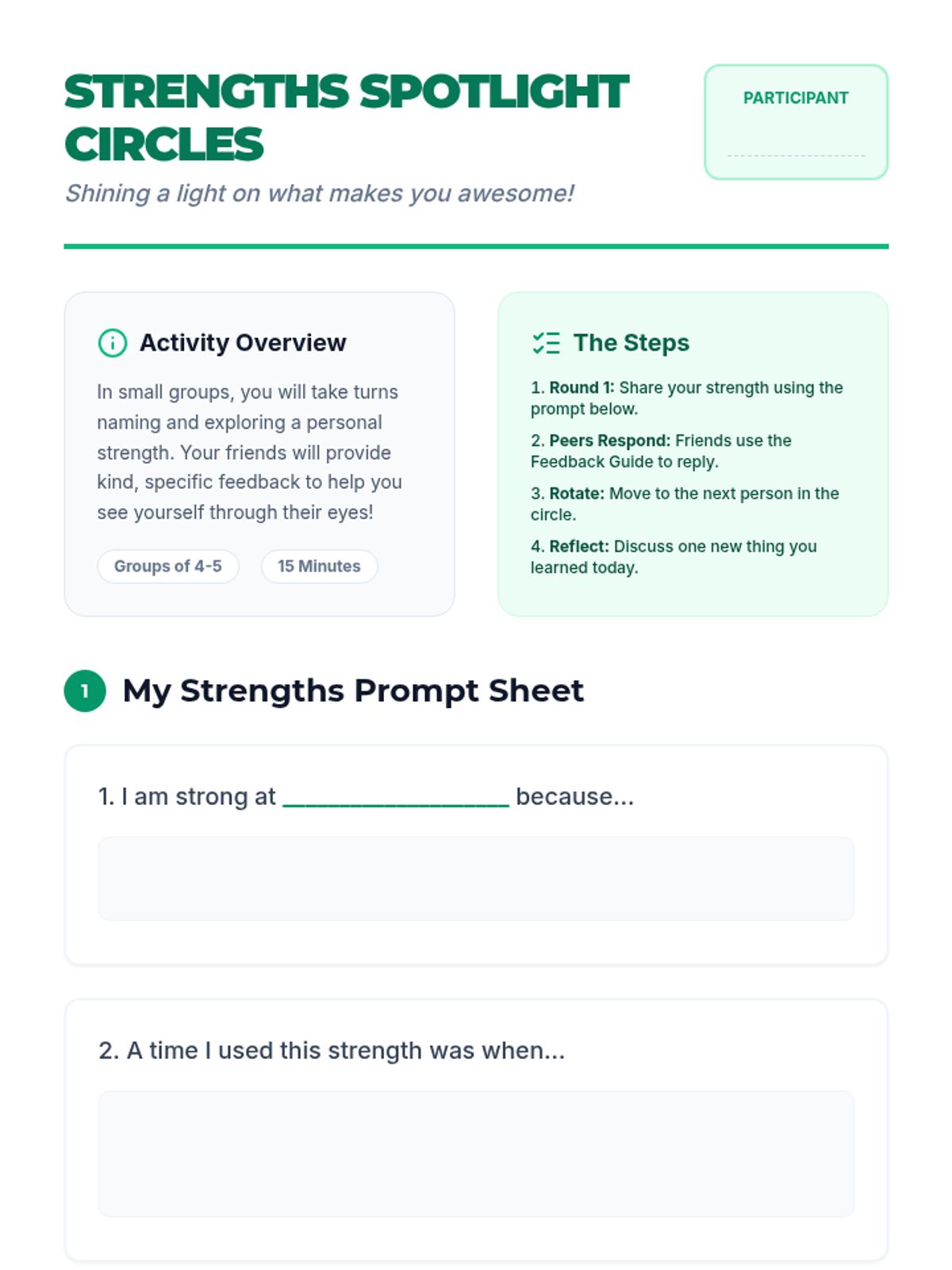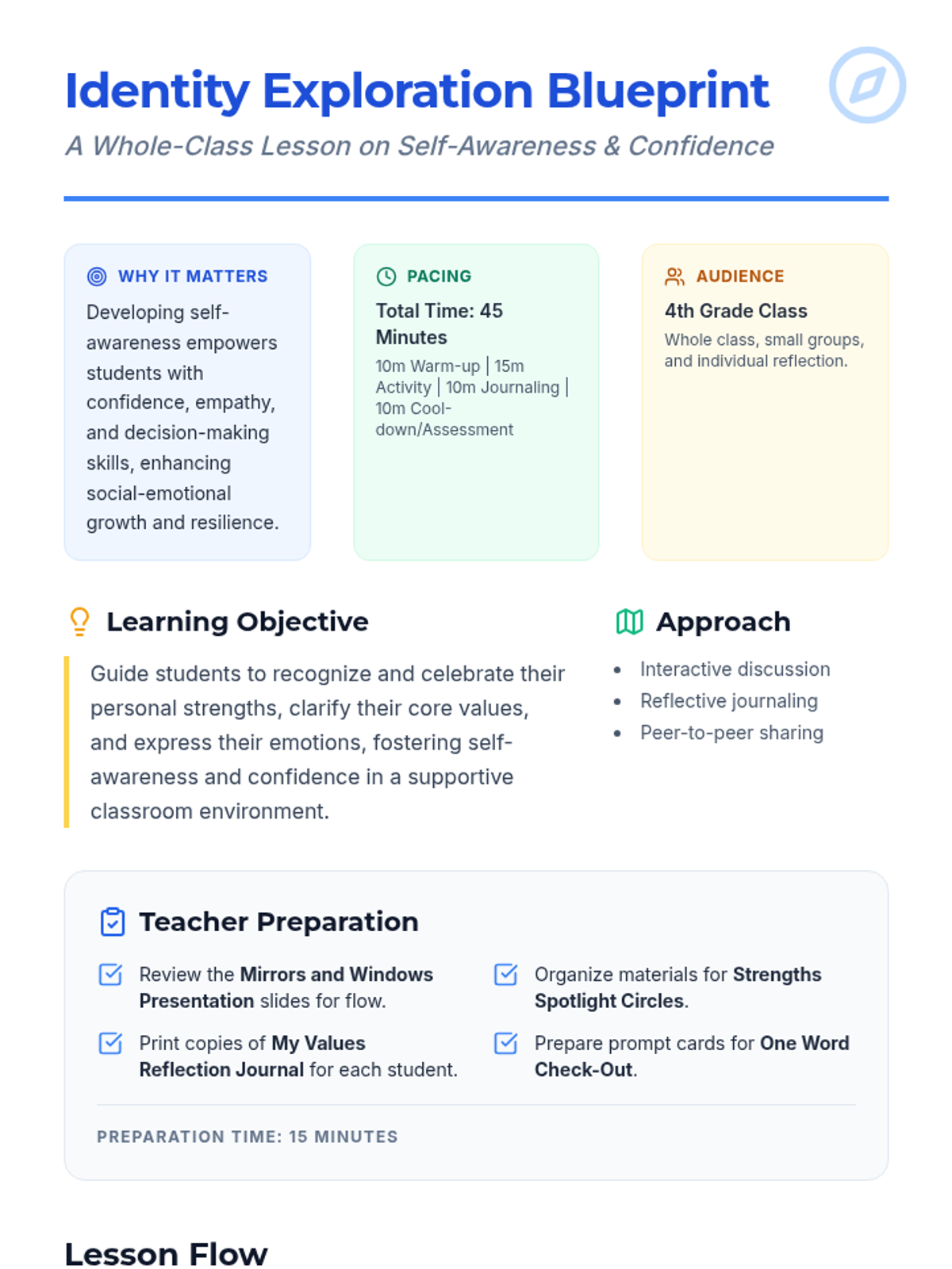 A 45-minute social-emotional learning lesson for 4th graders focused on developing self-awareness through exploring personal strengths, core values, and emotional reflection.