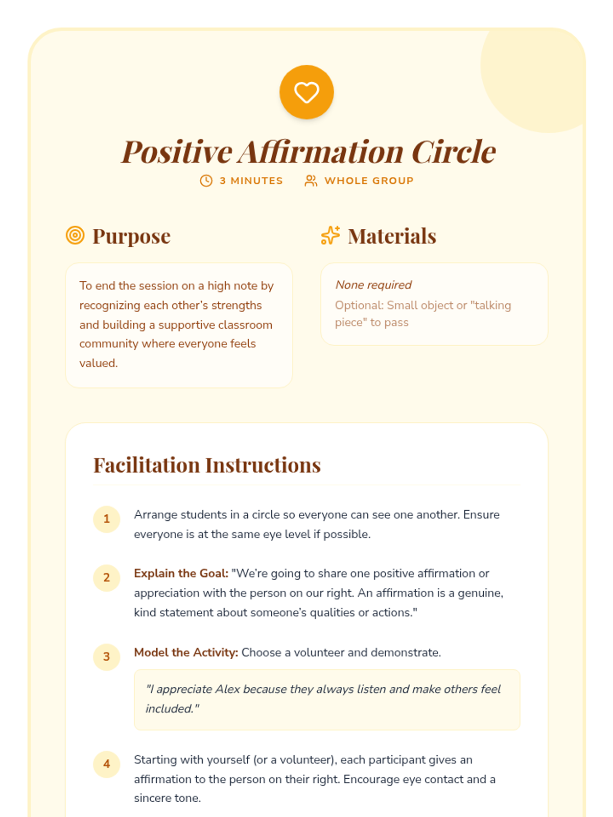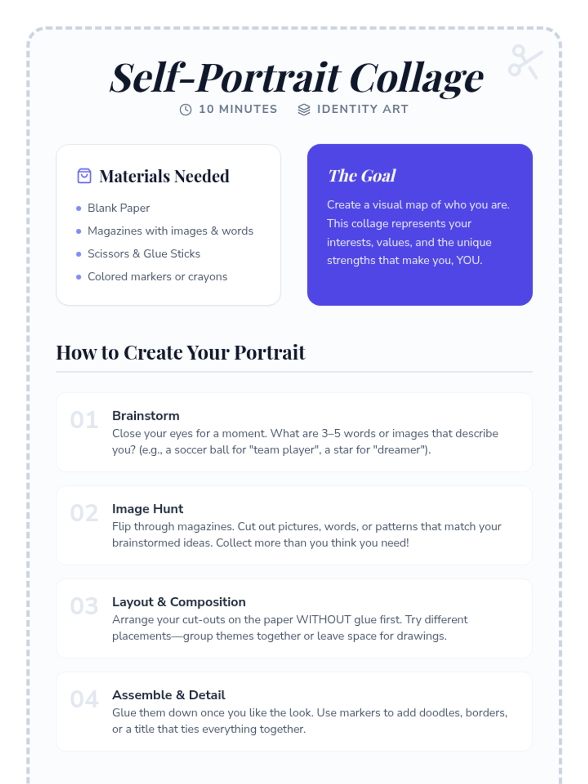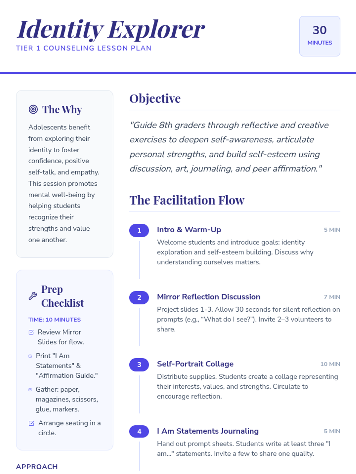 A 30-minute Tier 1 counseling session for 8th graders to explore identity, recognize personal strengths, and build self-esteem through art, journaling, and peer affirmation.