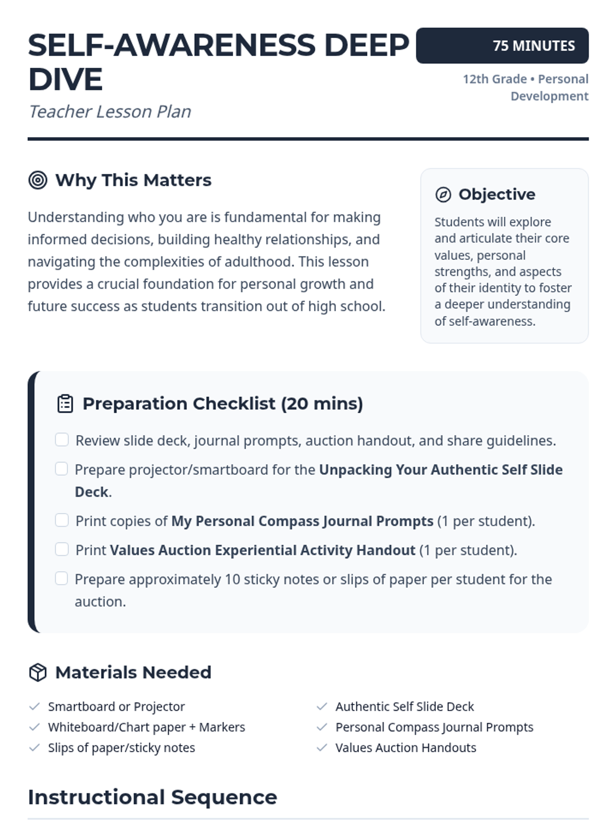 A 75-minute self-awareness lesson for 12th graders to explore their identity and core values as they prepare for life after high school.