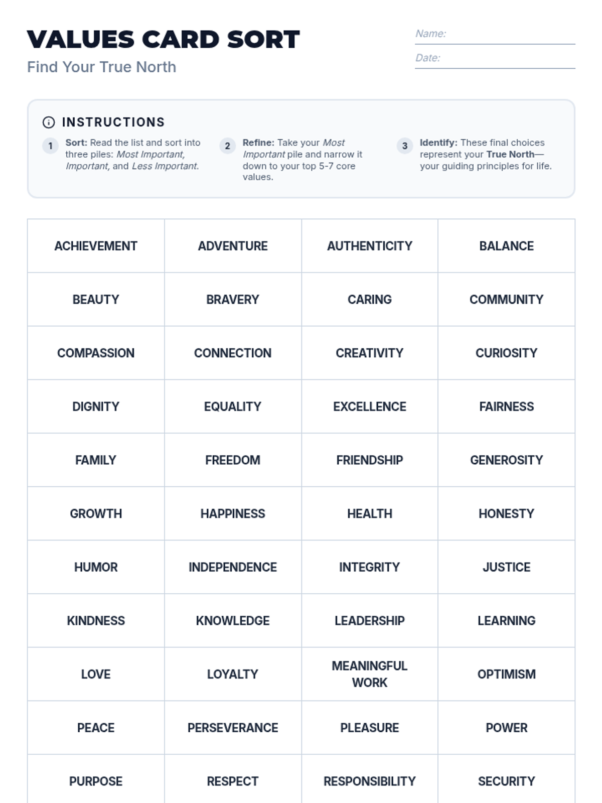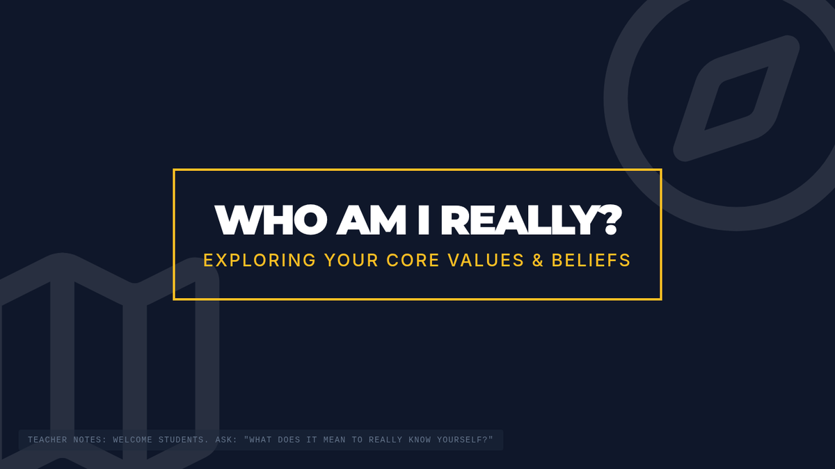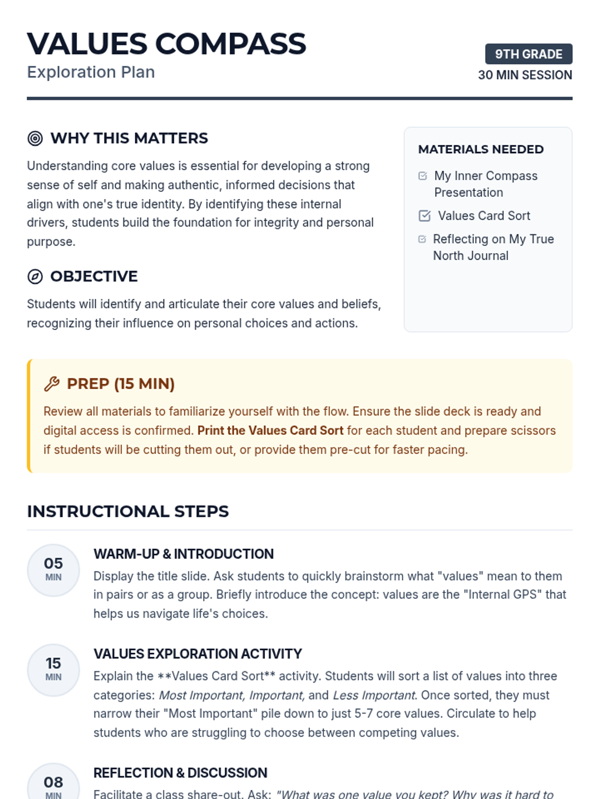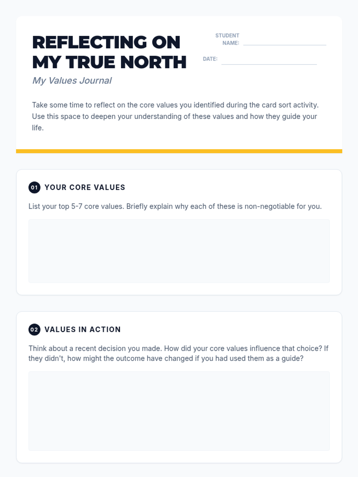 A 30-minute 9th-grade lesson exploring core values and beliefs to build self-awareness and authentic decision-making skills. Students identify their 'True North' through a values sorting activity and reflective journaling.