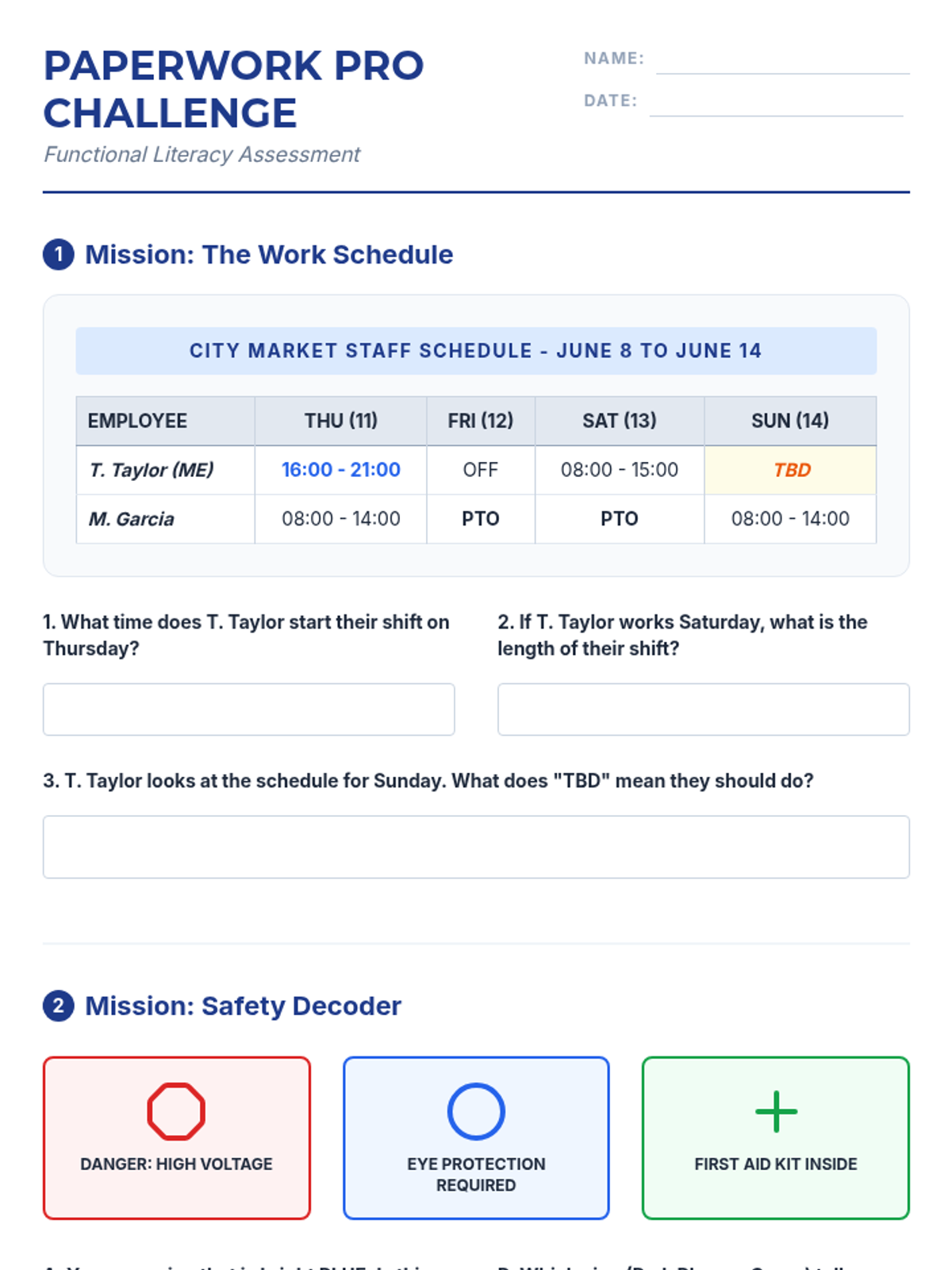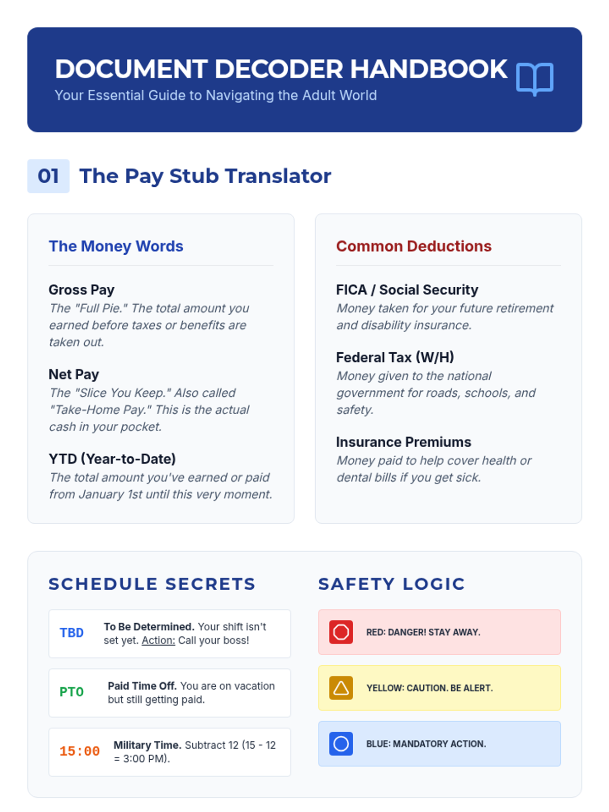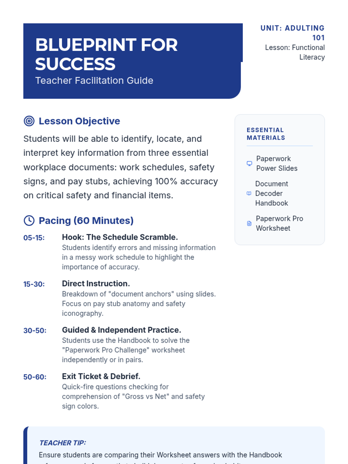 A comprehensive lesson on functional literacy designed to help students navigate workplace and community documents like schedules, pay stubs, and safety signs. Students will develop the skills needed for independent post-secondary life by learning to extract and interpret critical information.