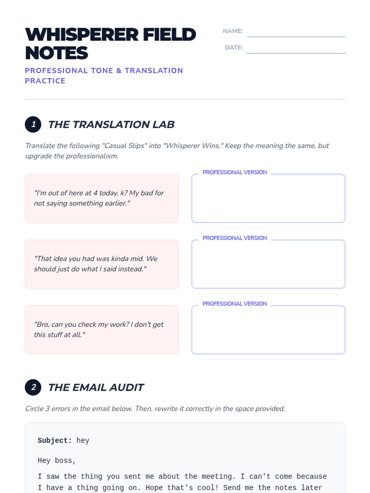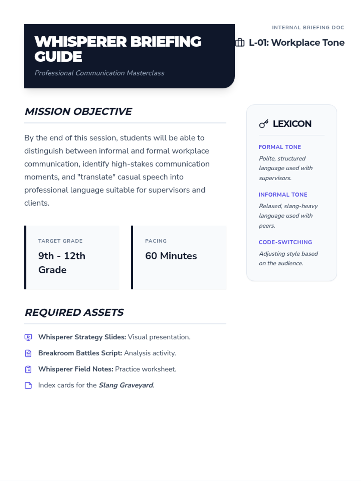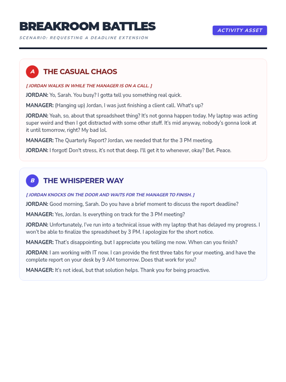 High school students master professional workplace communication by analyzing and practicing formal vs. informal language in various corporate scenarios.