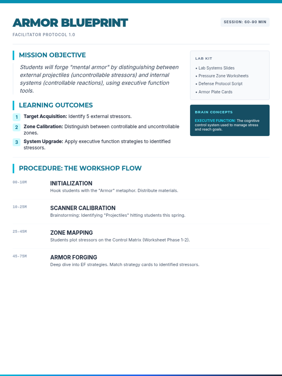 A cognitive-behavioral workshop for high school students focused on identifying external stressors, categorizing control zones, and building executive function strategies to manage high-pressure seasons.