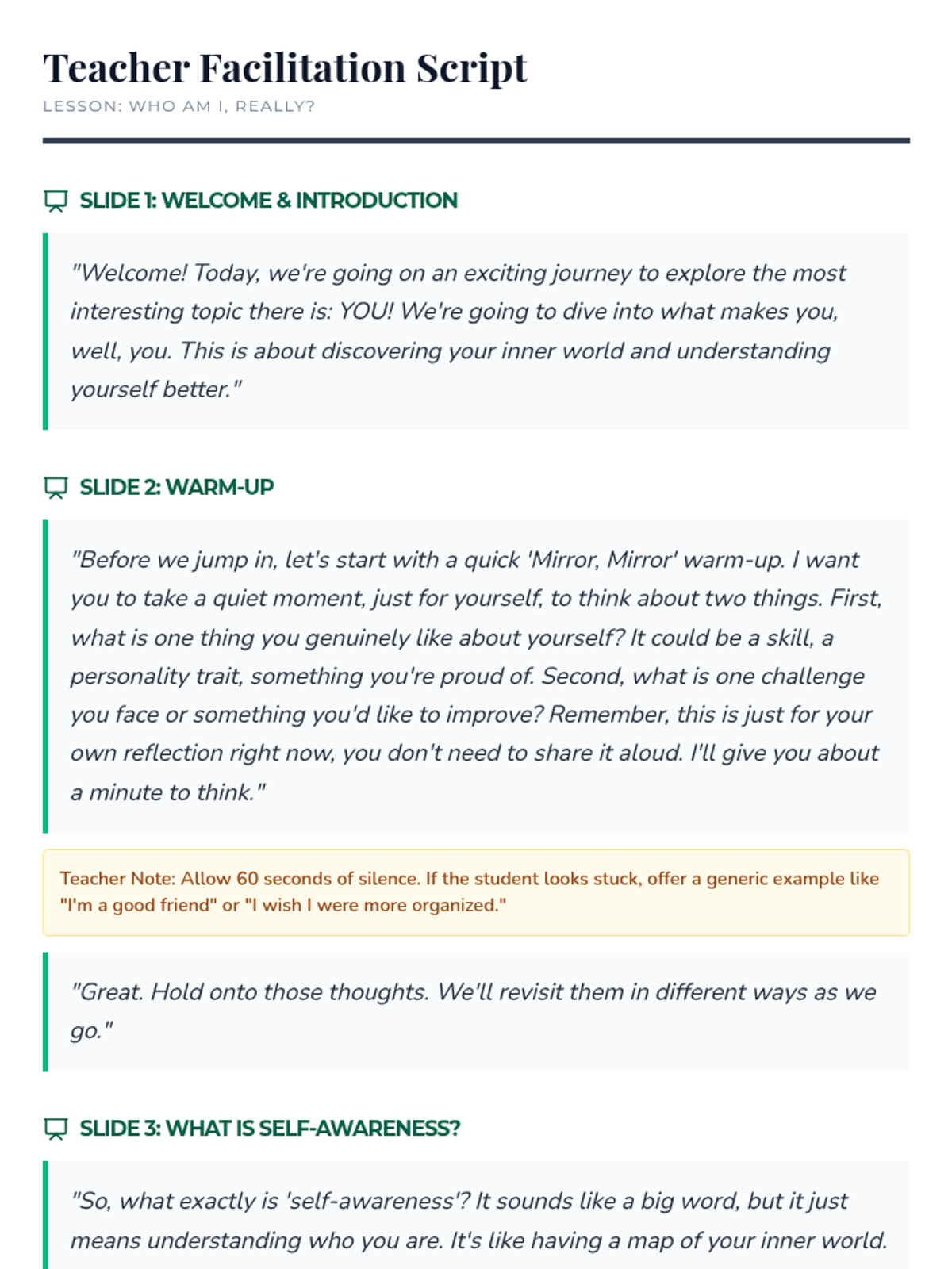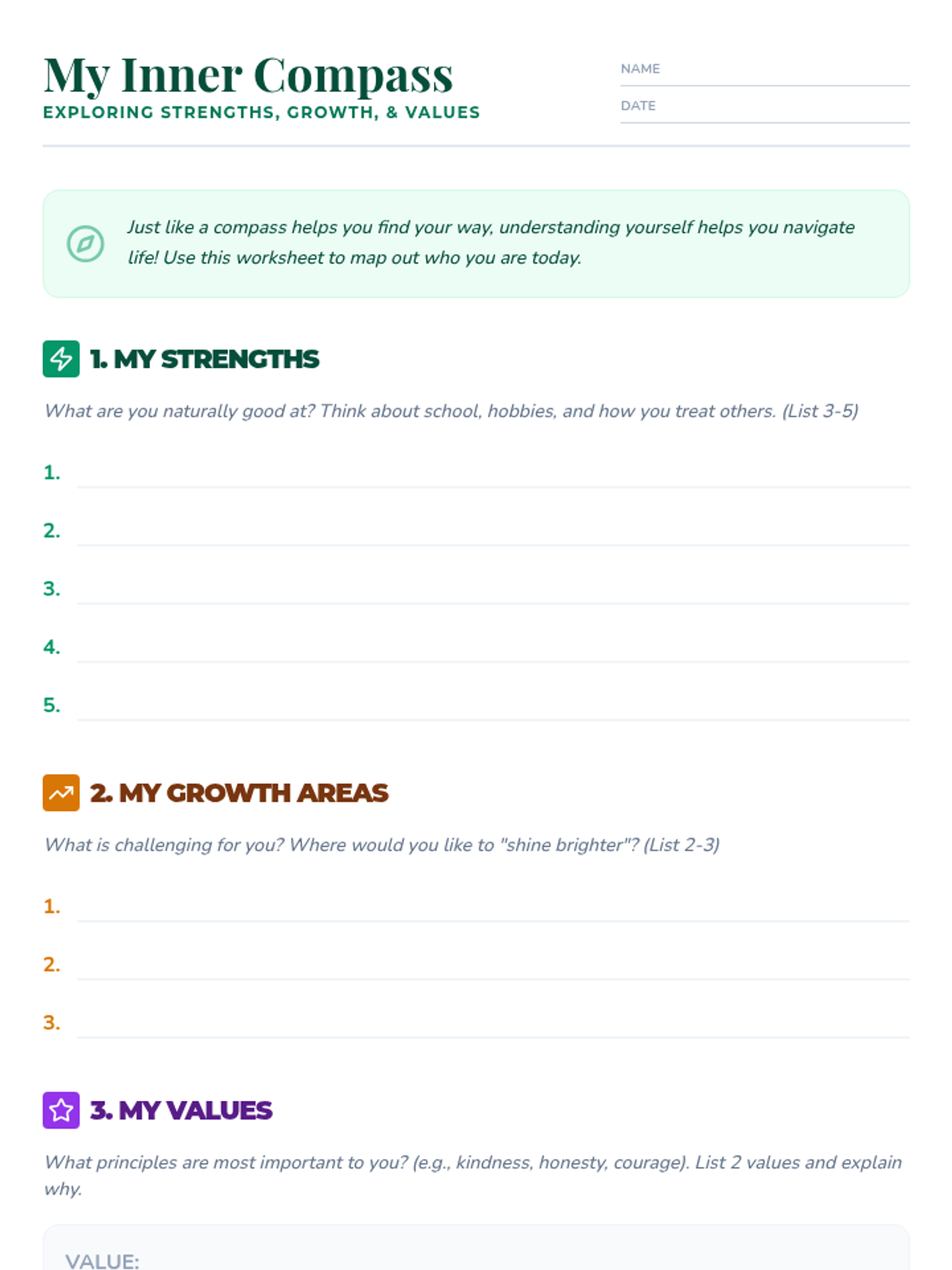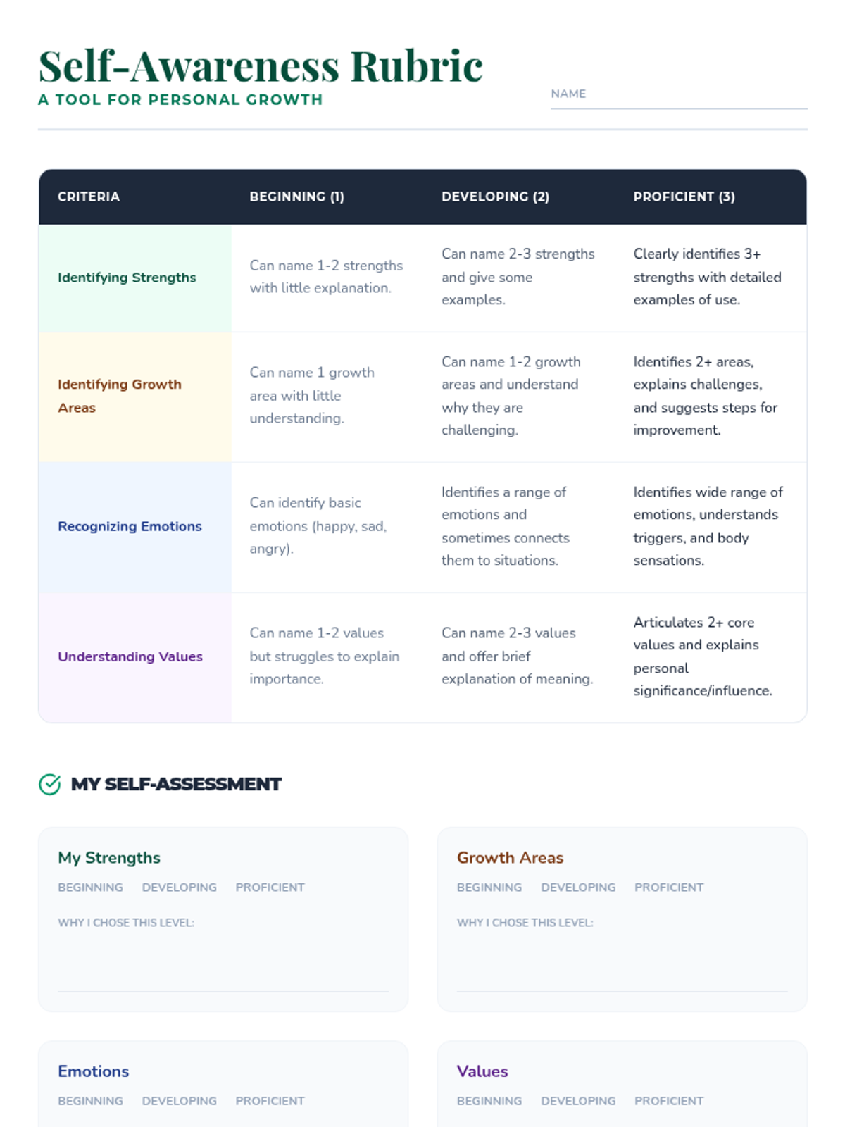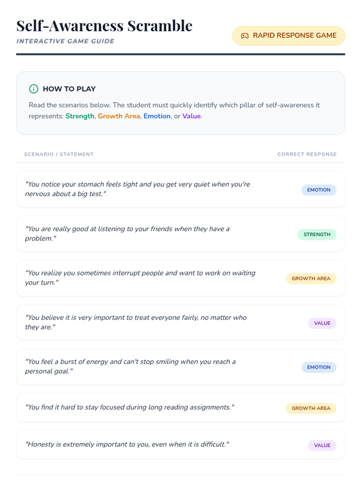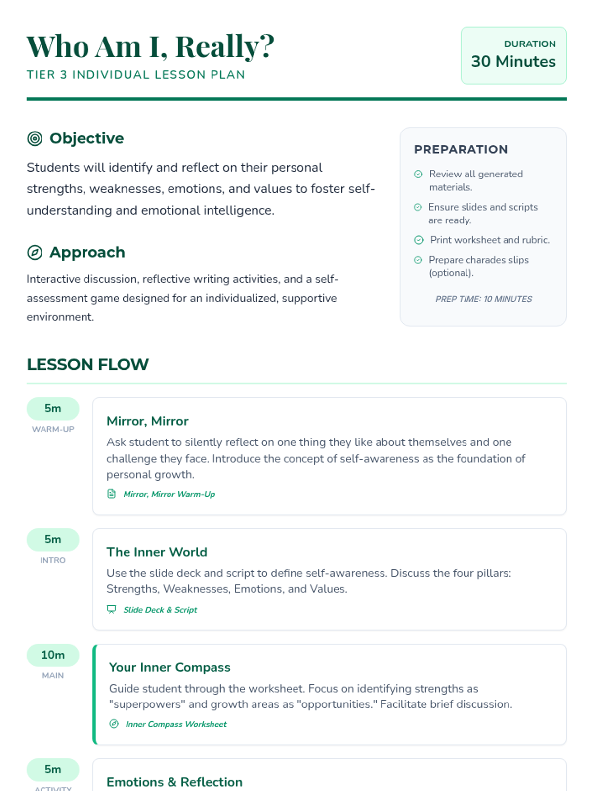 A Tier 3 individualized session for middle school students focused on developing self-awareness through exploration of strengths, growth areas, emotions, and core values.