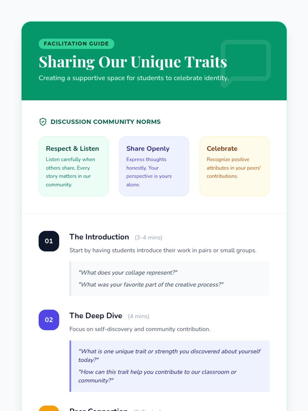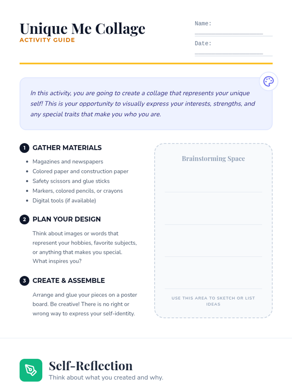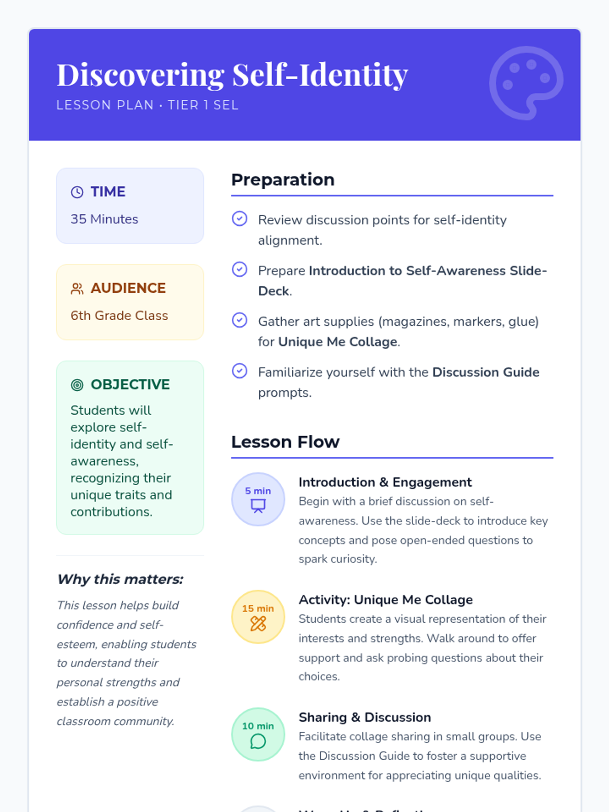 A 35-minute Tier 1 classroom lesson for 6th graders to explore self-identity through creative collage and reflective discussion, building self-awareness and classroom community.
