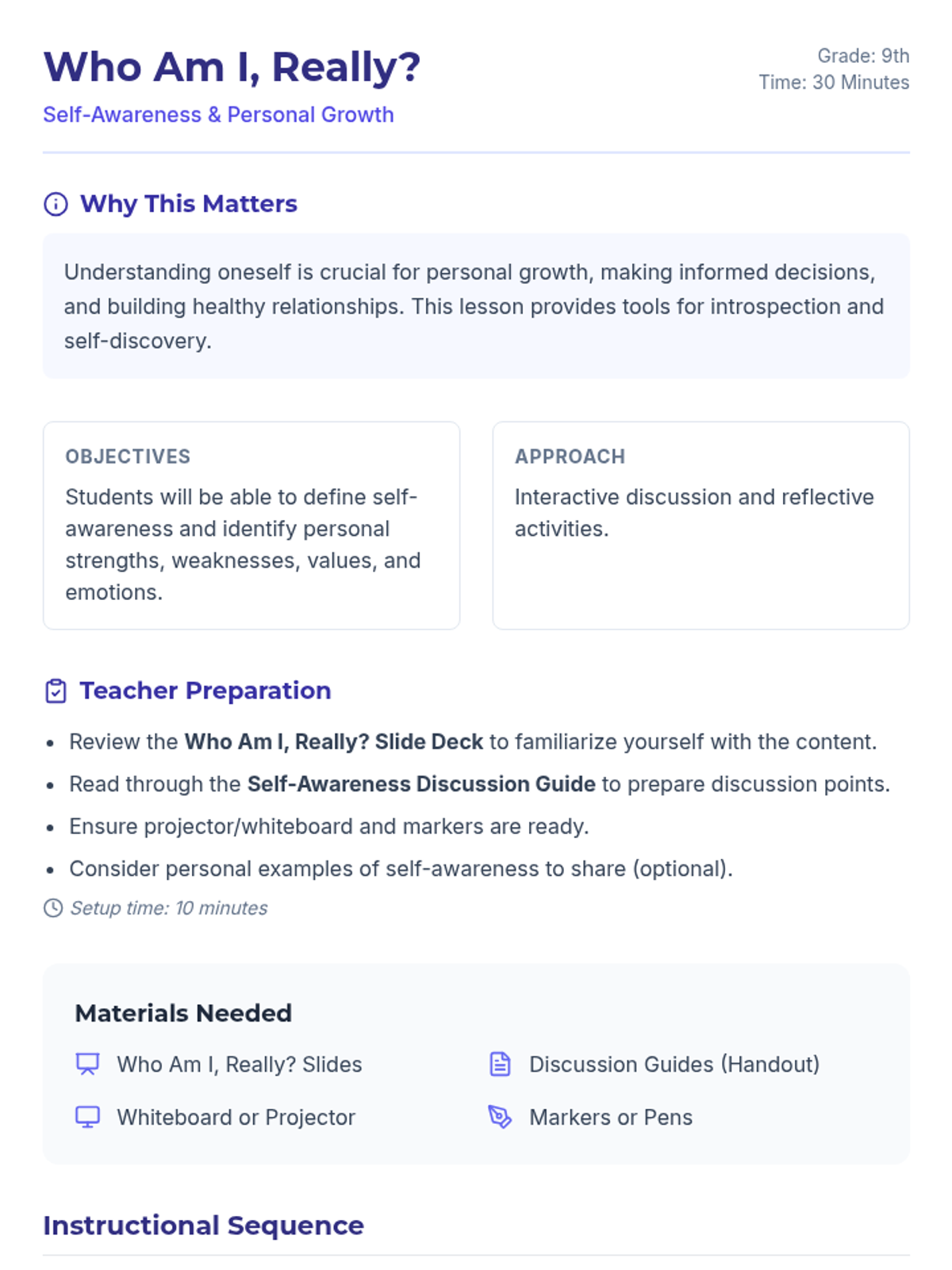 A 30-minute lesson for 9th graders to explore self-awareness, including strengths, weaknesses, values, and emotions to build confidence and better decision-making.