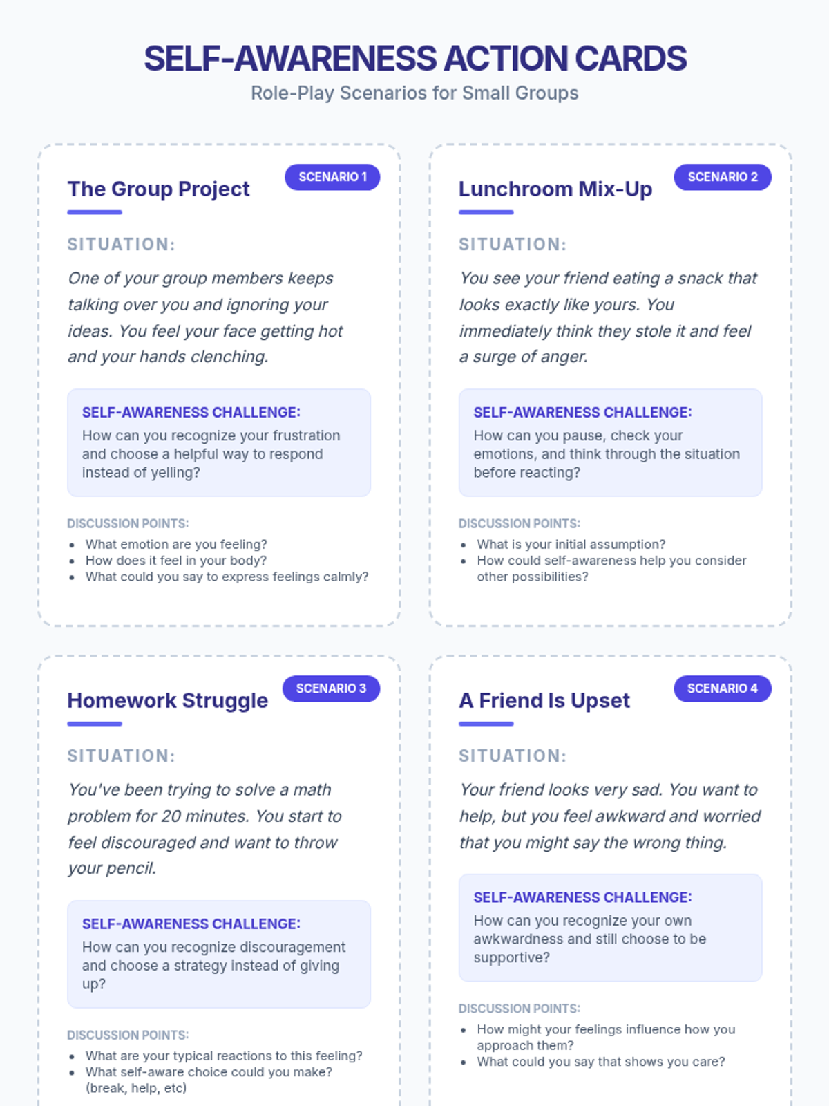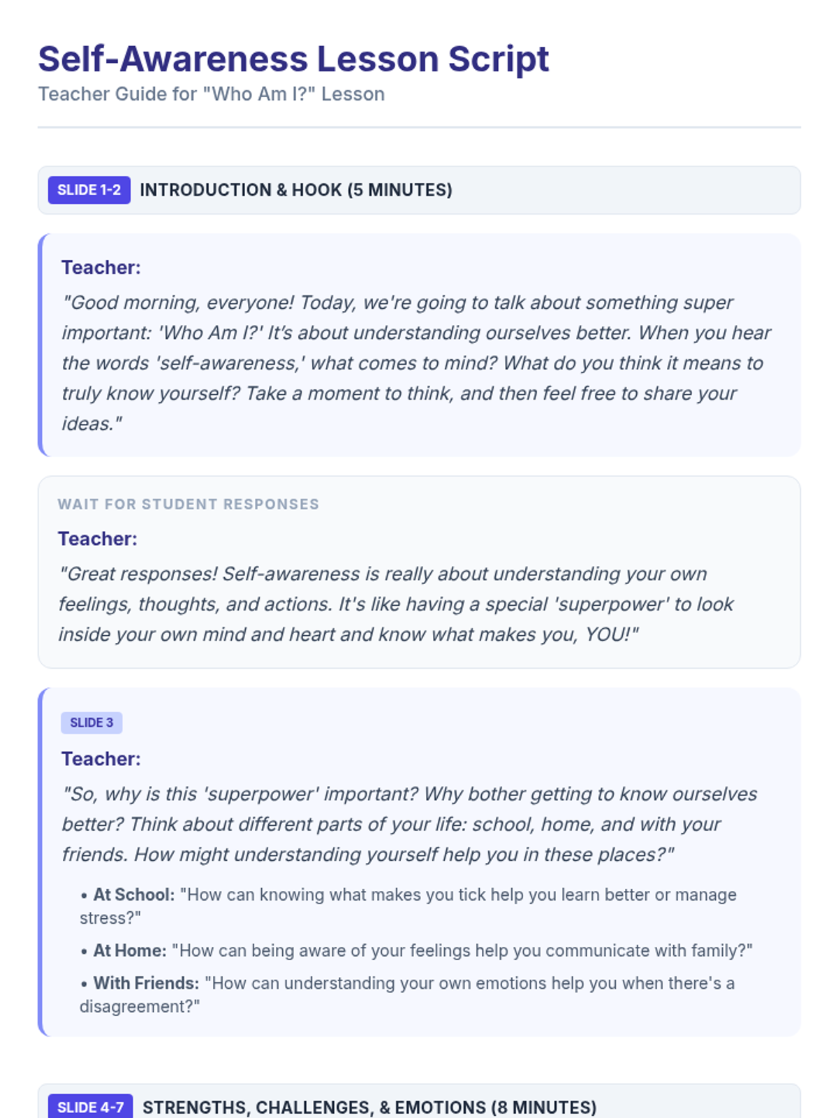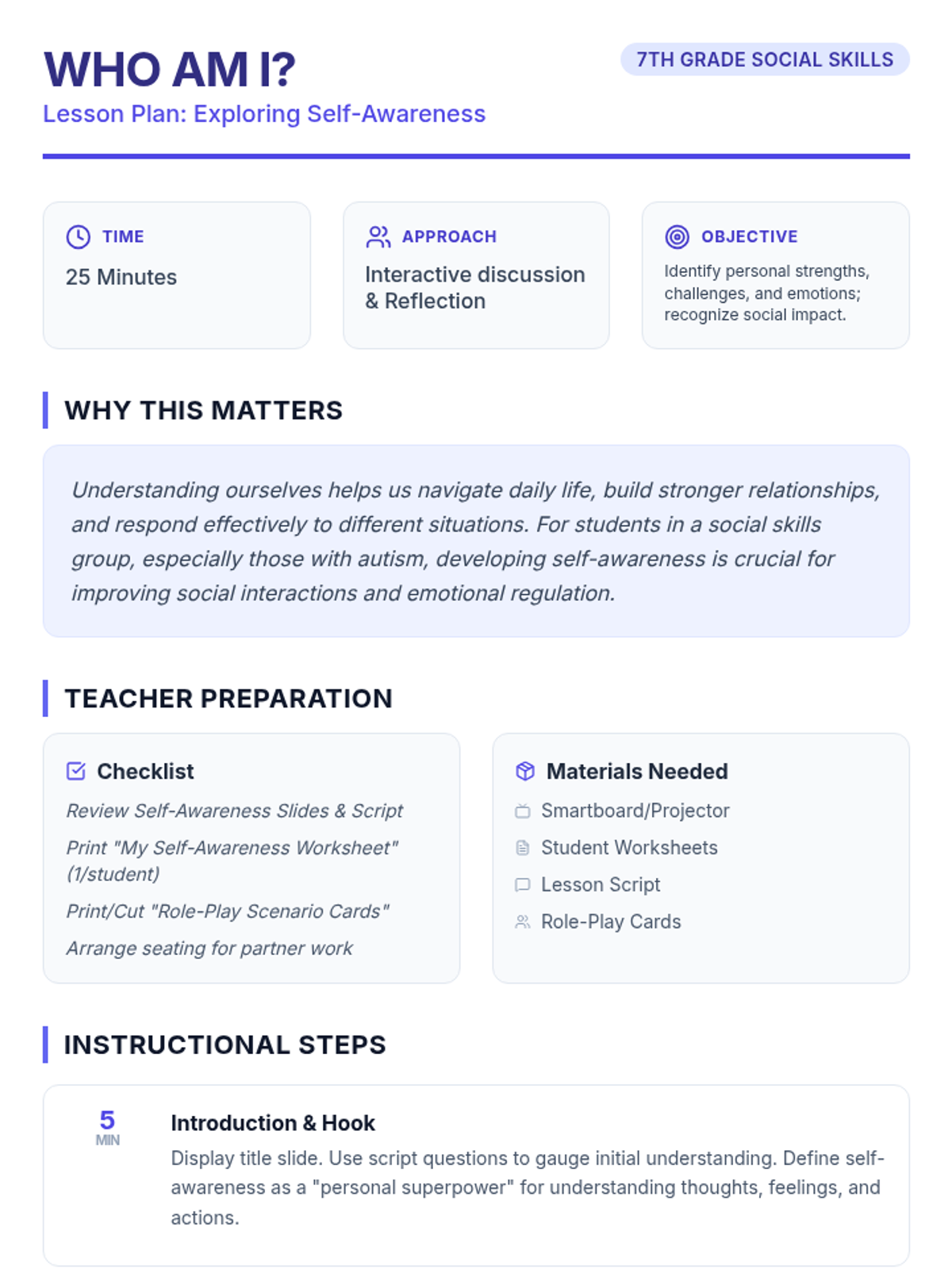 A 25-minute Tier 2 social skills lesson for 7th graders to explore self-awareness, including identifying strengths, challenges, and emotions to improve social interactions.