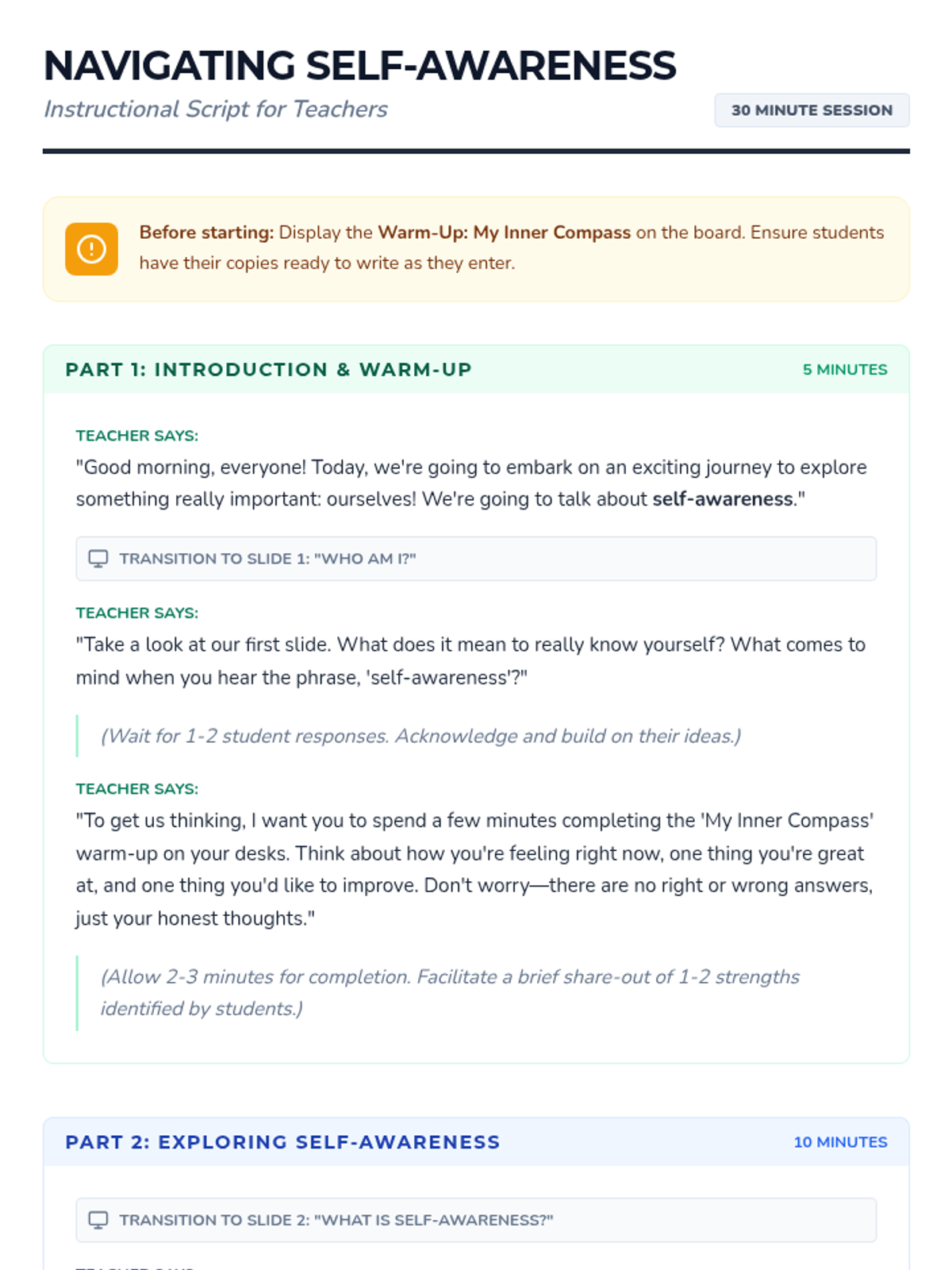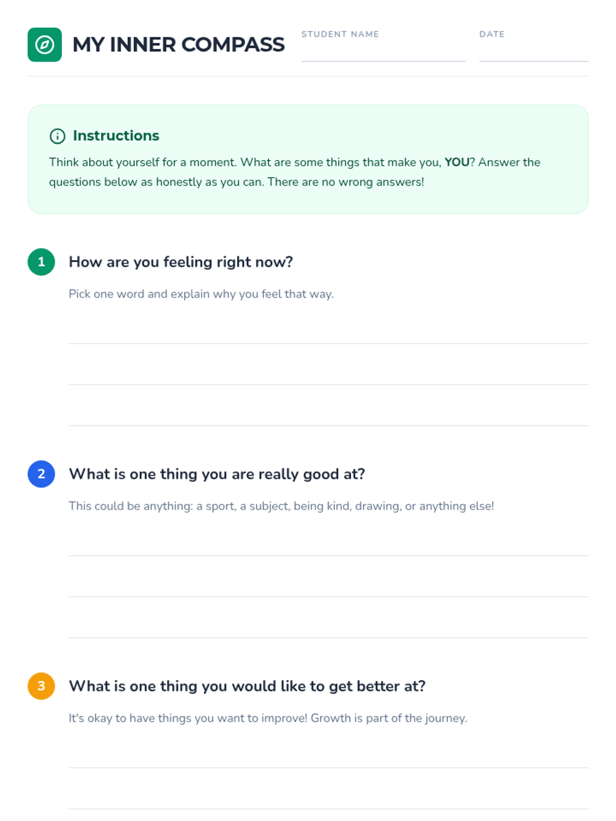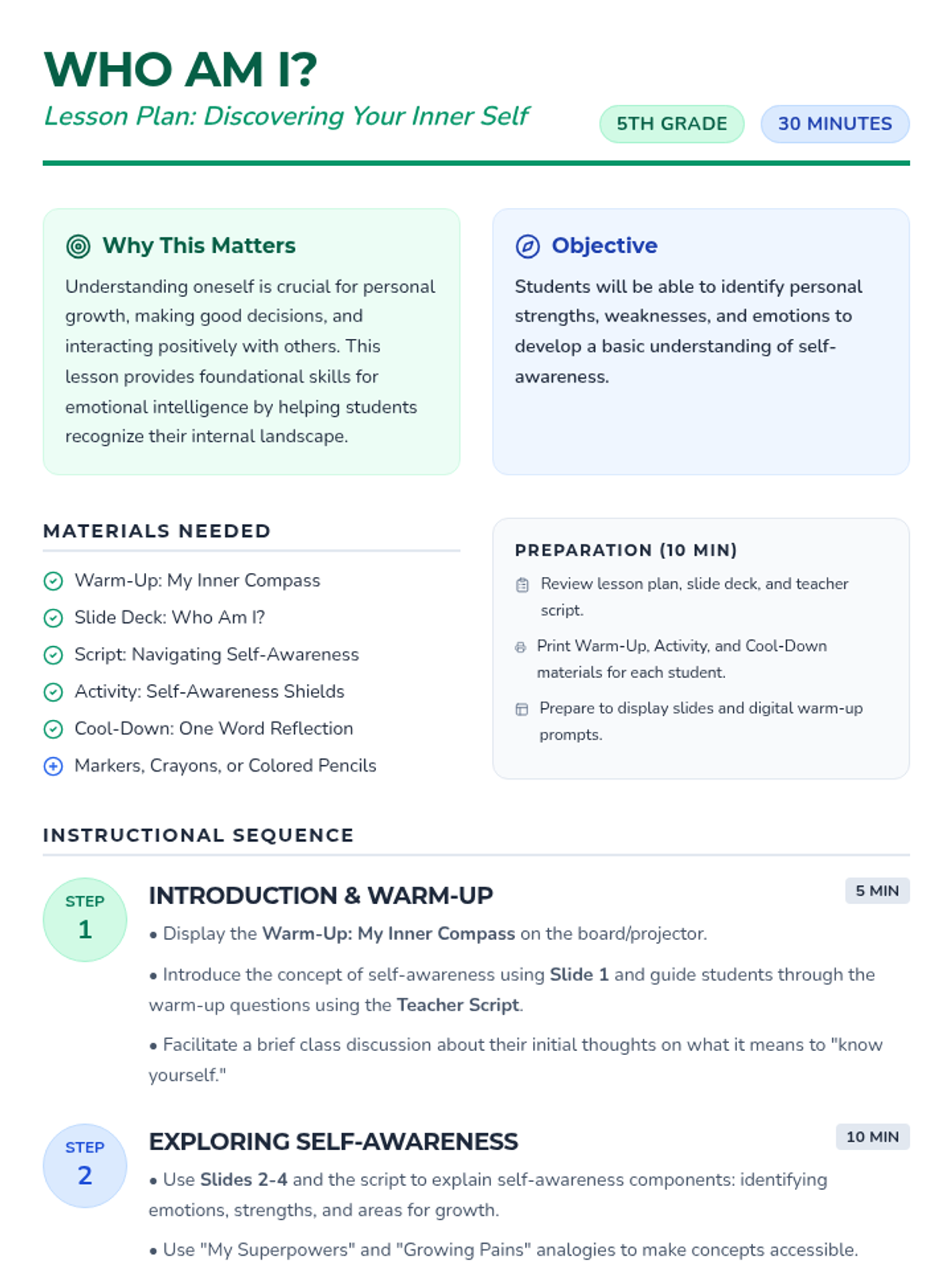 A 30-minute self-awareness lesson for 5th graders to explore their feelings, strengths, and growth areas through reflection and creative activity.