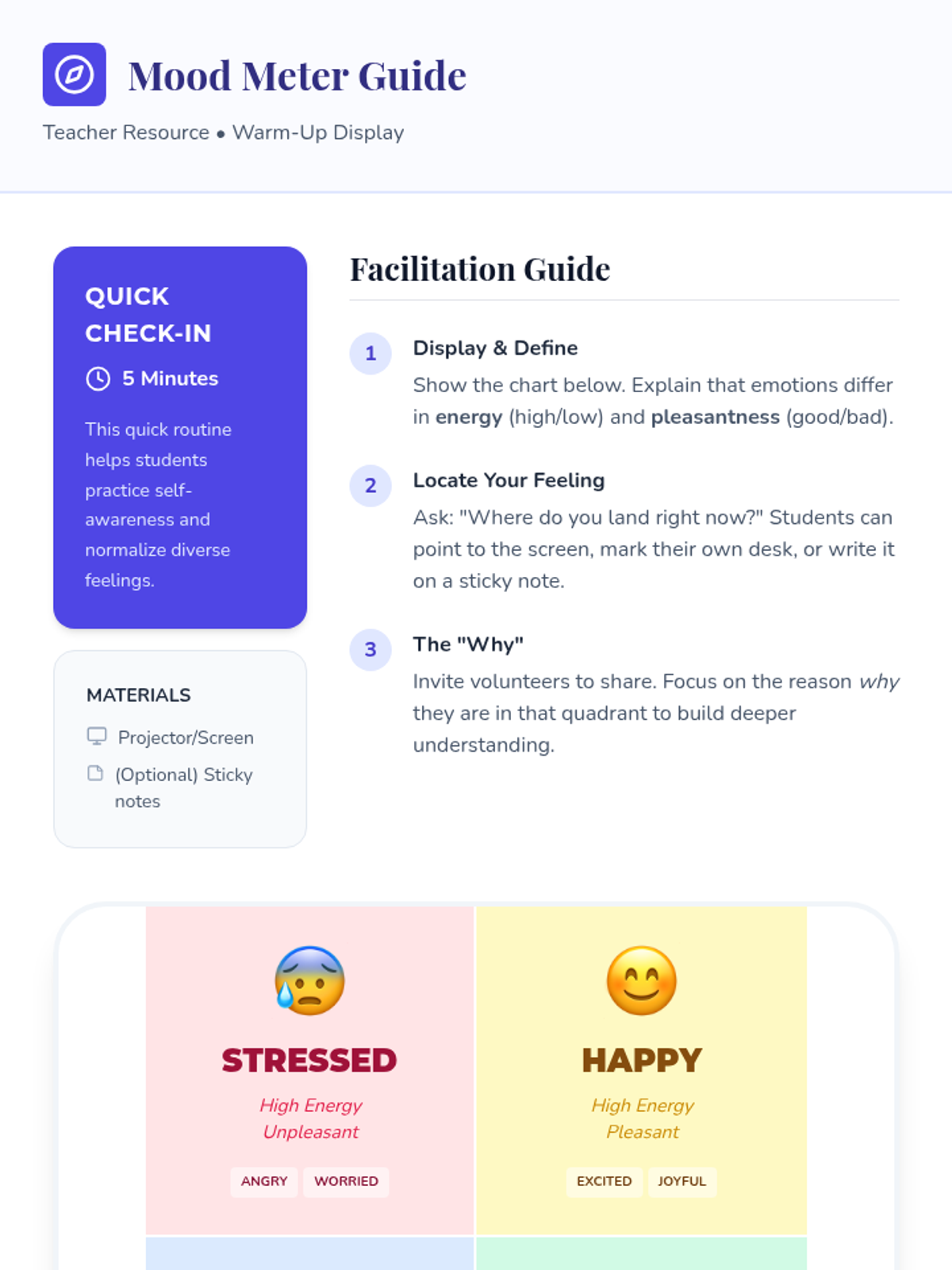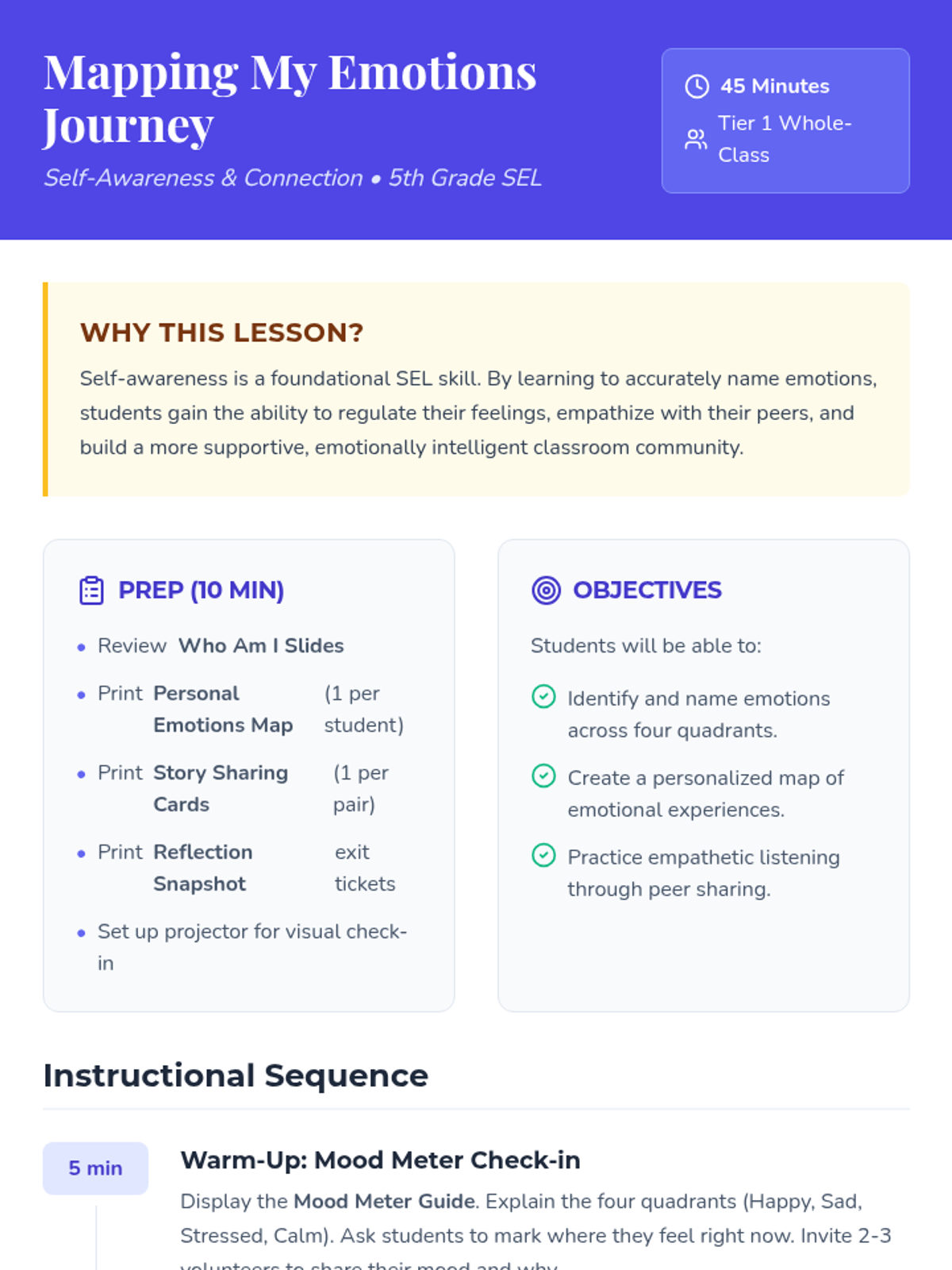 A 45-minute Social-Emotional Learning lesson for 5th graders focused on identifying and naming emotions using a "Mood Meter" approach to build self-awareness and empathy.