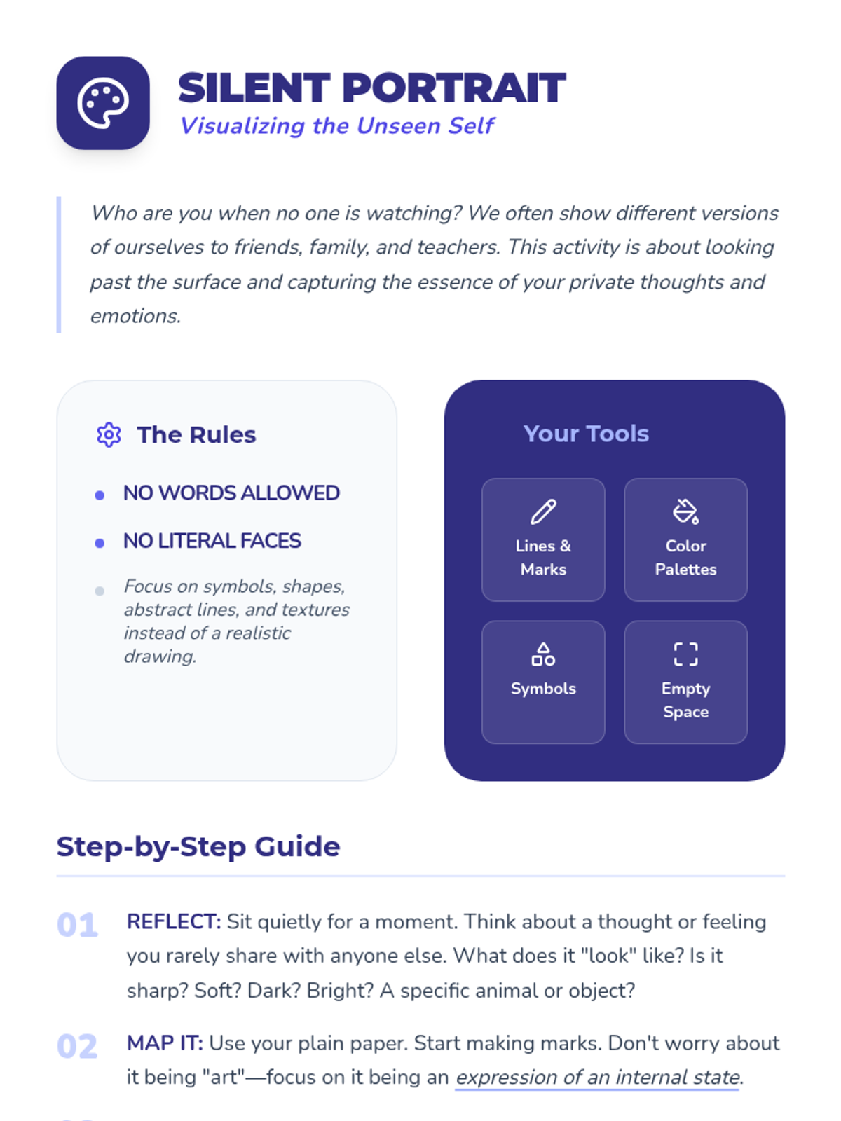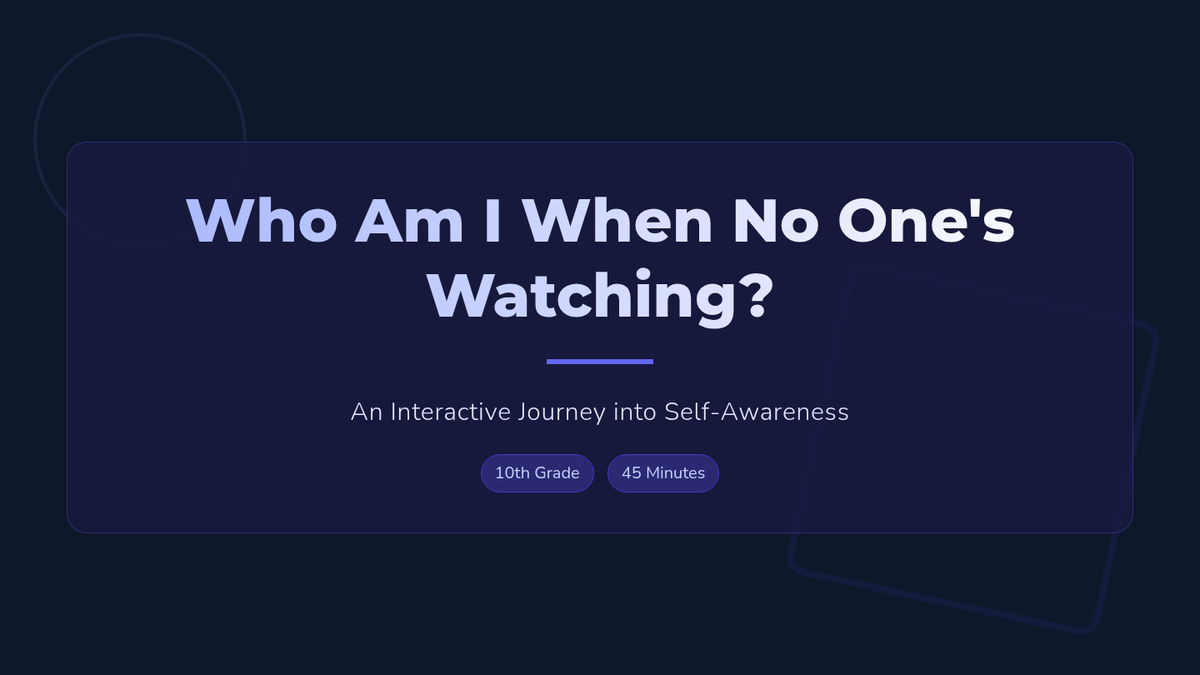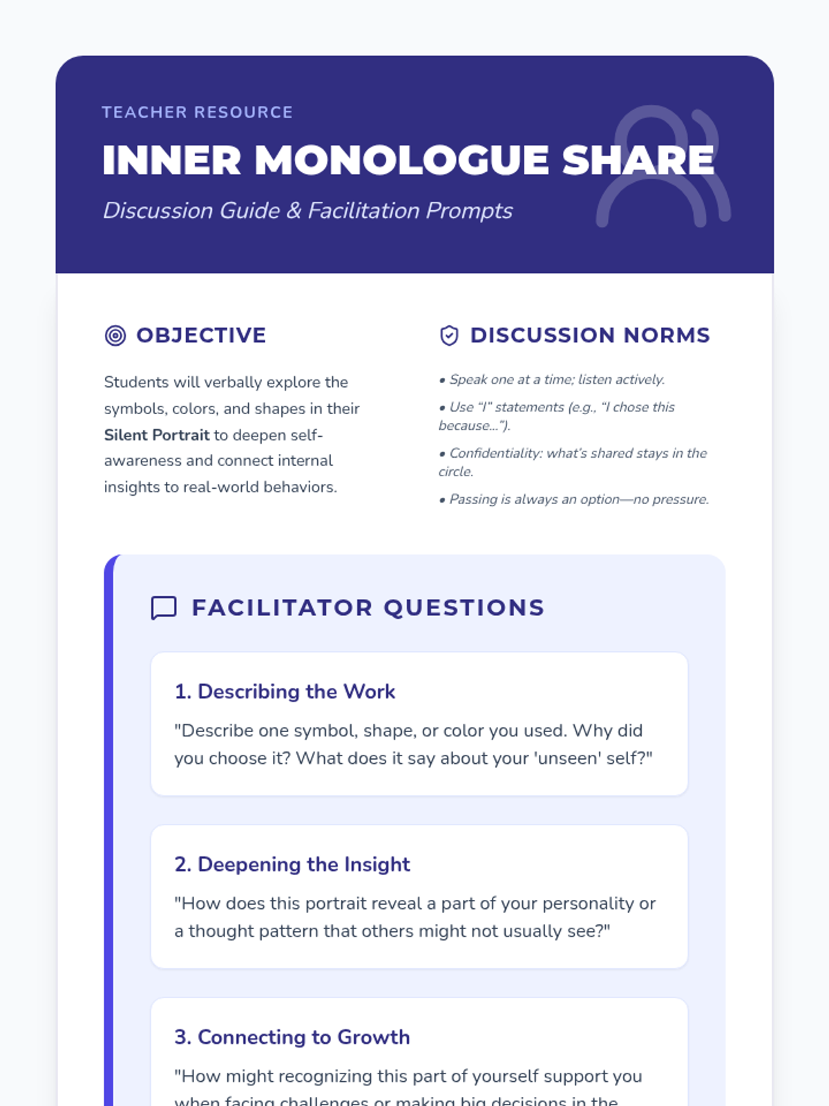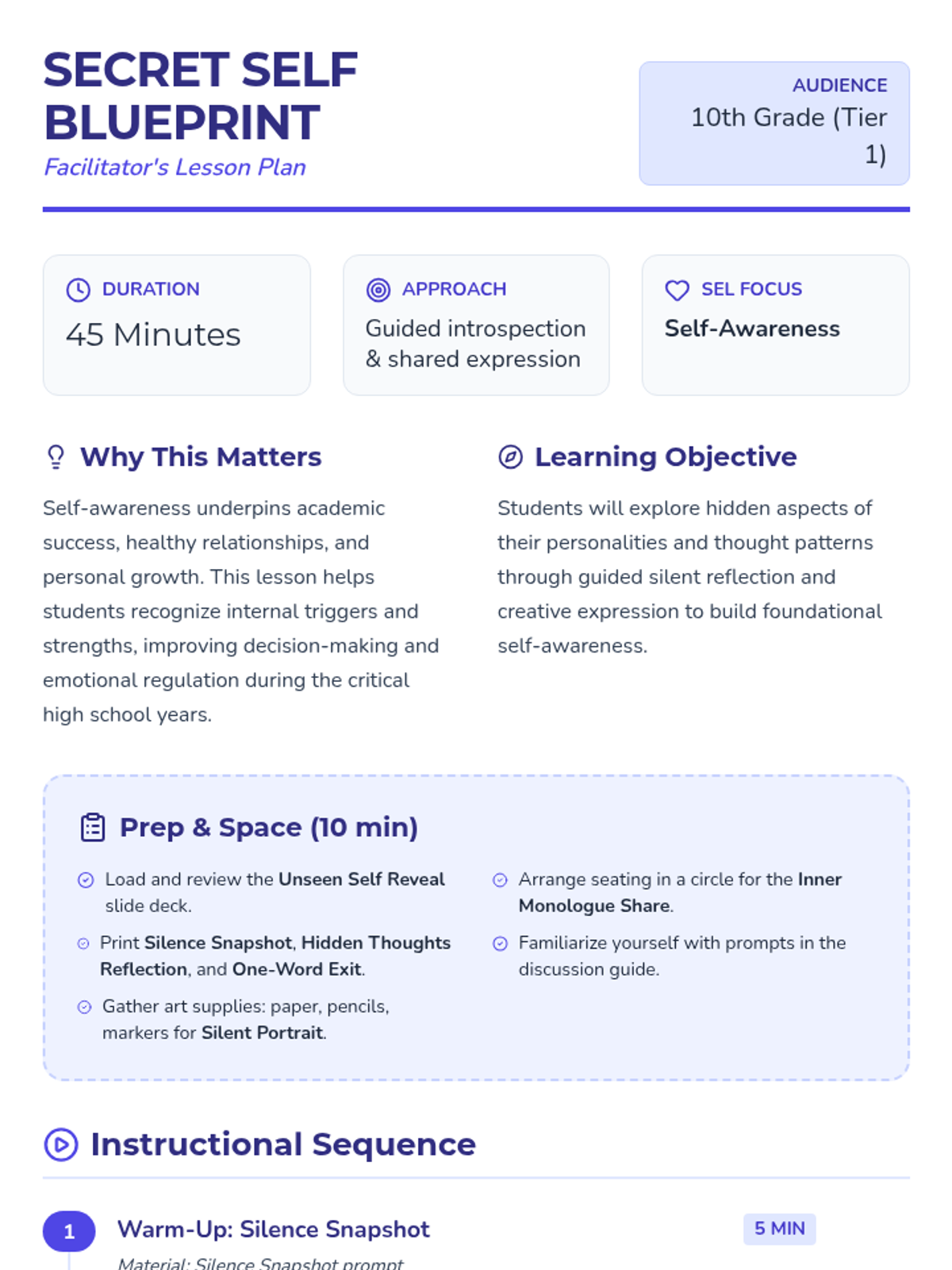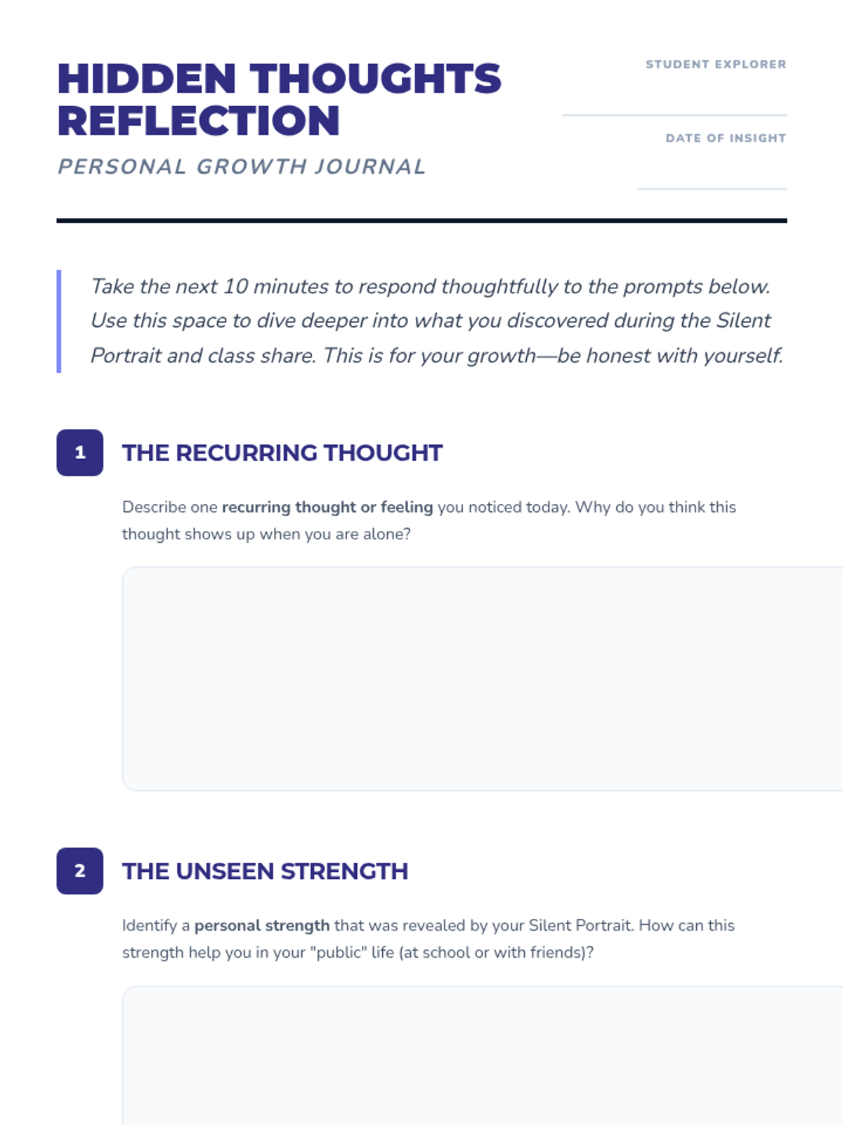 A 45-minute SEL lesson for 10th graders exploring self-awareness through silent reflection, creative expression, and group discussion. Students investigate their 'hidden' thoughts and personality traits to build a foundation for academic and personal growth.