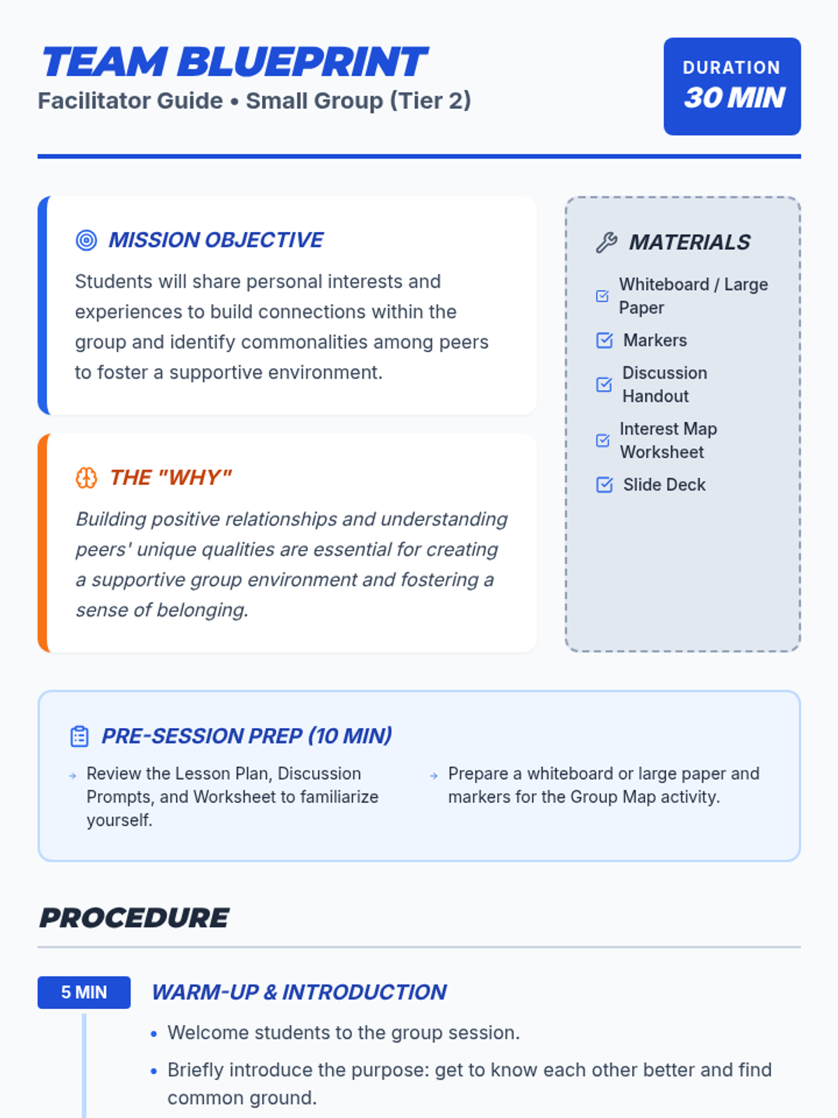 A 30-minute Tier 2 small group session for 6th-grade boys to foster connection, build group dynamics, and identify common interests through guided discussion and collaborative mapping.