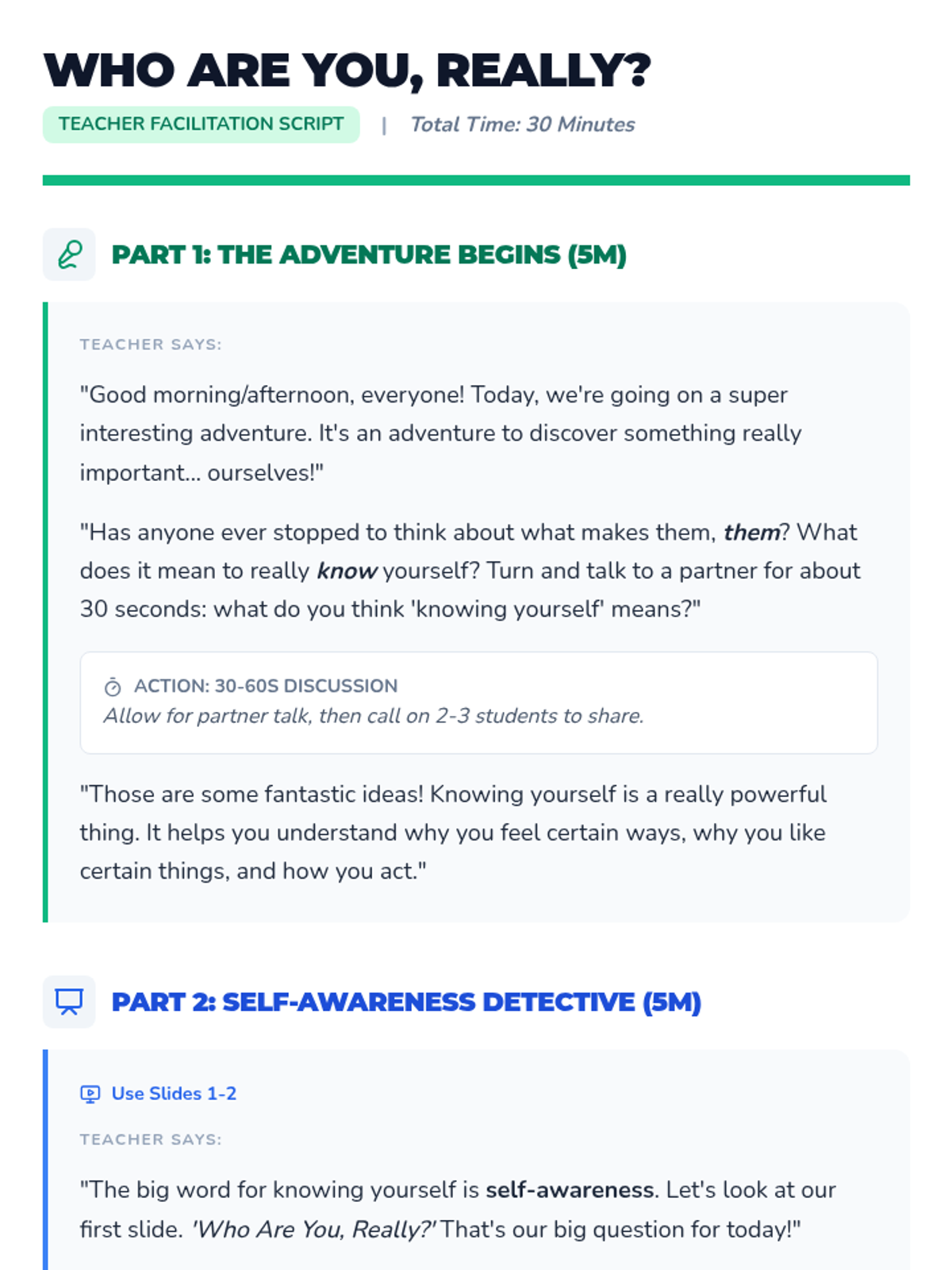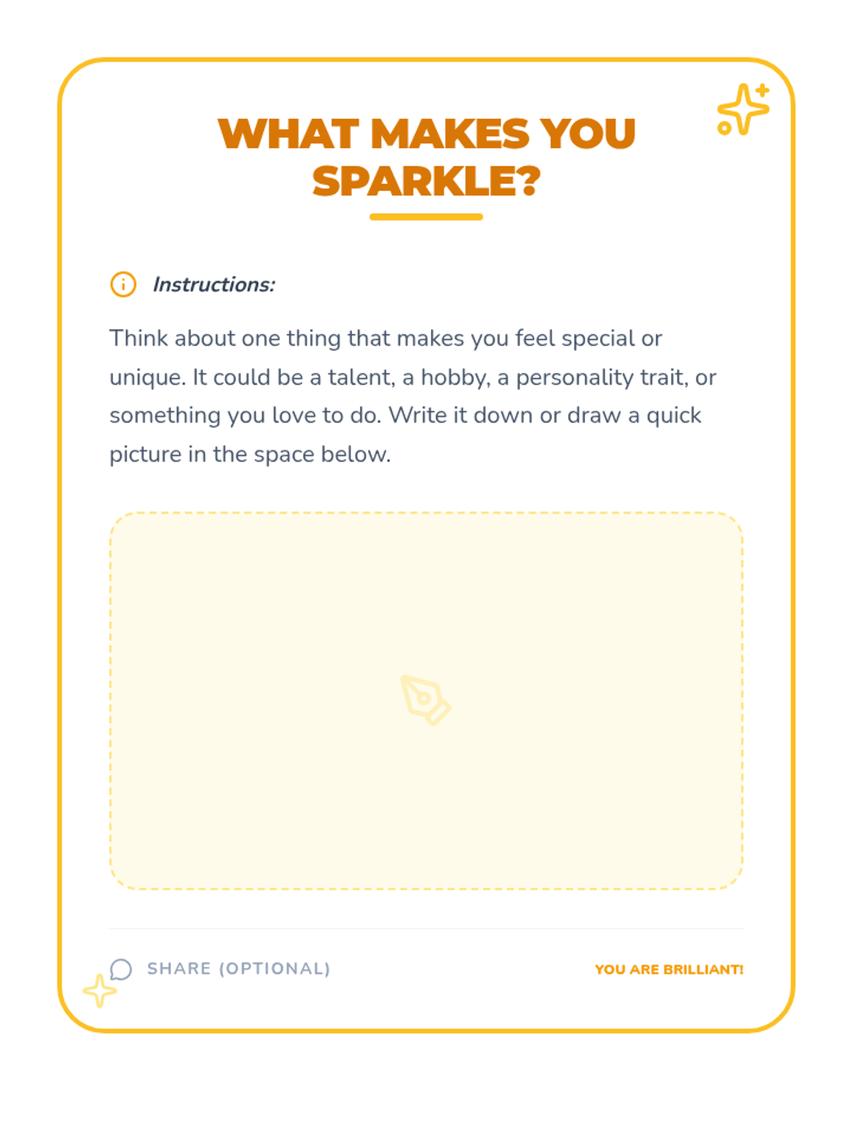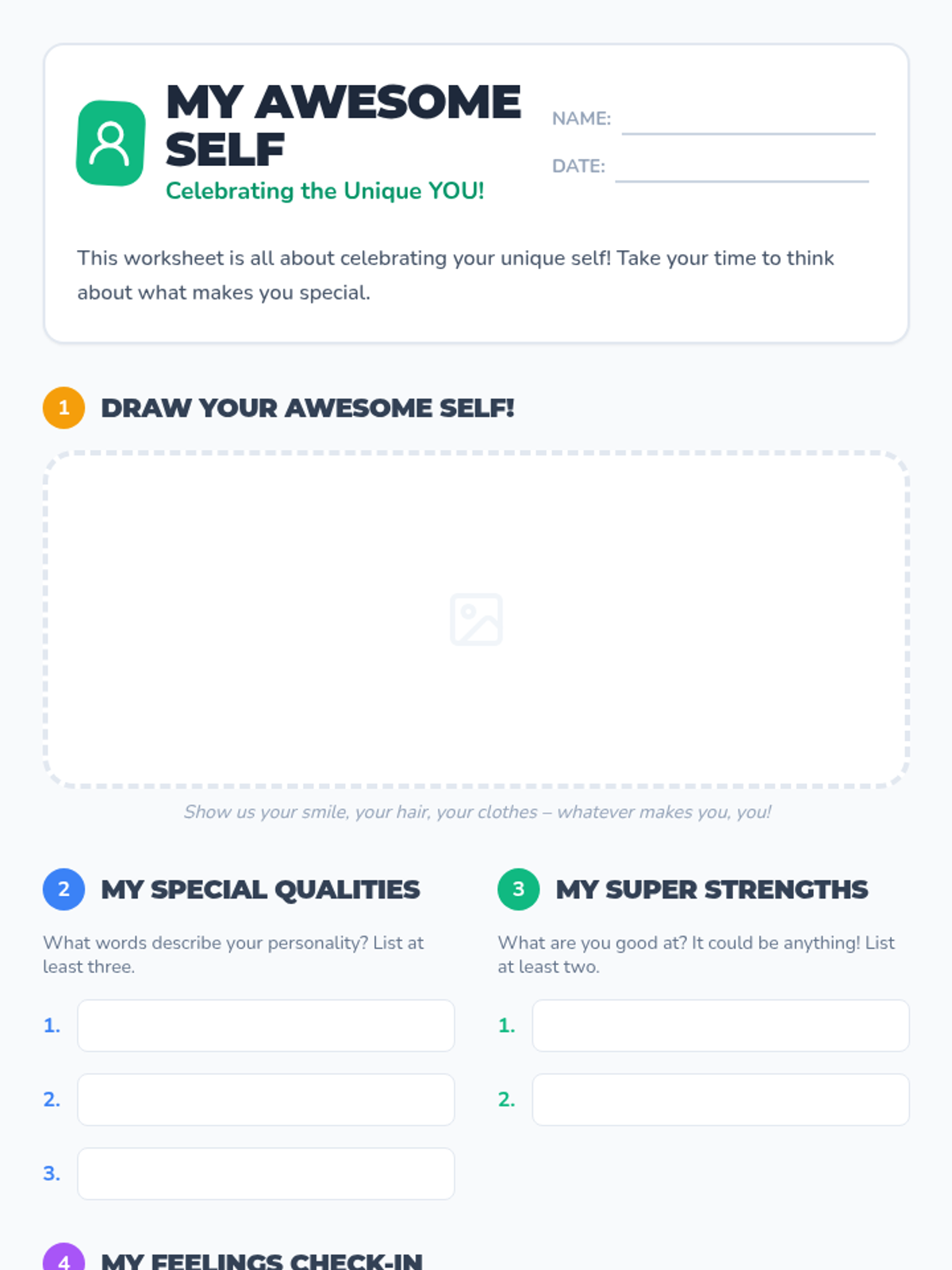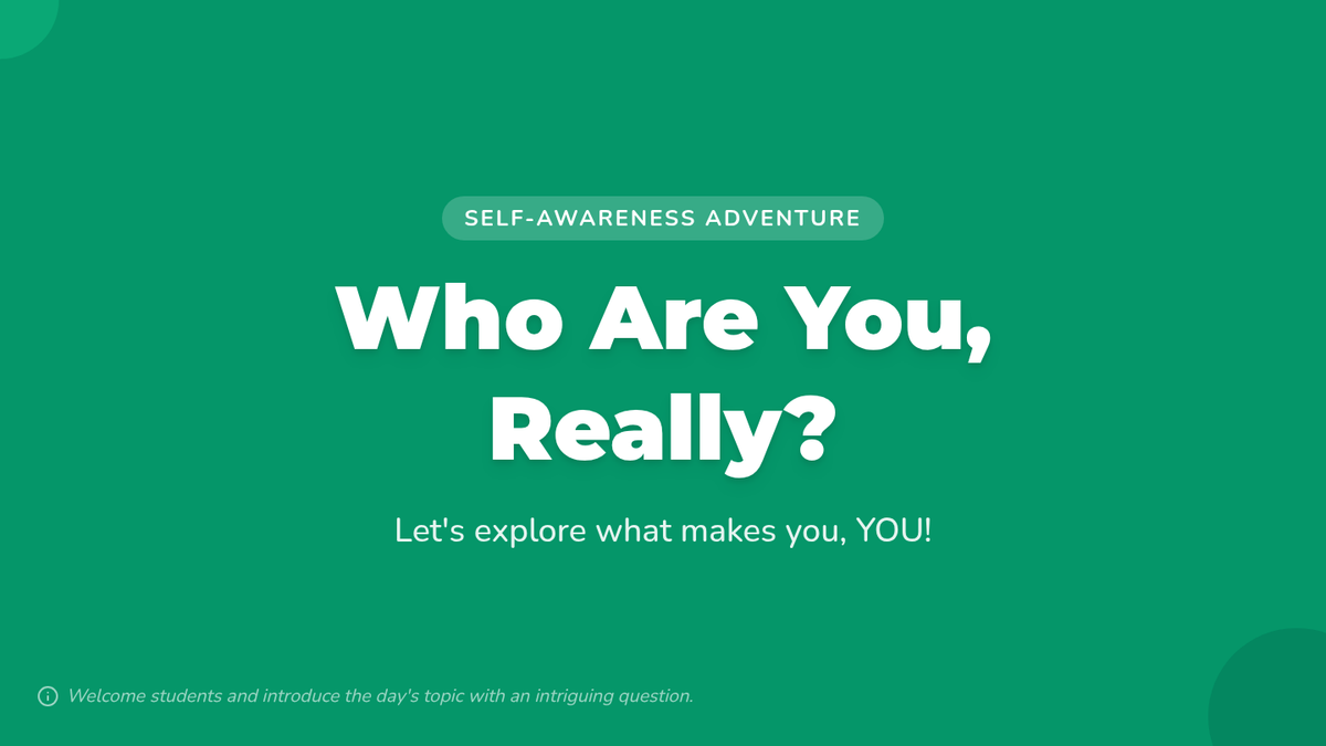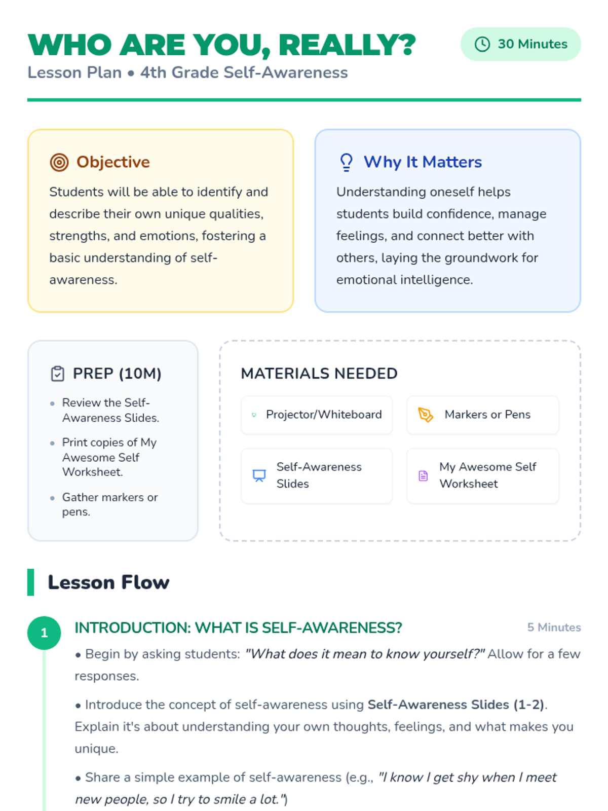 A foundational self-awareness lesson for 4th graders that explores unique qualities, emotions, and strengths through interactive discussion and creative reflection.