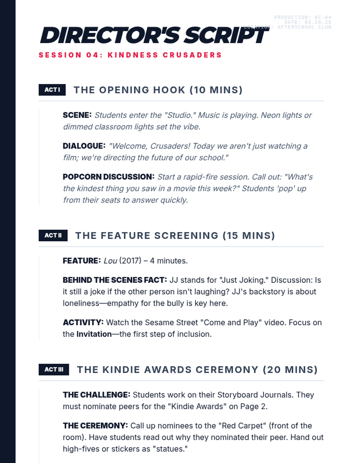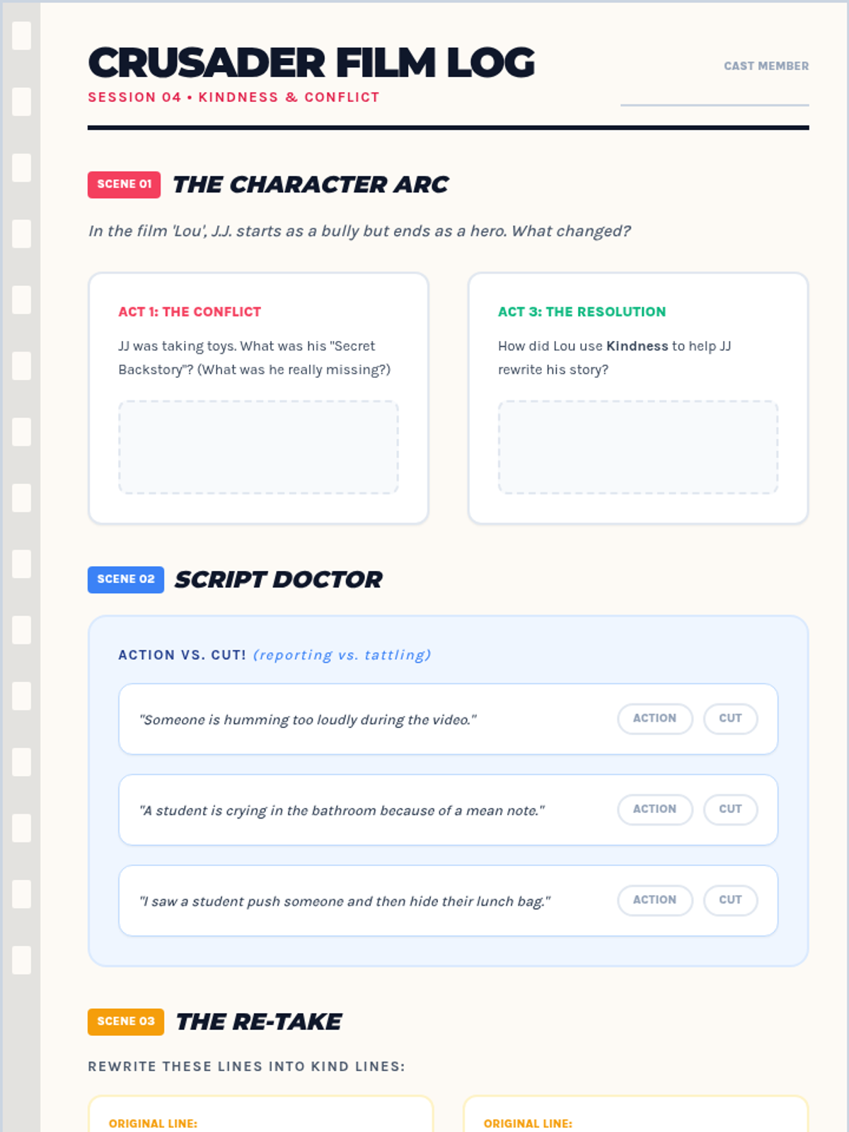 A social-emotional learning lesson focused on the Pixar short 'Lou,' helping students distinguish between bullying and conflict, and practicing proactive kindness.