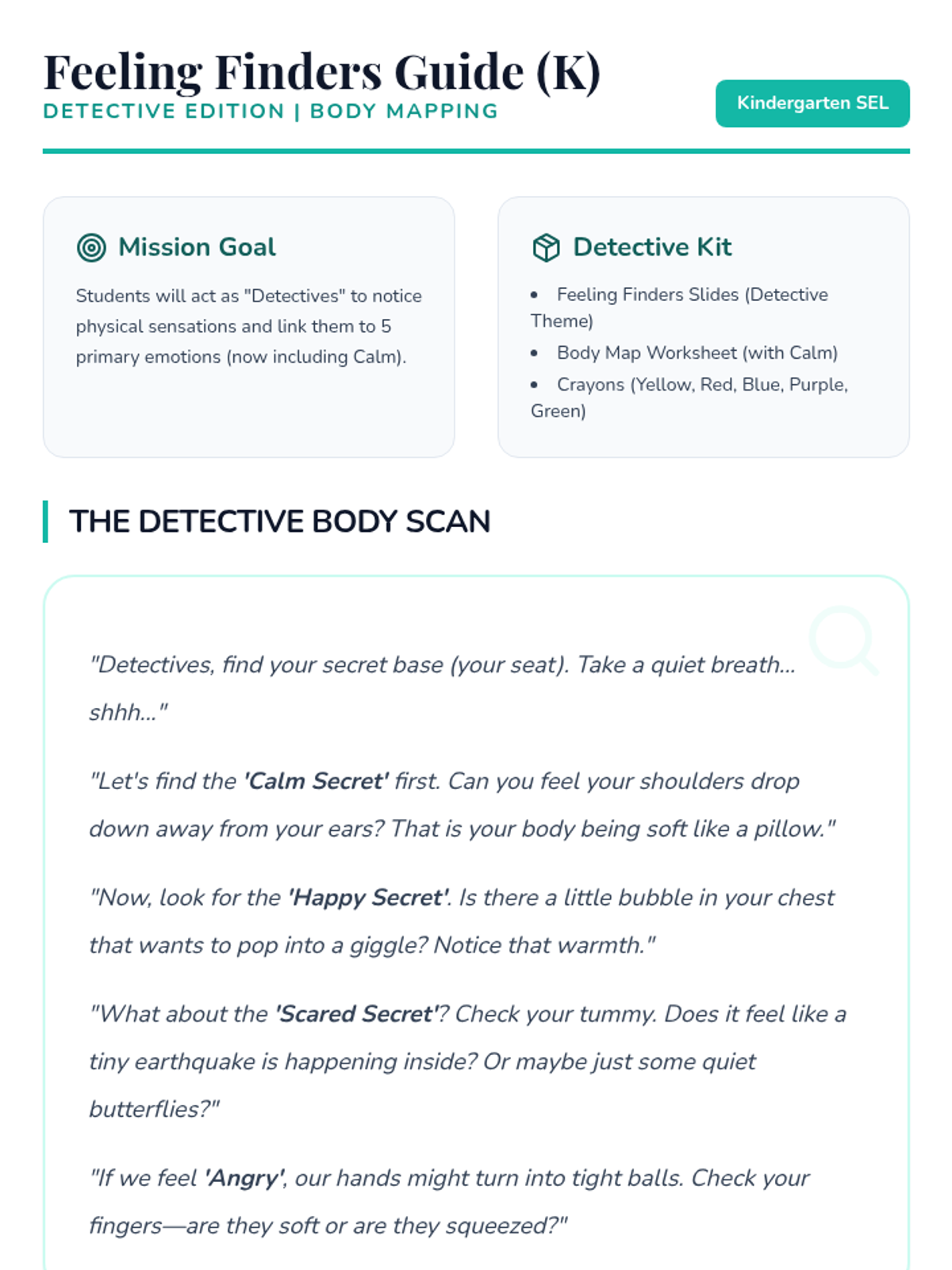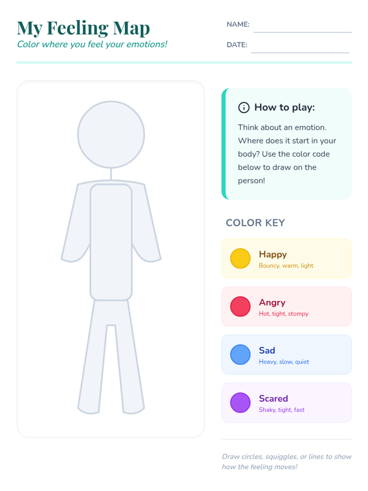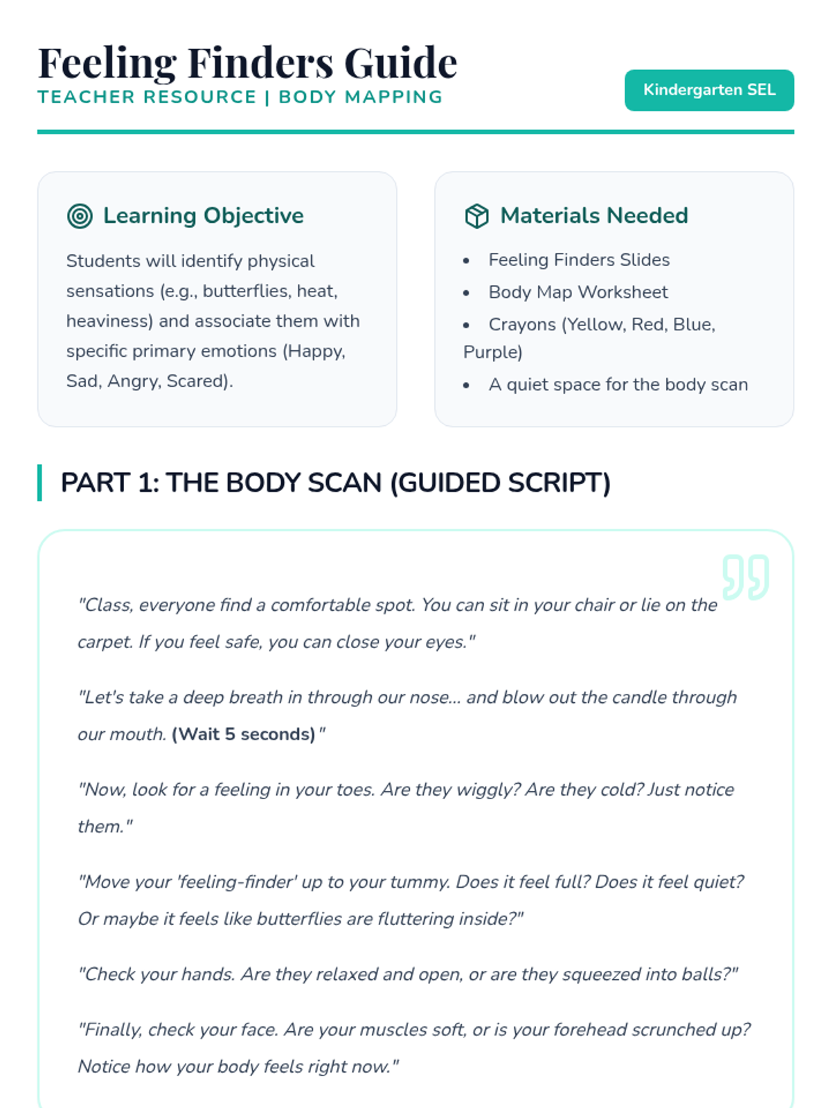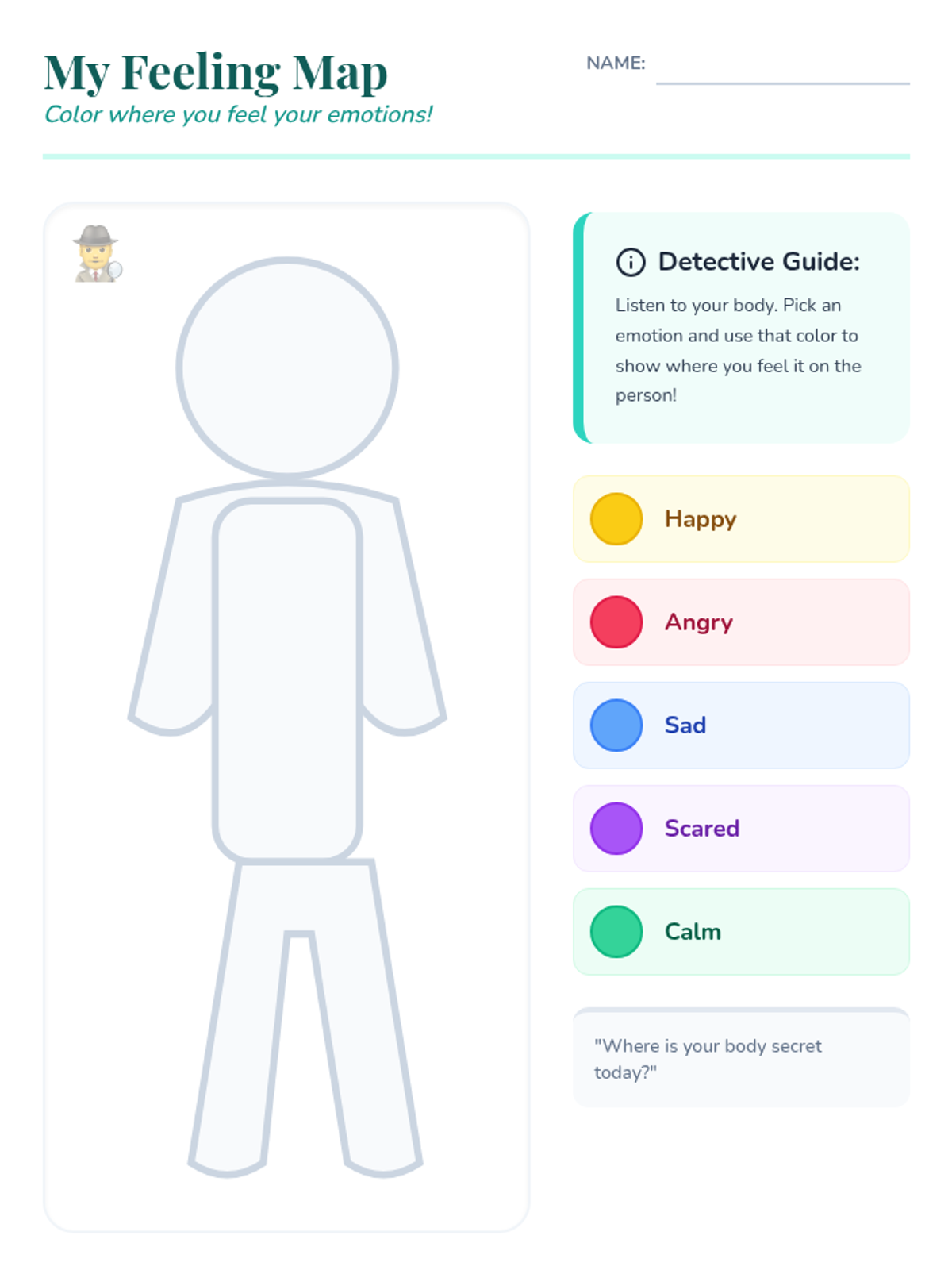 A foundational lesson for kindergarteners to identify and locate physical sensations associated with primary emotions (Happy, Sad, Angry, Scared). Students will learn to 'map' their feelings to specific parts of their bodies.