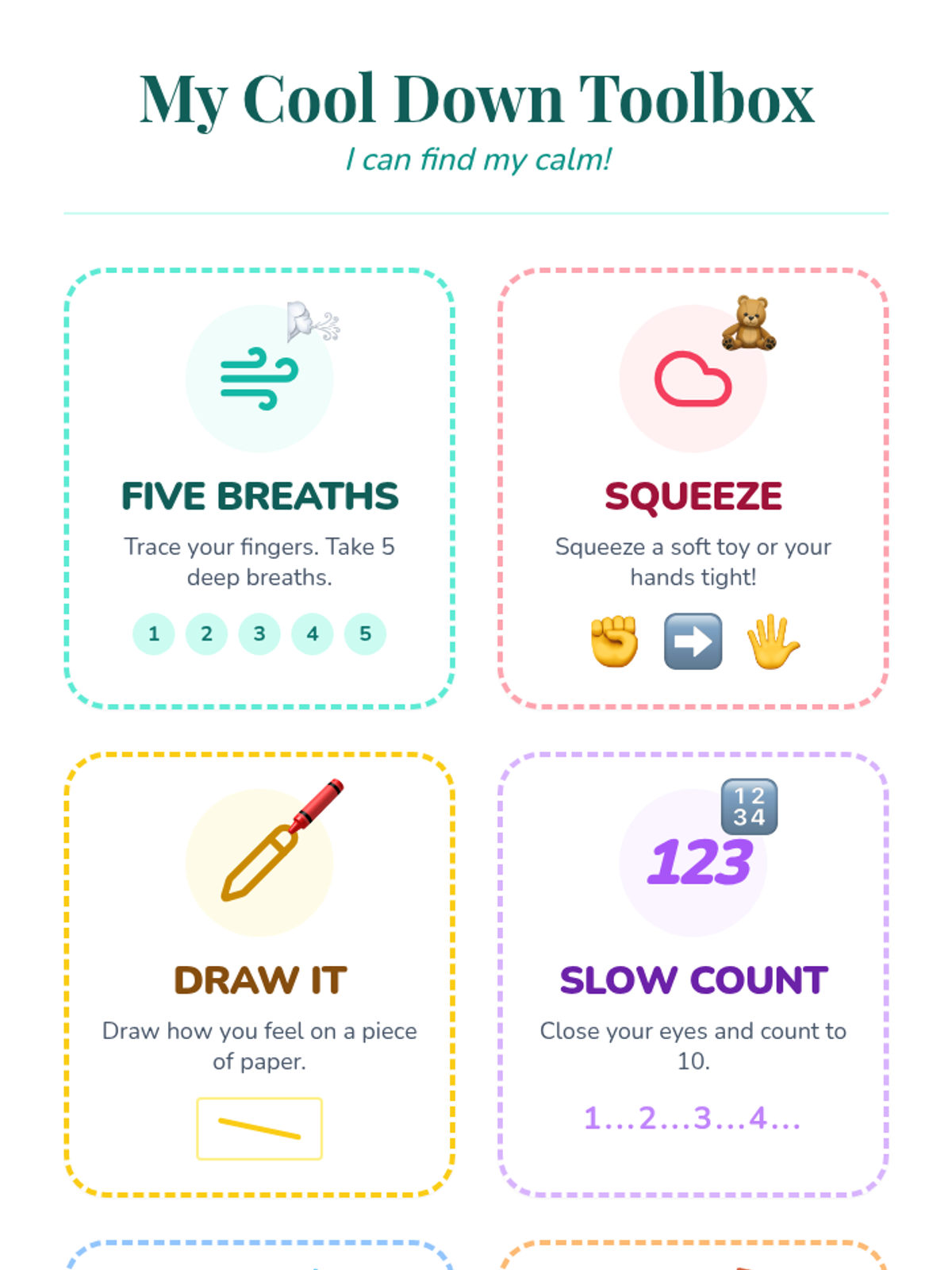 A foundational lesson on self-regulation divided into three 10-minute segments focusing on body awareness, calming tools, and scenario-based practice.