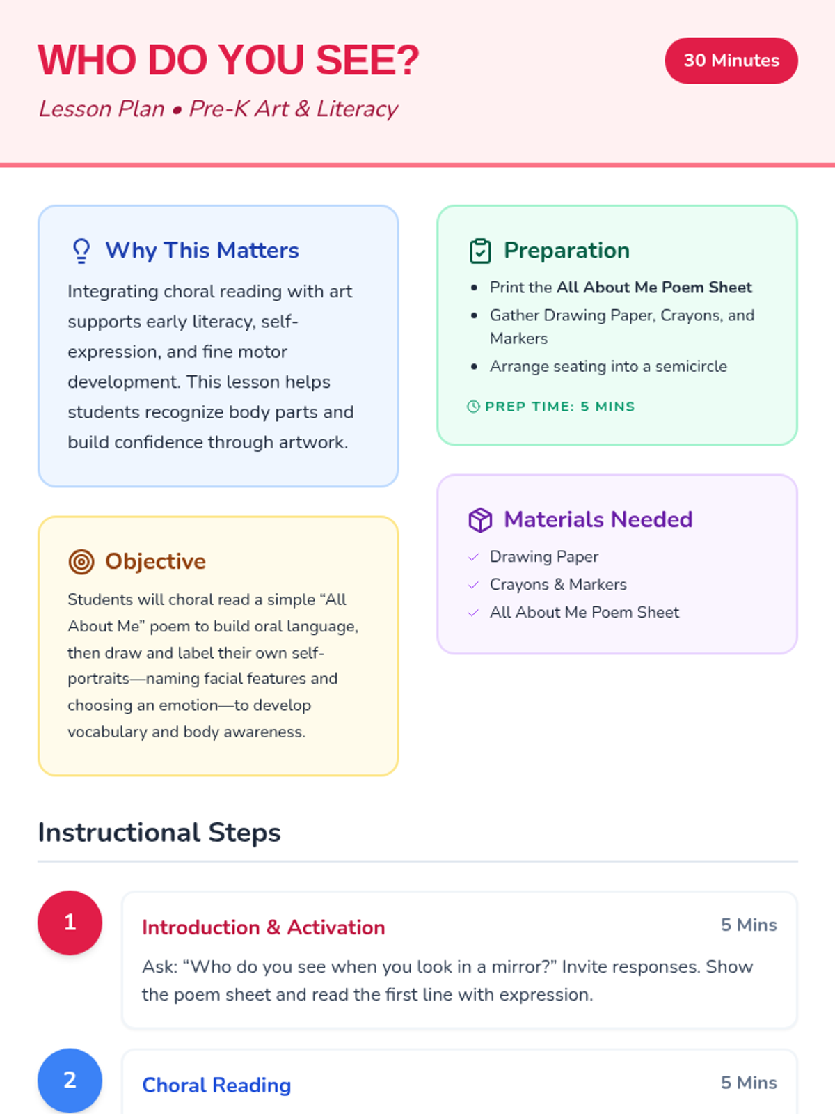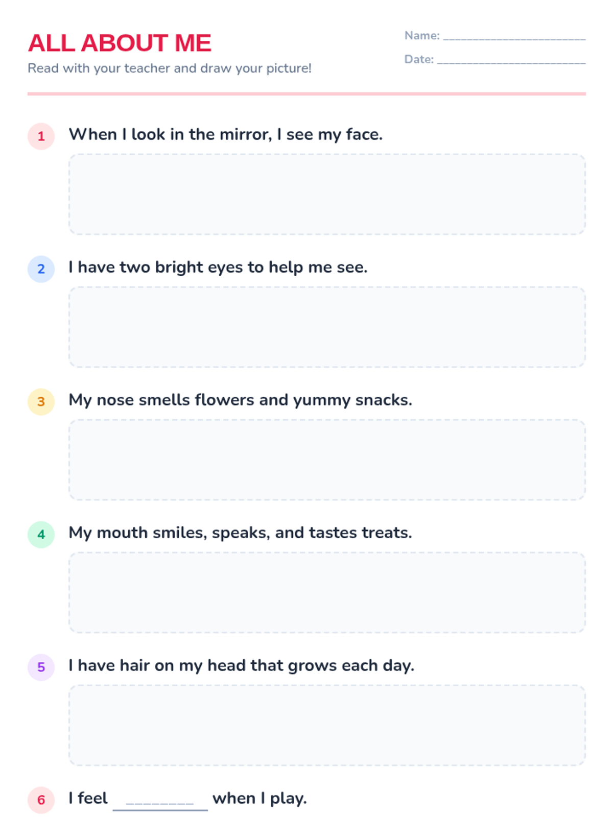 Students build confidence through an 'All About Me' poem and create detailed self-portraits labeling facial features and emotions.