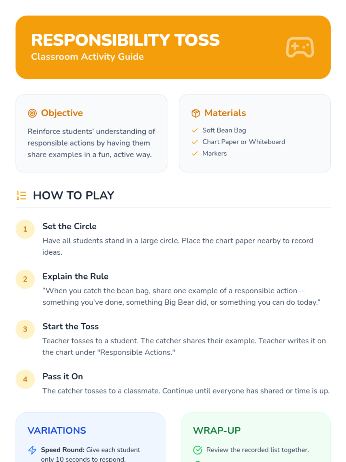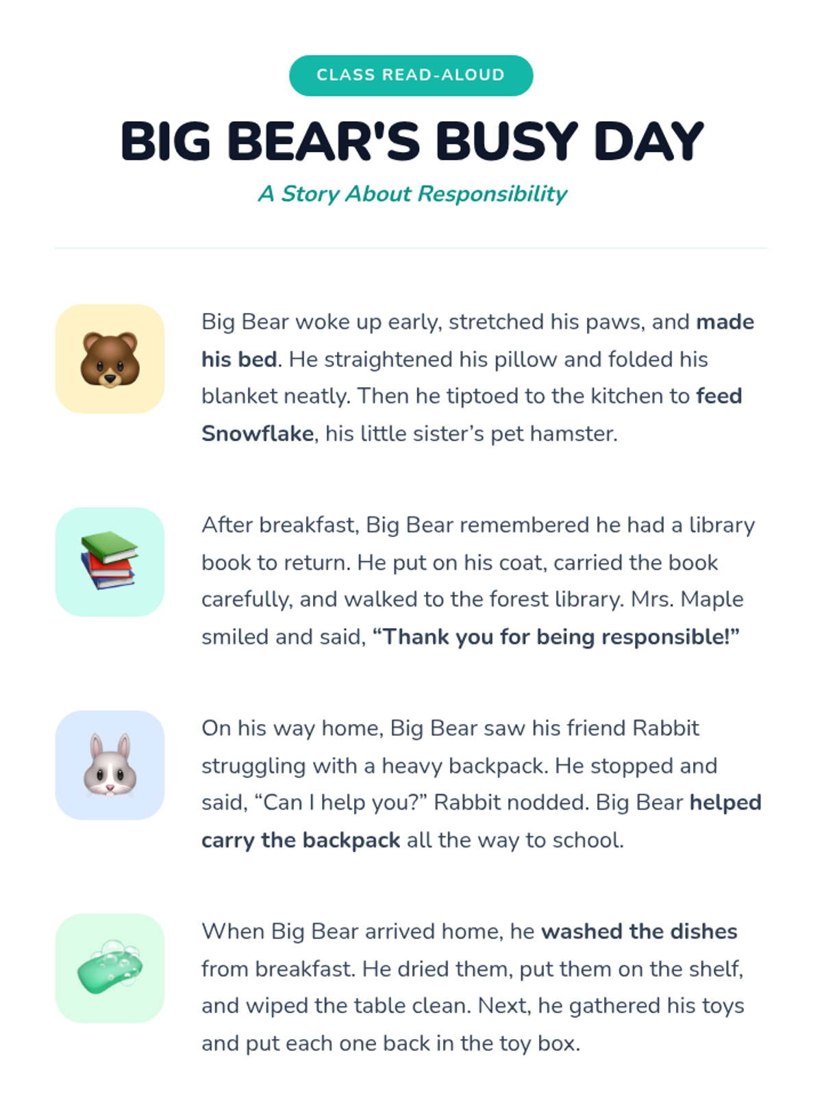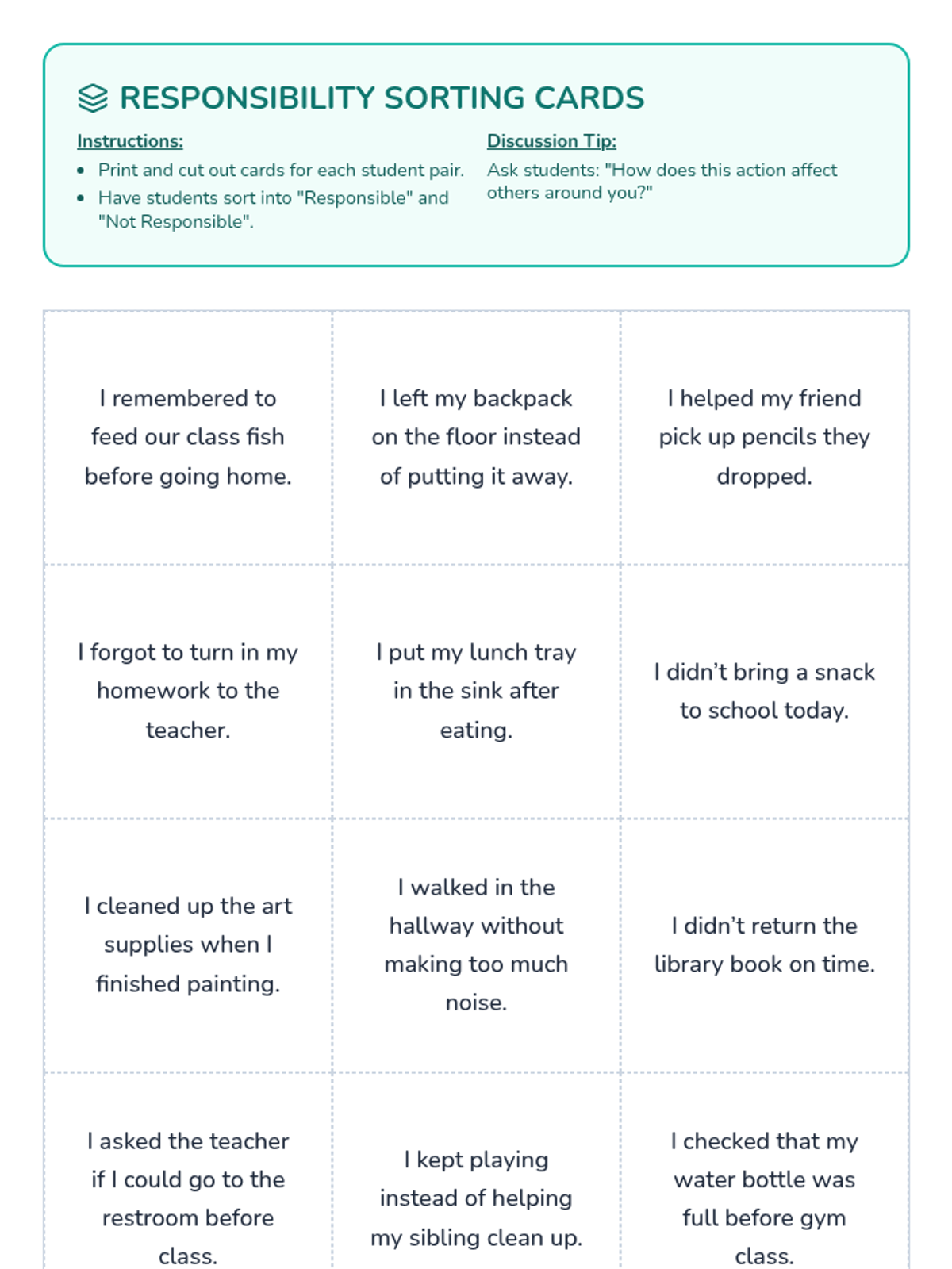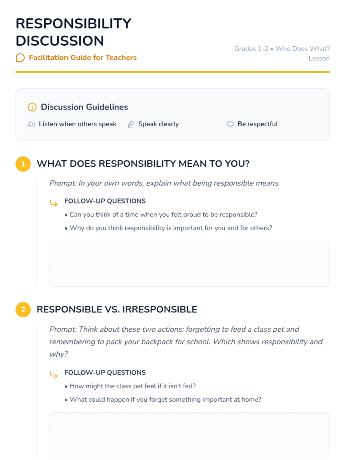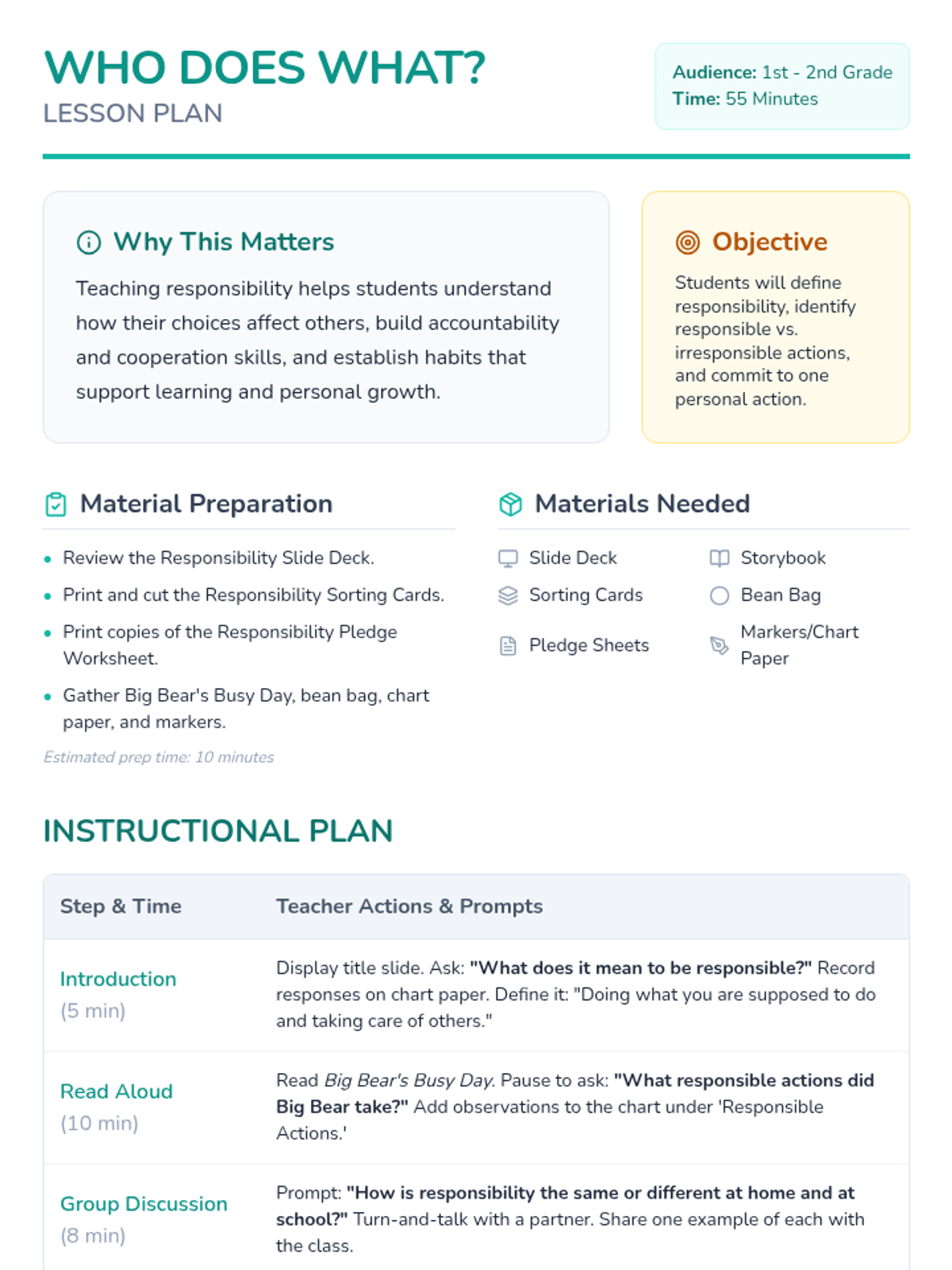 In this 55-minute lesson for grades 1-2, students explore responsibility at home and school through a story, discussion, sorting activity, and a personal pledge.