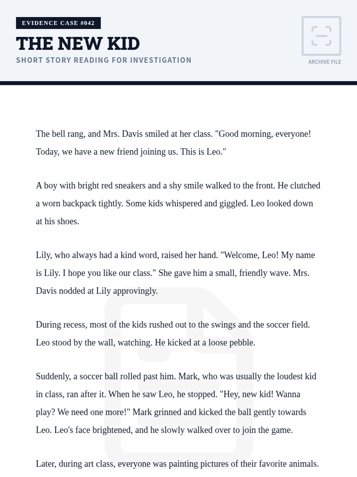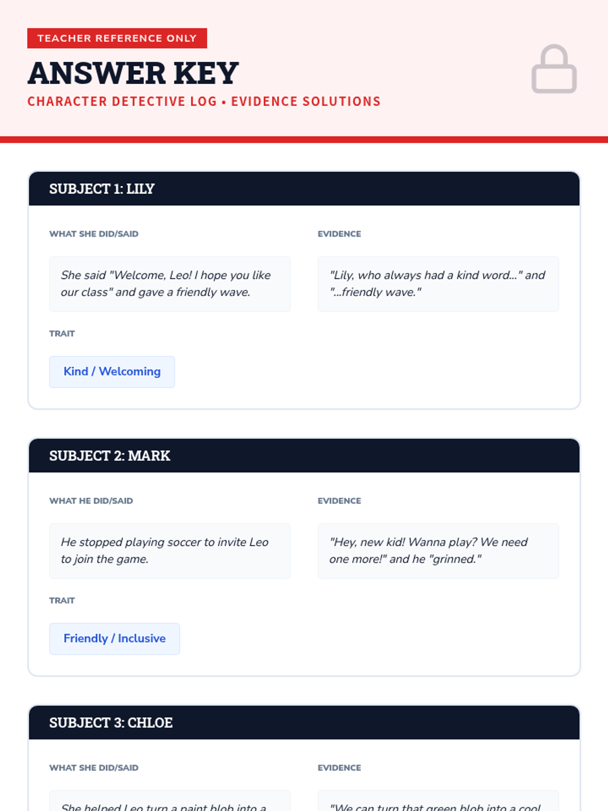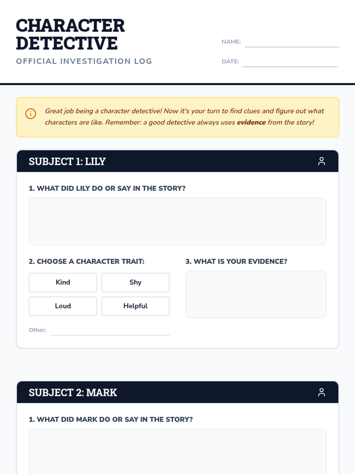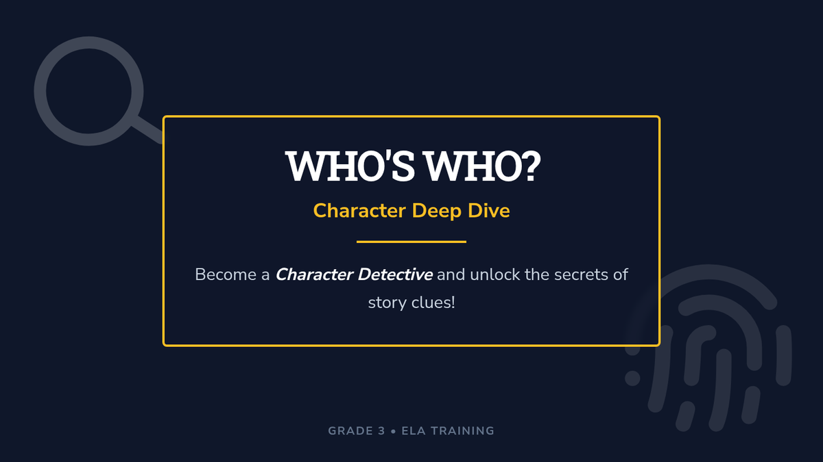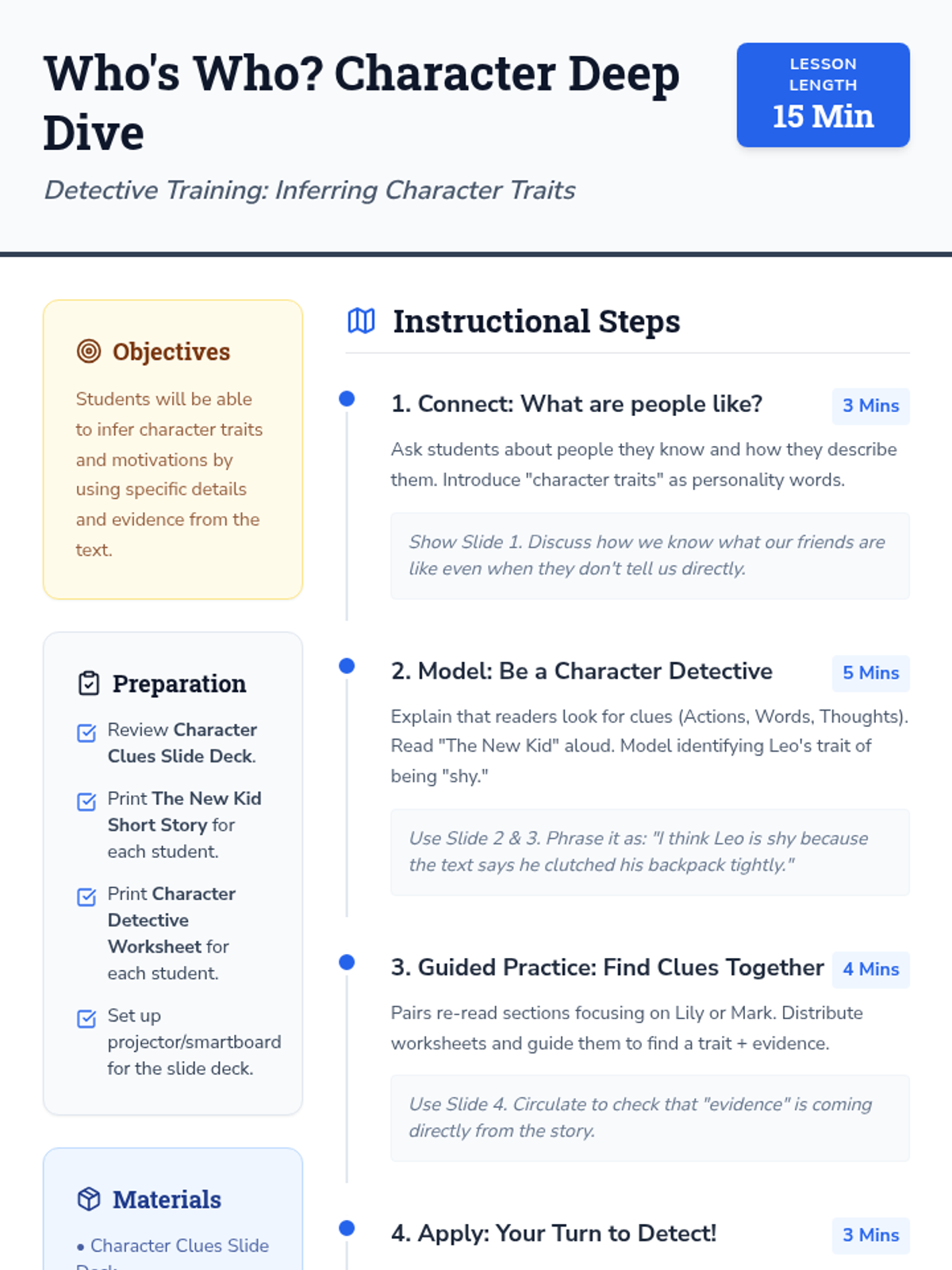 A 15-minute 3rd-grade lesson where students act as 'character detectives' to infer traits and motivations using text evidence from a short story.