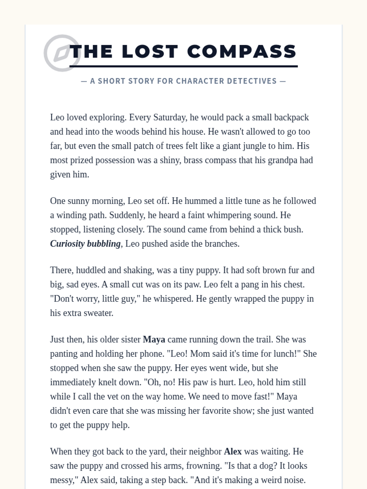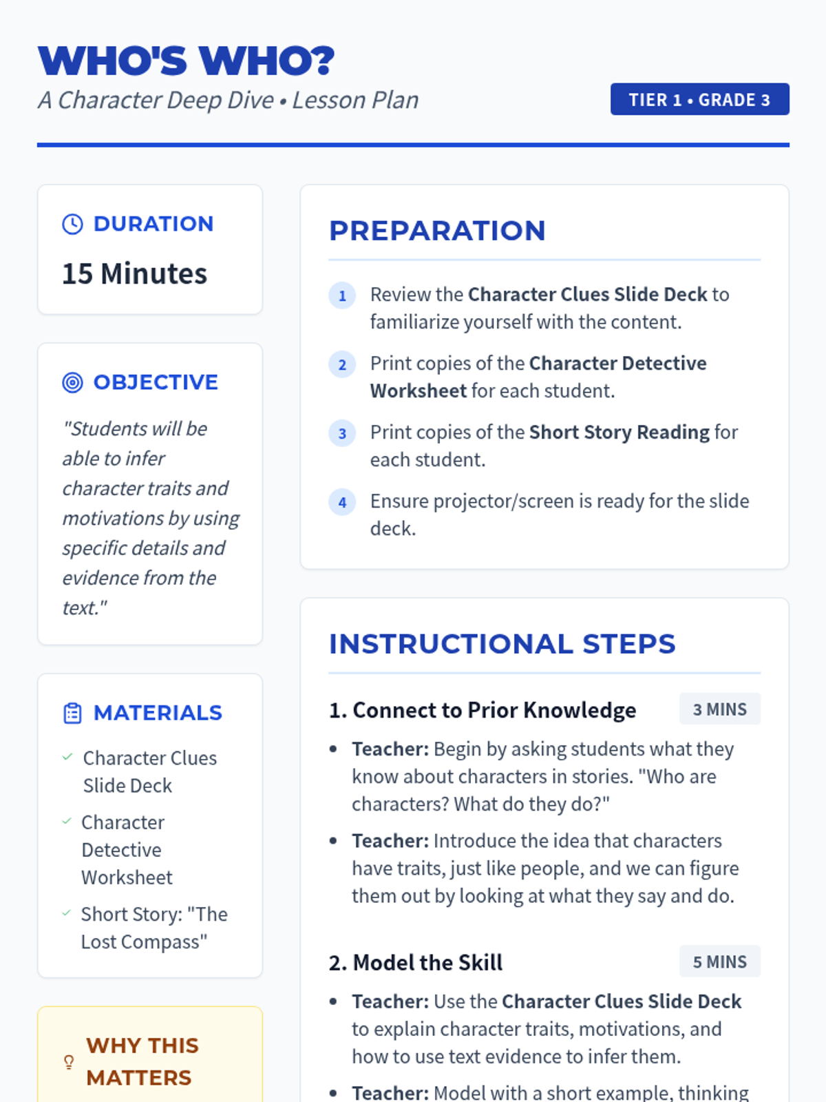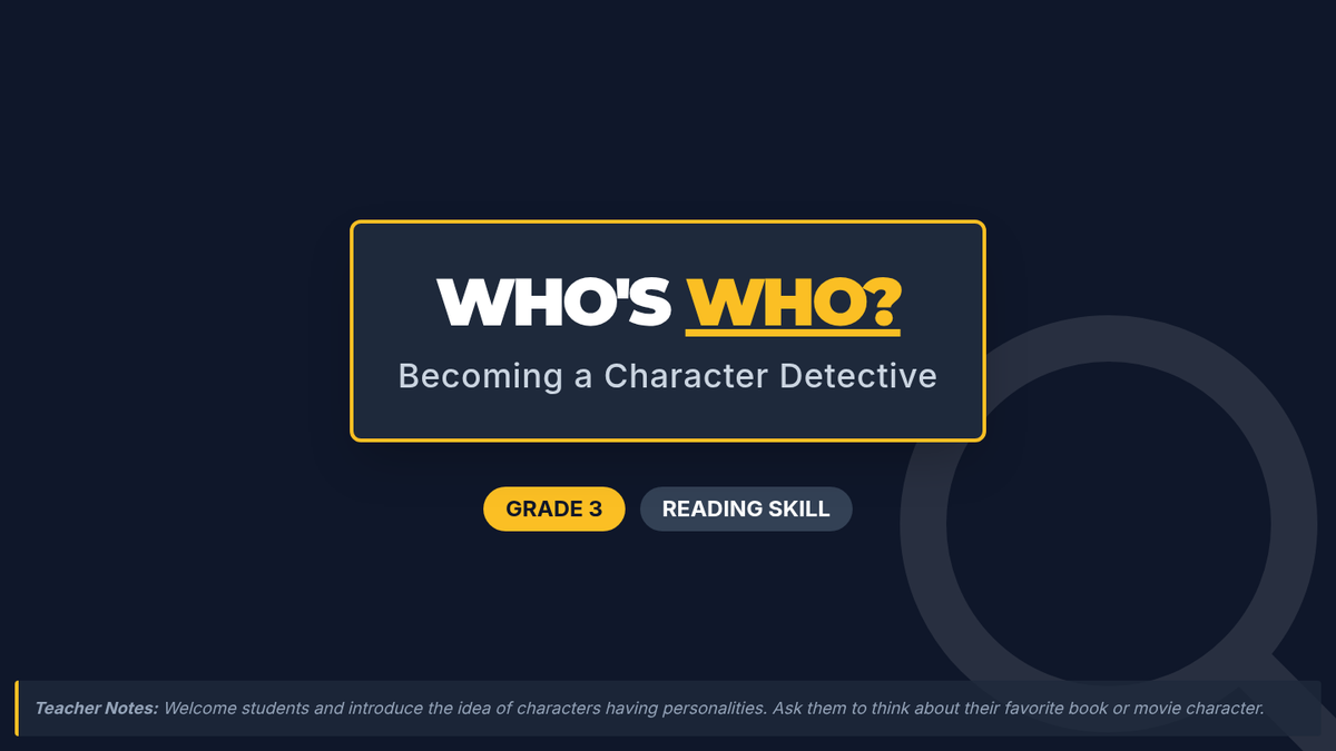 This lesson helps 3rd-grade students become character detectives by learning to infer traits and motivations using text evidence. Students will explore a short story to find clues about what characters say and do.