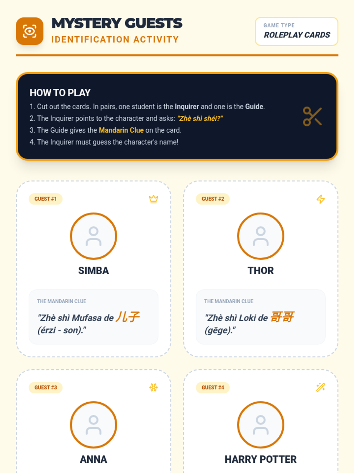 Students practice asking and answering 'Who is this?' using family vocabulary, culminating in a 'Mystery Guest' identification game.