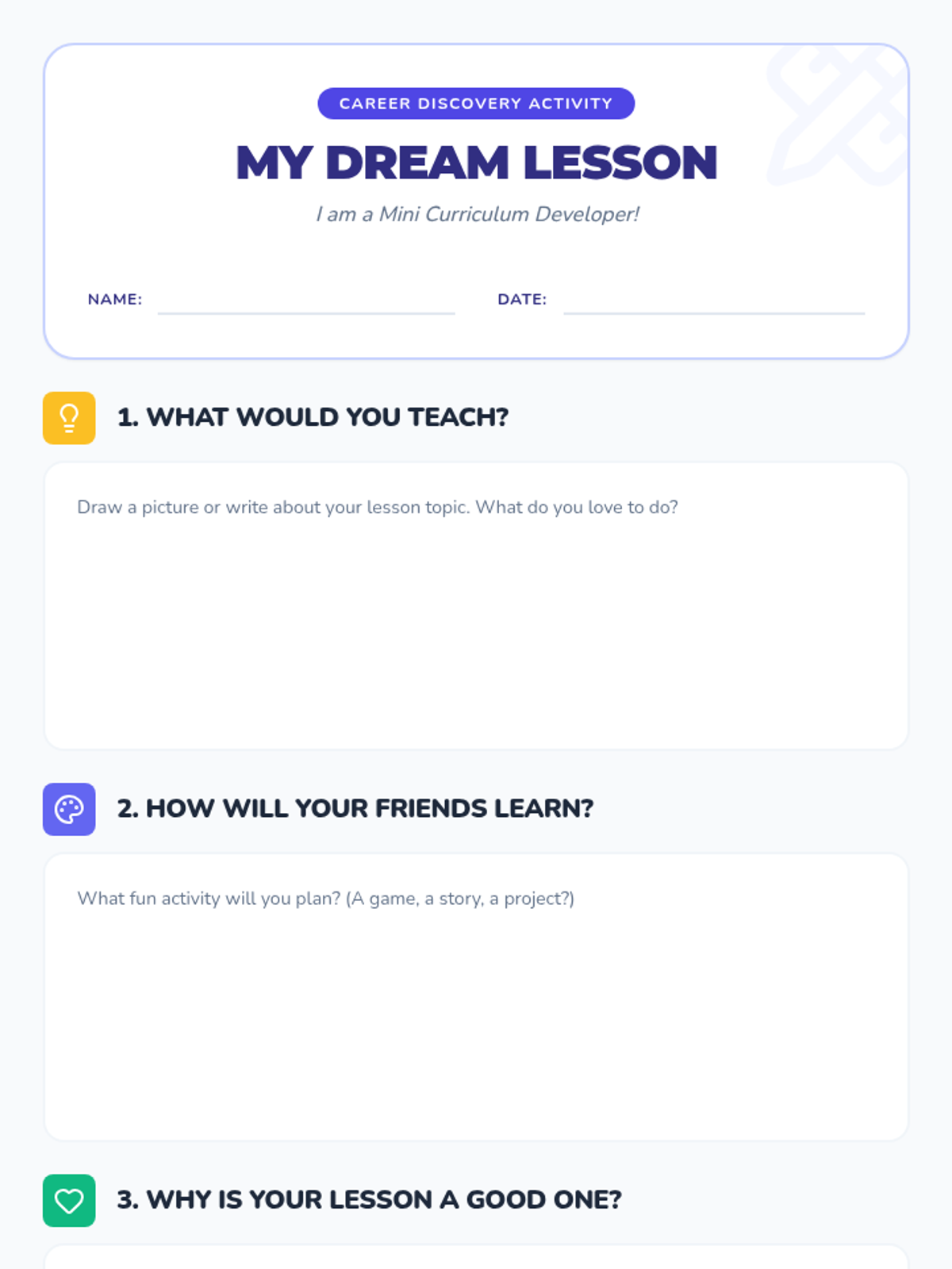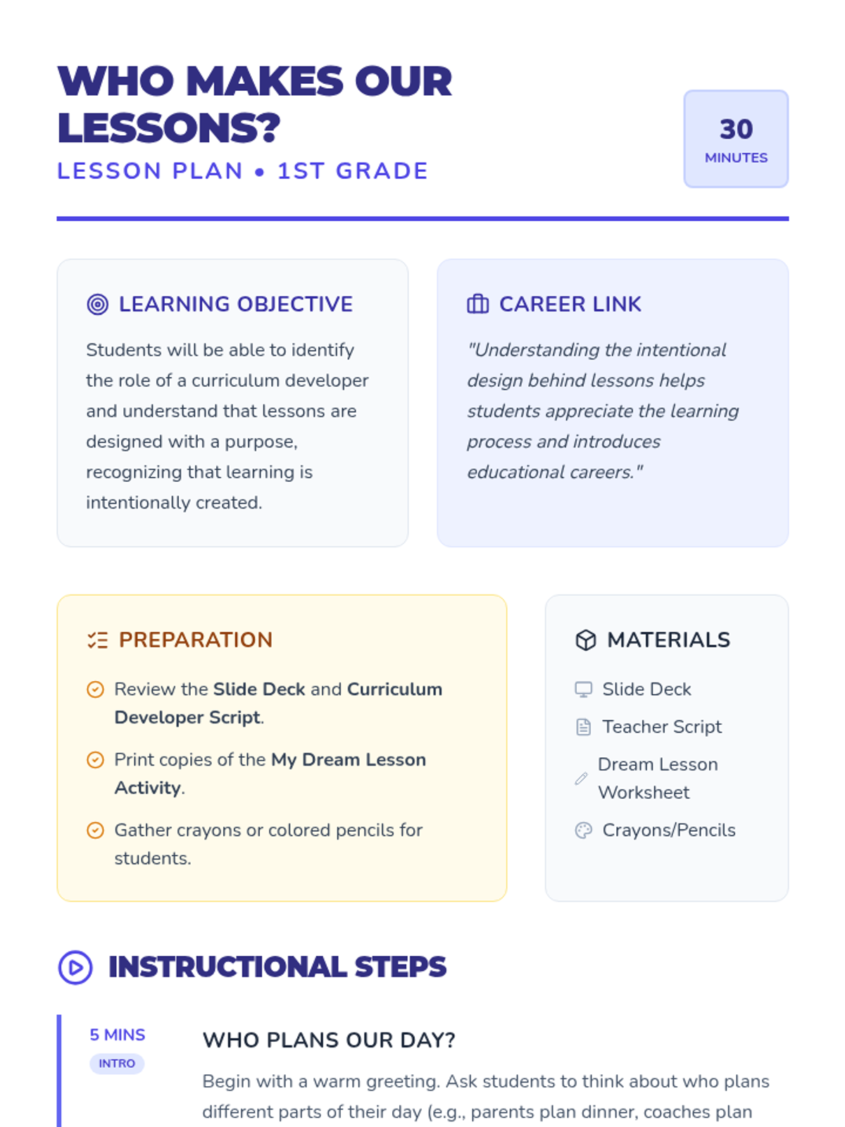 This lesson introduces 1st-grade students to the role of a curriculum developer, helping them understand that school lessons are intentionally designed to be fun and educational. Students will explore the design process and create their own 'dream lesson' as mini curriculum developers.